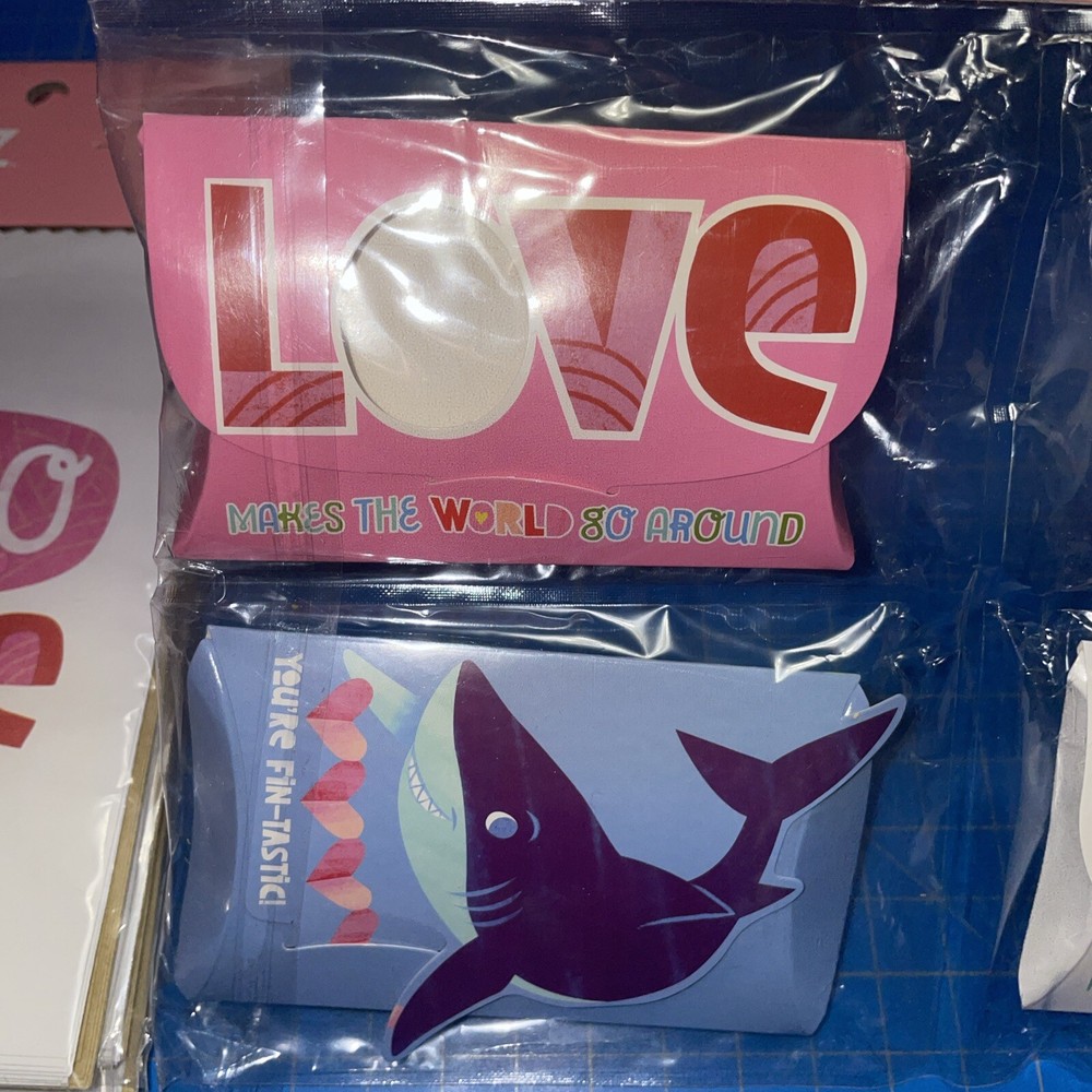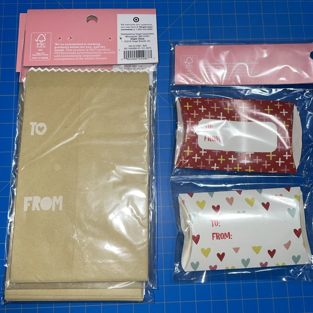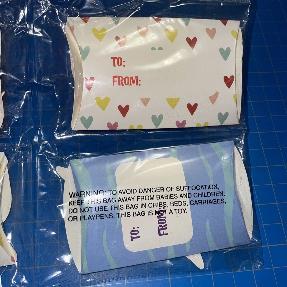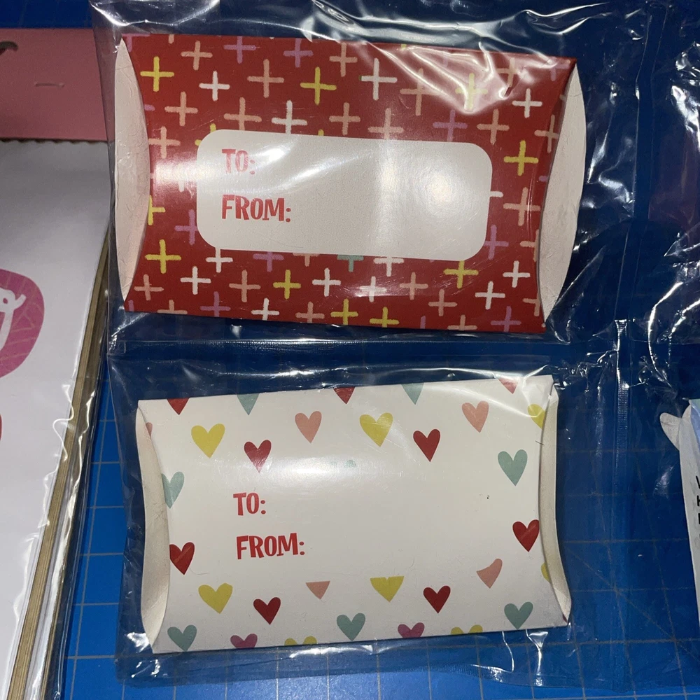 Four packages of 16 ‘Hello Love’ gift bags. Size approx 7 x 4in One package of four favor boxes. Size approx 4 x 2 in Some damage to boxes (wrinkles folds, slight crushing)