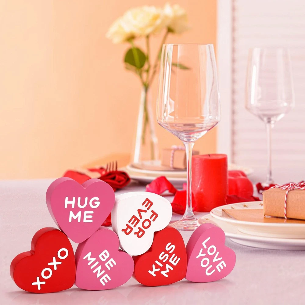Complete Valentine's Set: Unbox 6 beautifully crafted wooden heart decor pieces that bring a warm, romantic touch to your Valentine's Day celebration Romantic Heart Design: Featuring classic heart shapes in pink, red, and white, each heart is adorned with heartfelt phrases like "XOXO," "HUG ME," "BE MINE," and "LOVE YOU" for a truly romantic atmosphere Premium Craftsmanship: Made from high-quality, durable wood with a smooth finish, these pieces are expertly painted in vibrant, fade-resistant colors. Safe, long-lasting, and perfect for creating an elegant vibe Perfect Dimensions: Each heart measures 3" x 2.8" x 0.6", making them ideal for decorating fireplaces, coffee tables, bookshelves, or tiered trays. Compact yet eye-catching for any space. Versatile Valentine's Decor: Perfect for Valentine's Day, weddings, anniversaries, or parties. These heart-shaped centerpieces add a loving touch that’s sure to surprise and delight your loved ones.