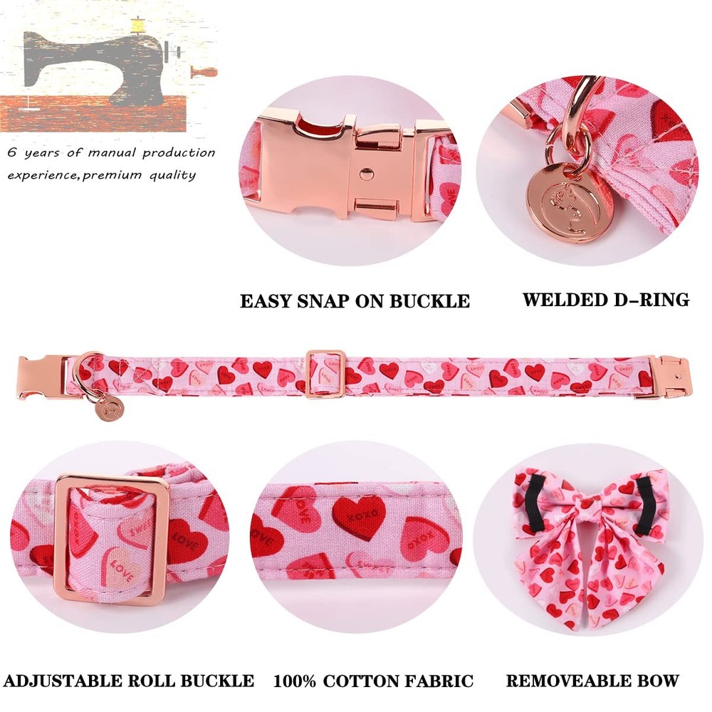 dog collar [ Perfect Fit for All Dogs ] Our puppy collar is available in 5 sizes, ensuring a comfortable fit for large, medium, and small dogs. The adjustable metal buckle allows for easy size modifications to accommodate your pup's growth. [ Conveniently Removable Bow/Flower Tie ] Customize your dog's look with a detachable bow or flower tie! The tie boasts elastic bands, allowing for easy attachment to any collar. creative and design a unique collar for your furry friend! [ High-Quality Material ] Our dog collar is made of pure cotton that is gentle on your pet's skin. Its durable metal thick welded D-ring adds to its longevity. We strengthen all the points with double stitching for extra reinforcement. Please hand wash to protect the metal from scratches. [ Unique Valentine's Design ] Make your furry friend stand out with this charming pink heart dog collar. Featuring a delightful heart pattern, this collar is the perfect accessory for Valentine's or any special occasion. [ UNBEATABLE ] Experience exceptional with our responsive team ready to provide prompt solutions for any of your concerns or issues with your purchase. Trust to deliver the best possible within just 24 hours.