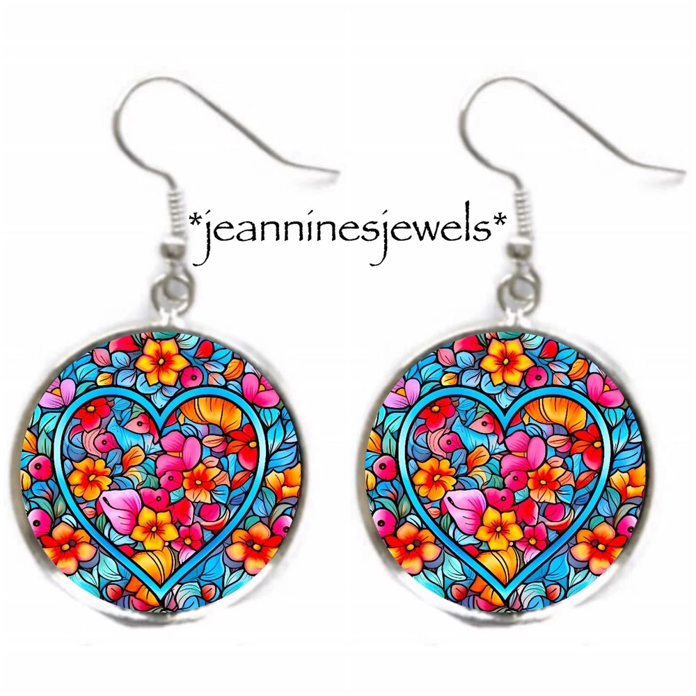 Valentines Heart Flowers Faux Stained Glass Art Print Silver Dangle EARRINGS