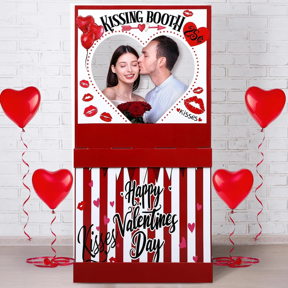 Features: Fandom Outlet with a Romantic Twist Our kissing booth sign satisfies fandom enthusiasts with its photo-realistic design and quality build. Whether it's for a romantic Valentine's day setup or a striking display for carnivals, this Valentine's kissing booth stand is a charming addition to your décor. Artistry, Convenience, and Versatility, All in One Adding a beautiful combination of artistry, convenience, and versatility, our carnival ticket booth is a favorite among fans, marketers, and event planners. Its striking design and easy setup make it an effective tool for creating a uniquely engaging and romantic atmosphere. Specifications: Material: Cardboard Color: red and white Size: 54.33 x 28.35 x 12.99 Inches (H*D*W) Package includes: 1 PCS Cardboard Kissing Booth Stand Notes: Manual measurement, please allow slight errors on size. The color may exist a slight difference due to different screen displays. Valentine's Day Decorations: Experience Valentine's Day with our Cardboard Kissing Booth stand. With its vibrant red and white hues, this one-of-a-kind decoration will instantly make your celebration more romantic. Its cute and playful design will beautifully capture the essence of the occasion, making this kissing booth the heart of your party Impressive Size: Our Valentine's Day Cardboard Stand Decoration takes pride in its large size, measuring approximately 54.33 x 28.35 x 12.99 inches. This kissing booth is designed to capture attention even from afar, ensuring that your display will be noticed Easy Setup and Stability: Our kissing booth prop is skillfully cut to provide a 3D effect, presenting a visual appeal for your celebration. It's straightforward to assemble, backed with strong cardboard for support. Plus, it comes with a water-filled weight bag to keep your kissing booth stand secure and stable against wind and crowds Photo Prop: This kissing booth stand is not just a decoration but a nice photo prop as well. It provides an ideal setting for capturing unforgettable moments on Valentine's Day. Share your sweet memories on social media, letting your friends, family, and even customers see the fun and love shared on the day Portable Decoration for Any Occasion: Our lightweight and easy-to-move cardboard kissing booth stand fits effortlessly into any space. It's not only suitable for Valentine's Day but also an excellent choice for carnivals and ticket booth prop. It's a favorite among event planners for its versatility in doubling as displays and point-of-sale marketing tools