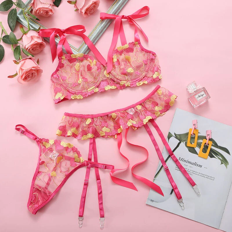 NEW Sexy Gauze Sleeves Off Shoulder Lingerie Set Hollow Out Garters Bra G-string
