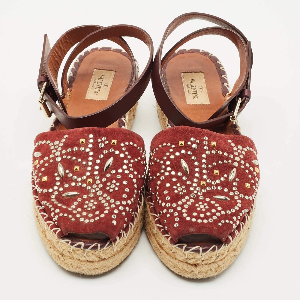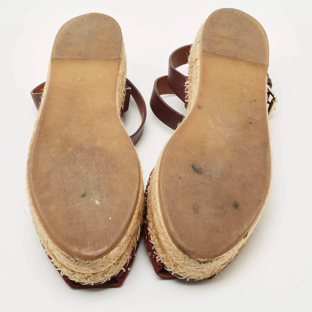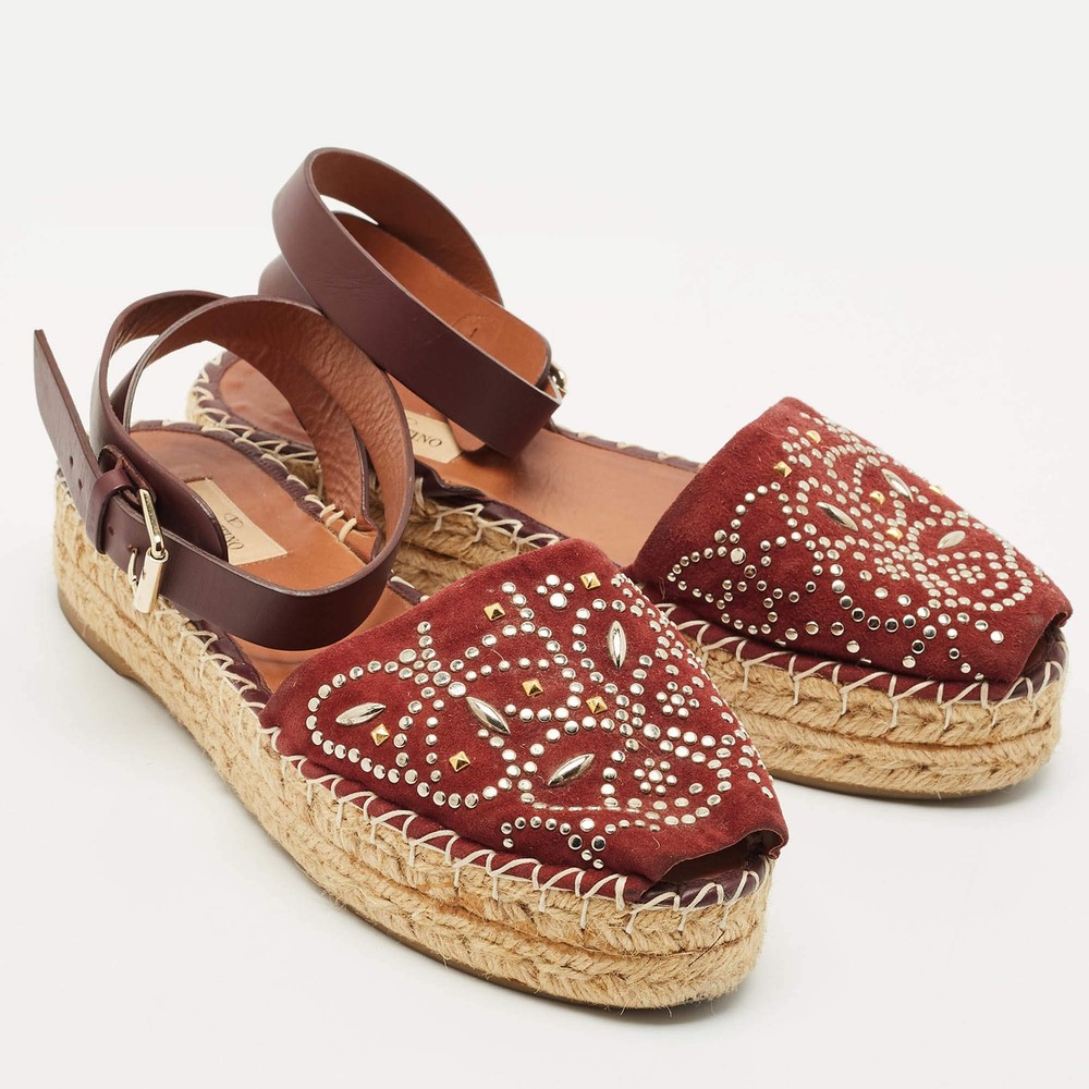 Our eBay Store About Us Contact Us Add to Favorite Sellers Valentino Burgundy Embellished Suede and Leather Ankle Strap Espadrille Flats These Valentino espadrilles marry soft burgundy suede with gold embellishments and rustic jute soles. A luxe reimagination of bohemian summer footwear. Product Details Brand Valentino Color Burgundy Includes The Luxury Closet Packaging Outsole Length 25.5 cm Outsole Width 8.5 cm Size 39 Certified by The Luxury Closet This item has gone through a detailed authentication process overseen by our experts. We offer a lifetime guarantee of authenticity on all our items. How We Check The in-house team of experts at The Luxury Closet is highly trained to verify the authenticity and the condition of the luxury products. They ensure that only 100% authentic items are put on sale.The evaluation process is unique with its own mix of assessment criteria and differs according to the category. Each item is evaluated based on the following combination of hallmarks, hardware, stitching, symmetry, material, craftsmanship, stamping, codes, hologram stickers, and packaging. Our authenticators also check if the items have been modified or amended (e.g., aftermarket diamonds, replaced batteries, repaired bags, etc.) International Buyers Import duties, taxes and charges are not included in the item price. These charges are the buyers responsibility. Please check with your country’s customs office to determine what these additional cost will be prior to buying.