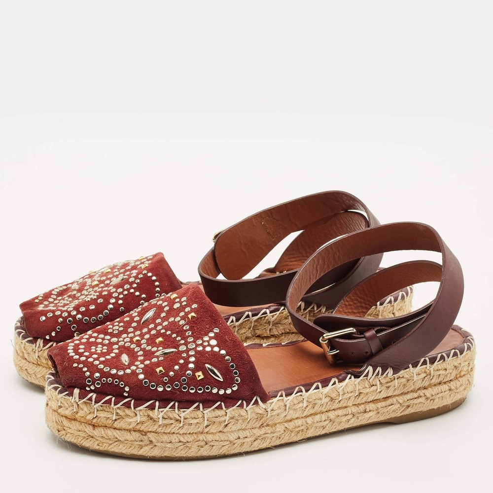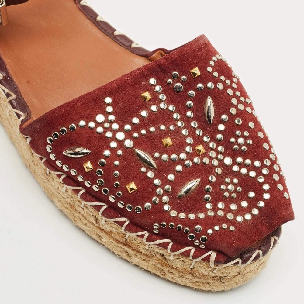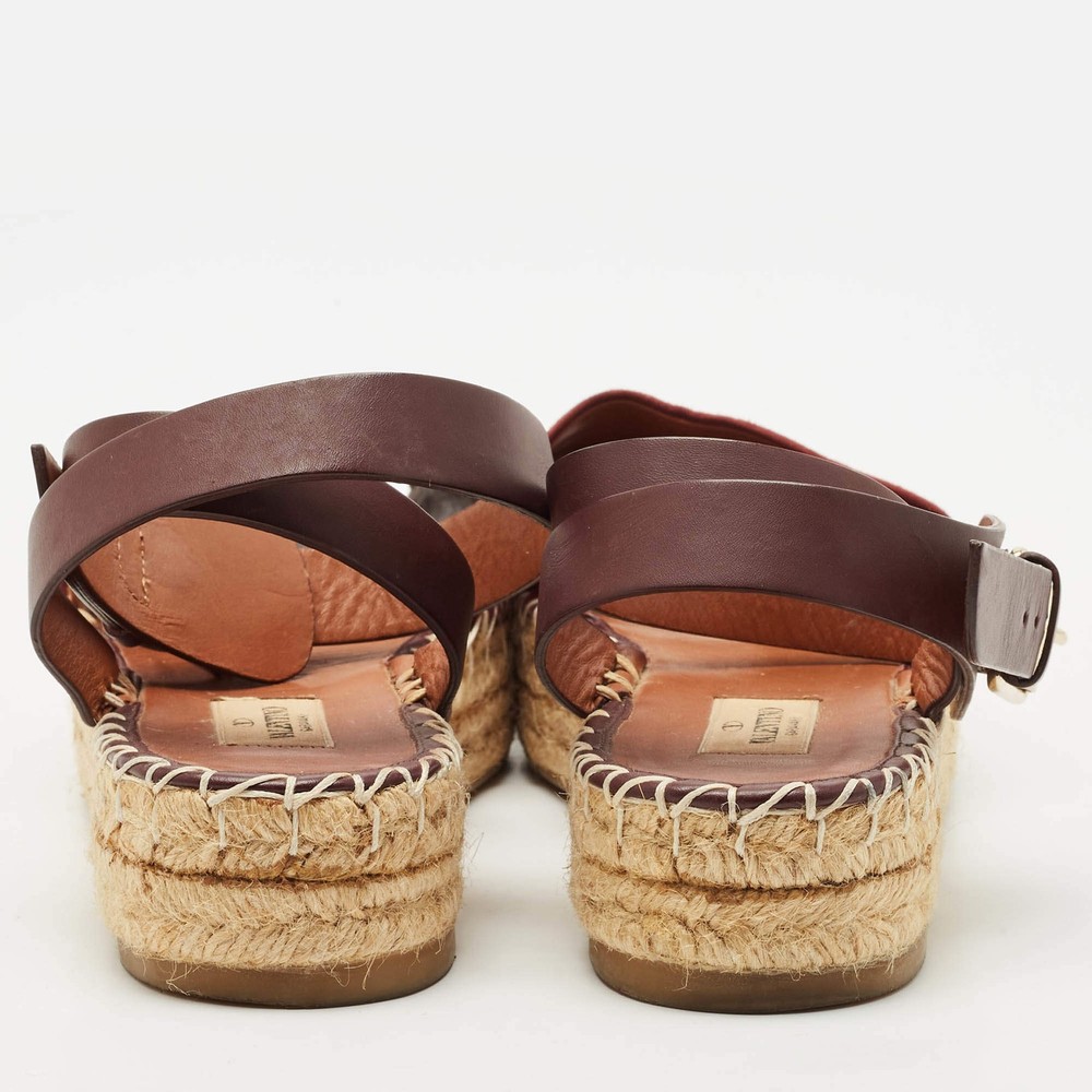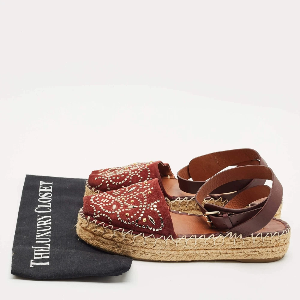Our eBay Store About Us Contact Us Add to Favorite Sellers Valentino Burgundy Embellished Suede and Leather Ankle Strap Espadrille Flats These Valentino espadrilles marry soft burgundy suede with gold embellishments and rustic jute soles. A luxe reimagination of bohemian summer footwear. Product Details Brand Valentino Color Burgundy Includes The Luxury Closet Packaging Outsole Length 25.5 cm Outsole Width 8.5 cm Size 39 Certified by The Luxury Closet This item has gone through a detailed authentication process overseen by our experts. We offer a lifetime guarantee of authenticity on all our items. How We Check The in-house team of experts at The Luxury Closet is highly trained to verify the authenticity and the condition of the luxury products. They ensure that only 100% authentic items are put on sale.The evaluation process is unique with its own mix of assessment criteria and differs according to the category. Each item is evaluated based on the following combination of hallmarks, hardware, stitching, symmetry, material, craftsmanship, stamping, codes, hologram stickers, and packaging. Our authenticators also check if the items have been modified or amended (e.g., aftermarket diamonds, replaced batteries, repaired bags, etc.) International Buyers Import duties, taxes and charges are not included in the item price. These charges are the buyers responsibility. Please check with your country’s customs office to determine what these additional cost will be prior to buying.