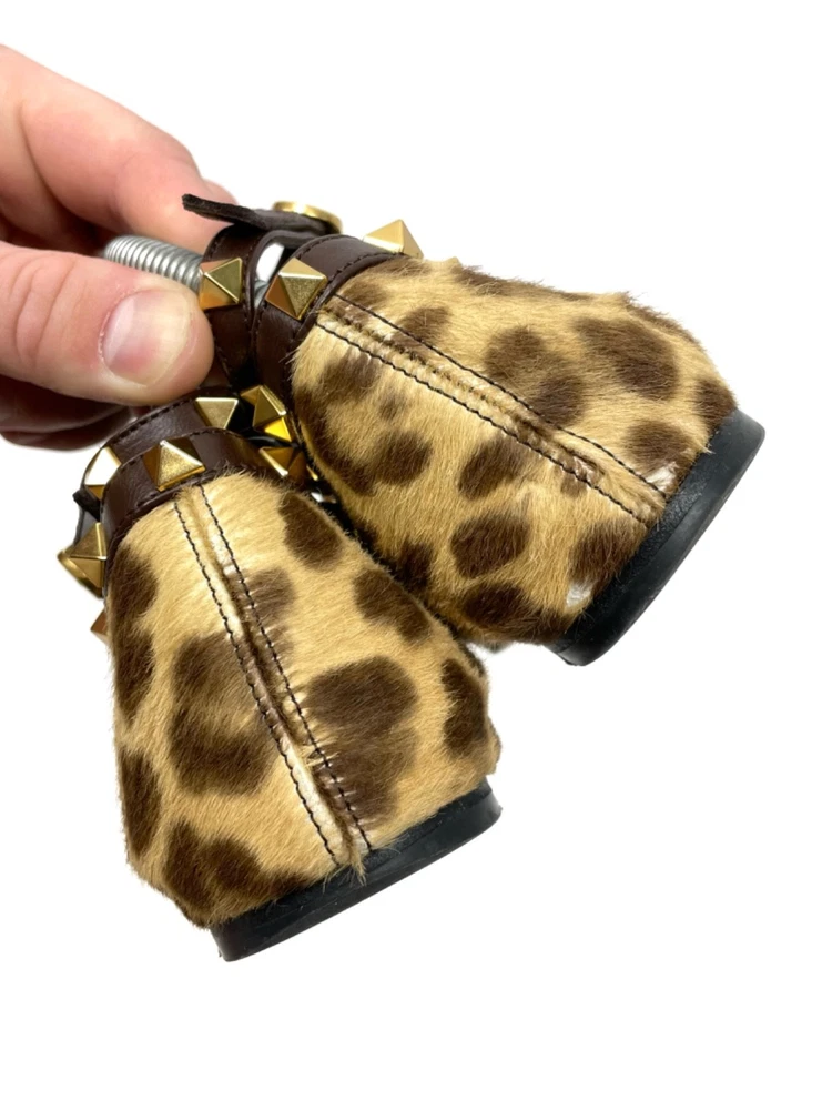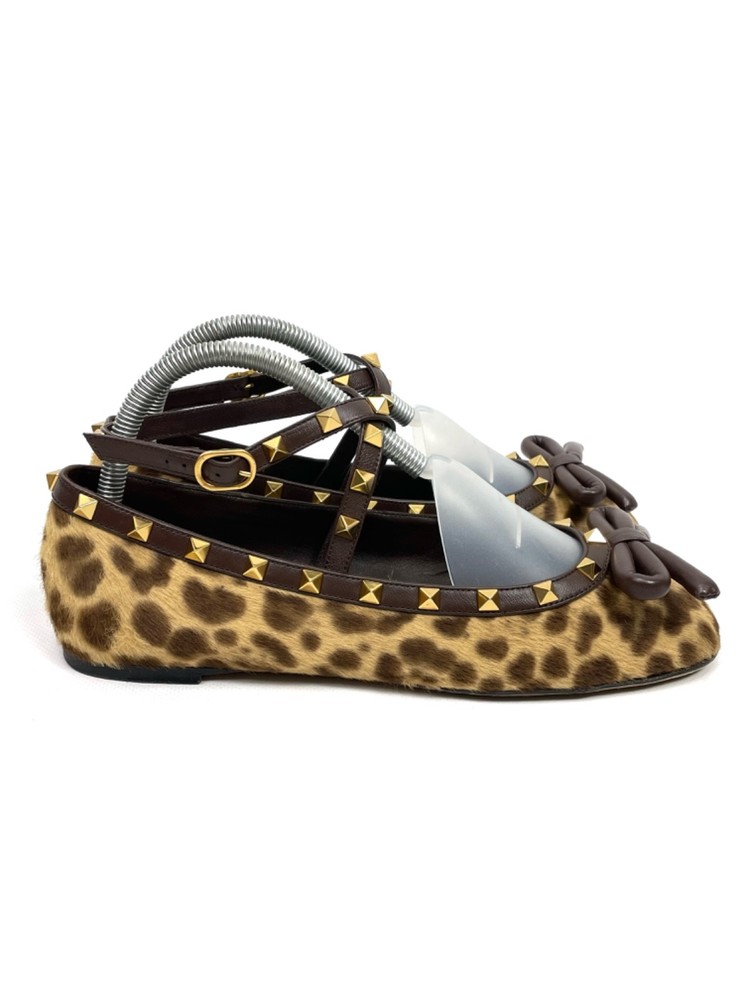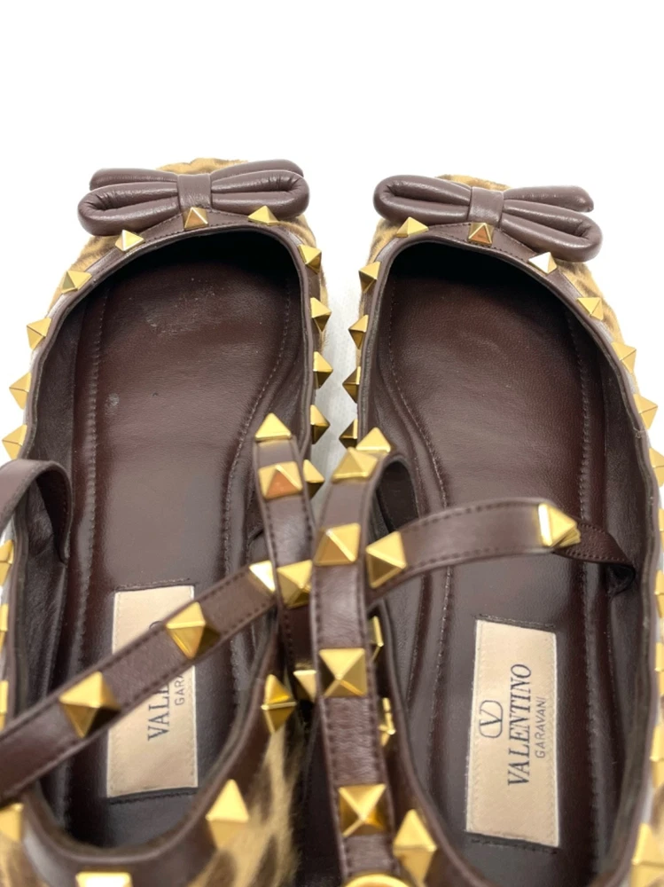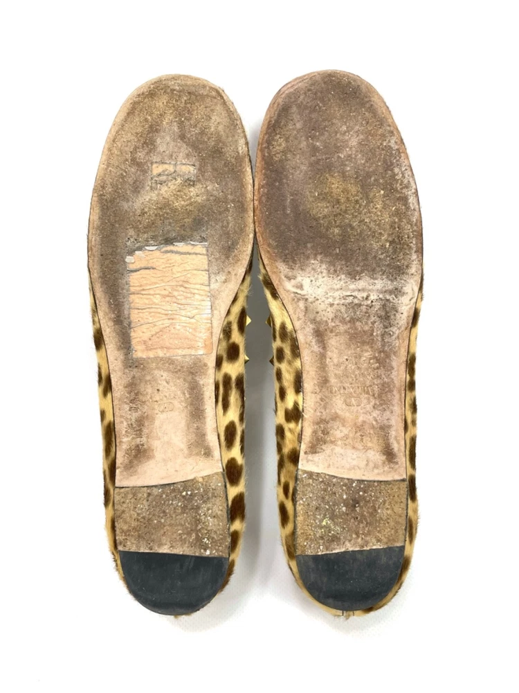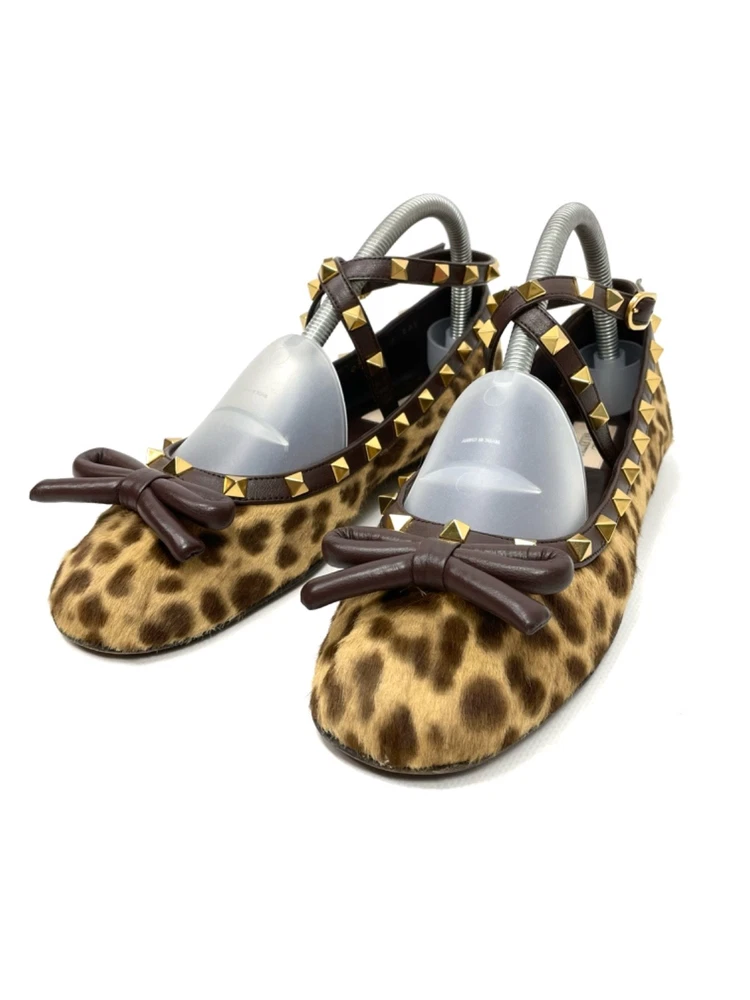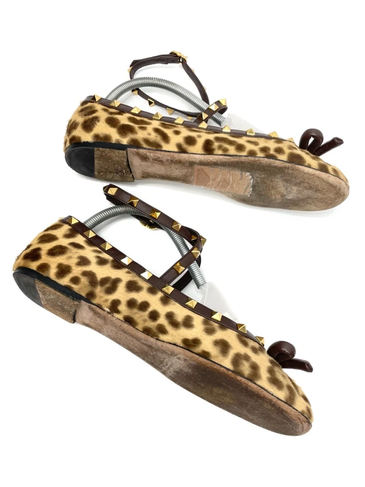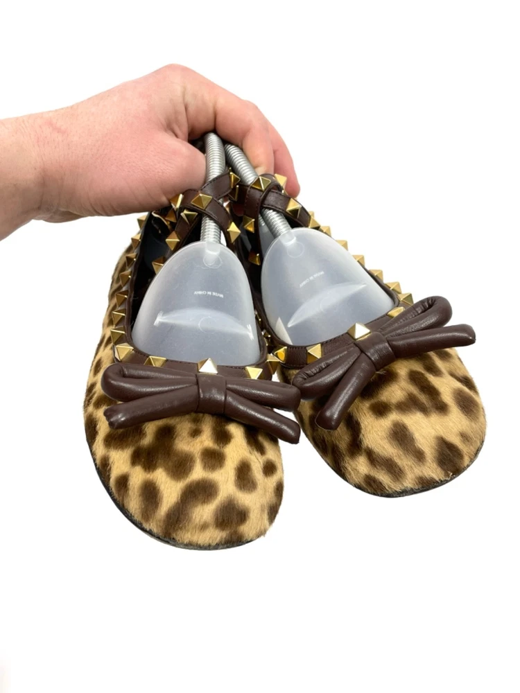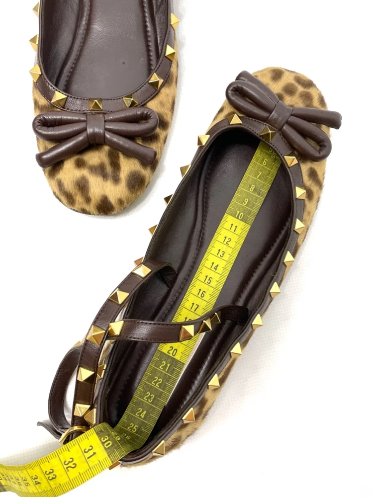 Valentino Garavani Rockstud Pony Hair Ballet Flats – Leopard – Size IT 39.5 – Made in Italy – Good Condition Iconic Valentino Garavani Rockstud ballet flats crafted from luxurious leopard-print pony hair with signature brown leather trim and gold-tone pyramid studs. This elegant yet edgy design perfectly reflects Valentino’s recognizable Rockstud aesthetic, combining feminine detailing with bold luxury styling. The flats feature a classic ballet silhouette with a delicate bow at the toe and an adjustable ankle strap for a secure and refined fit. A timeless designer footwear piece that easily elevates both casual and dressy outfits. ⸻ Details: • Brand: Valentino Garavani • Item: Rockstud Pony Hair Ballet Flats • Size: IT 39.5 (please check measurements) • Color: Leopard Print / Brown Leather / Gold-tone Studs • Material / Fabric: Pony Hair Leather Upper with Leather Trim • Made in: Italy • Features: • Signature Valentino Rockstud pyramid studs • Luxurious leopard pony hair upper • Feminine bow detail at toe • Adjustable ankle strap closure • Classic ballet flat silhouette • Condition: Good pre-owned condition — previously worn with normal signs of careful use (see photos) ⸻ Measurements (approx.): • Insole Length: approx. 25 cm Please check measurements before purchasing. ⸻ Shipping Information: • Carrier: Ukrposhta (Ukrainian Postal Service) • Handling Time: Ships within 1 business day • Delivery Estimates: • USA & Europe: 10–21 business days • Worldwide: 10–28 business days • Tracking number provided