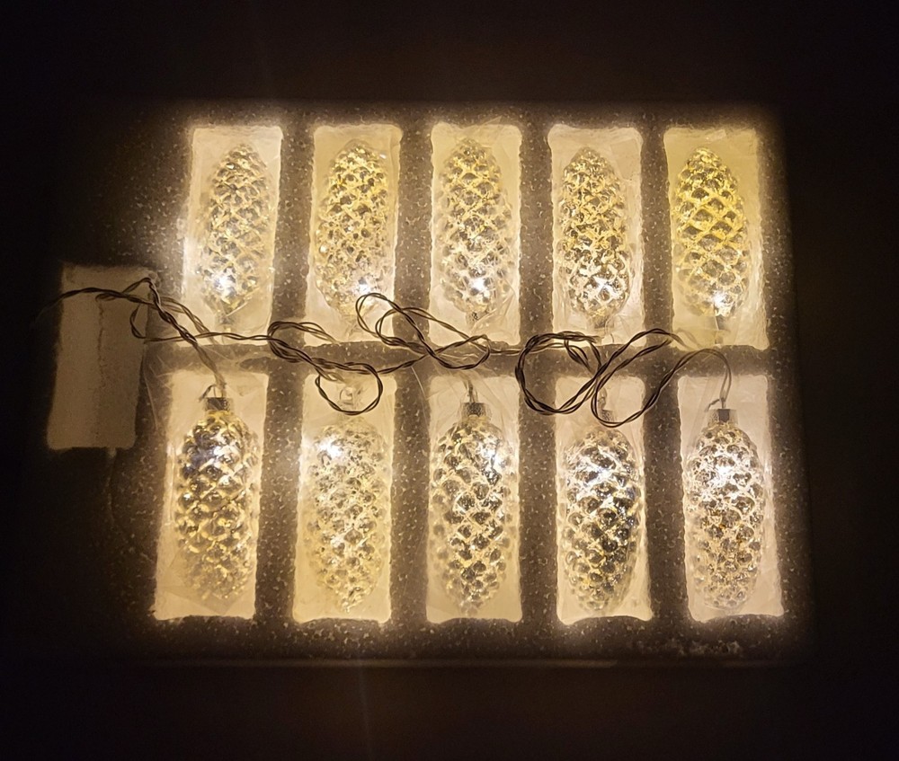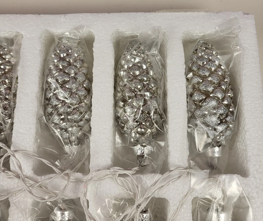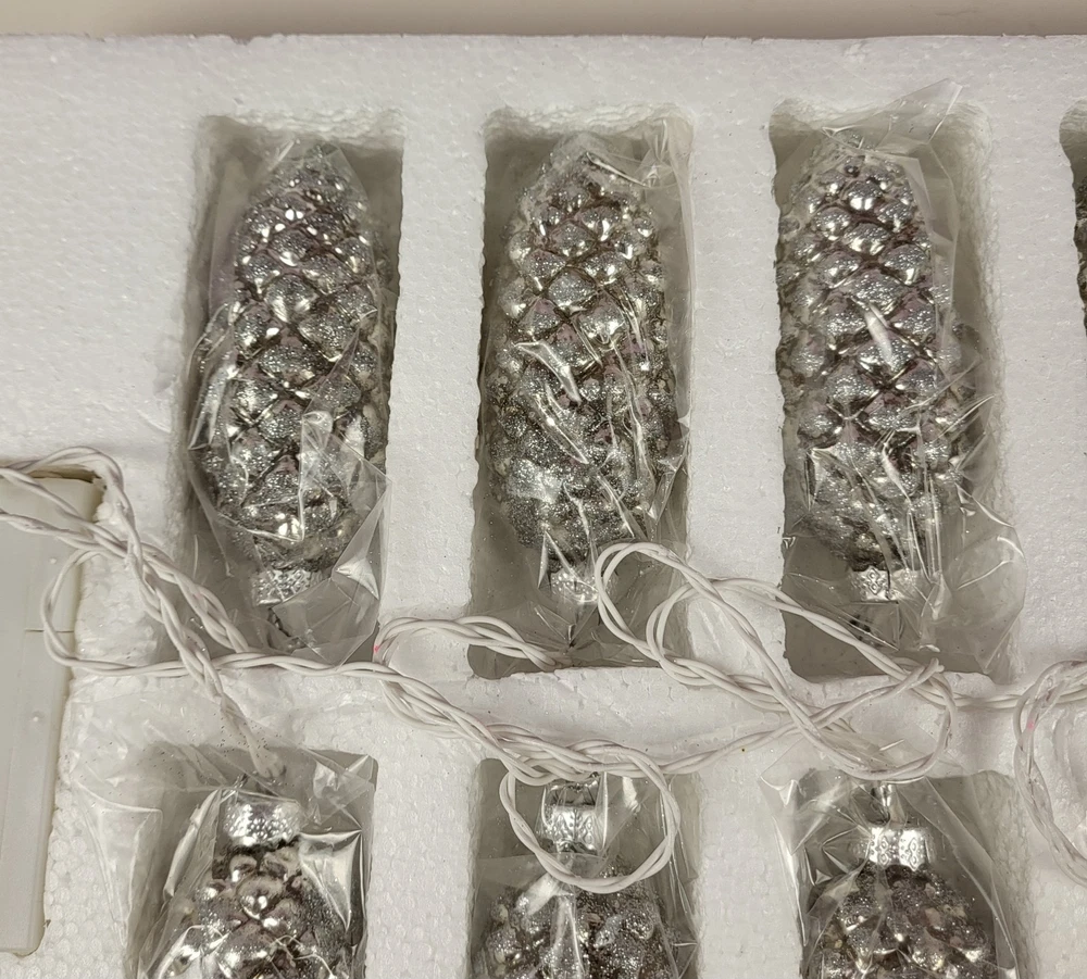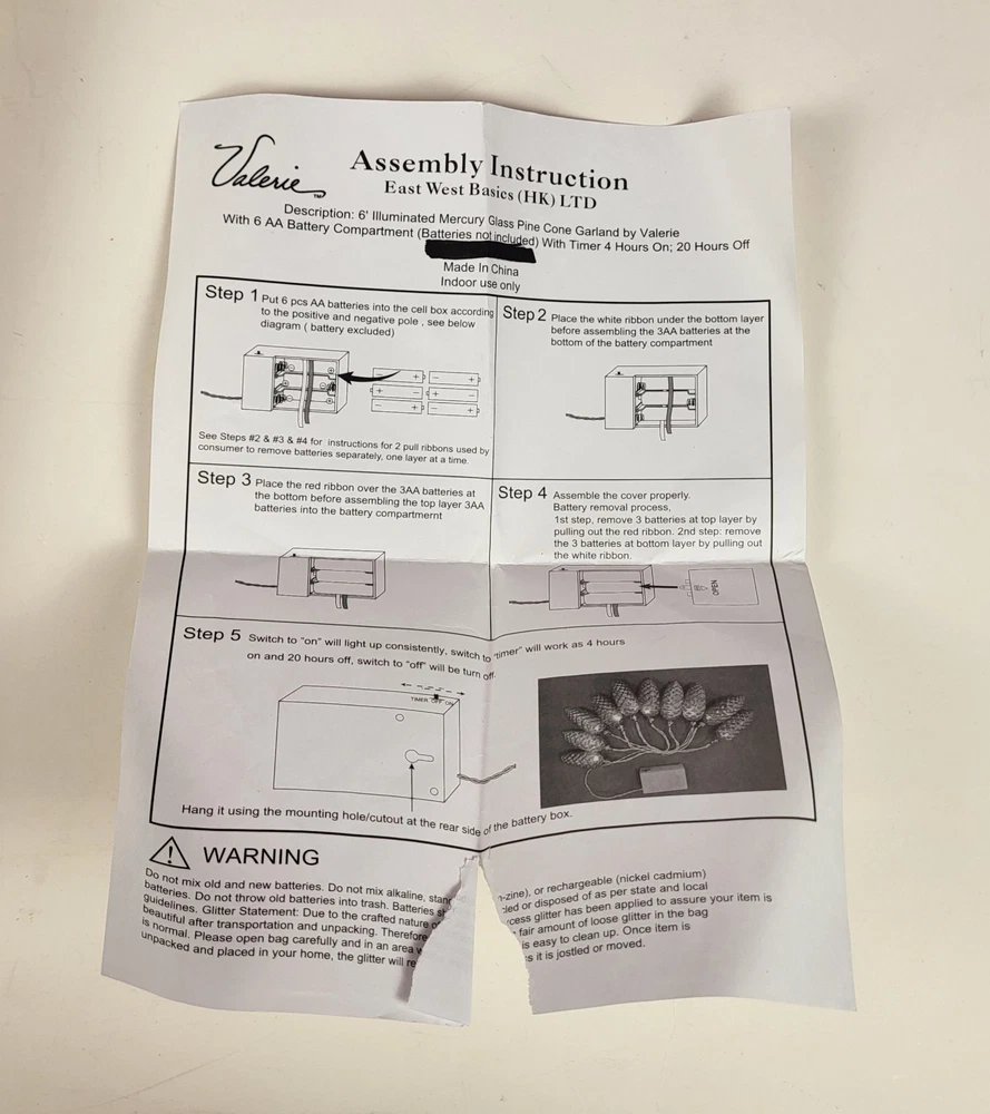Valerie Parr Hill Illuminated Mercury Glass 6' Pine Cone Light Strand Garland QVC Requires 6 AA batteries (batteries not included) The light strand garland is new and never used. The assembly instruction paper does have a small tear on the bottom as seen in photo 10. Please note: Due to the nature of the design and LED placement, slight variations in brightness may occur between bulbs — adding a cozy, organic feel to your lighting display