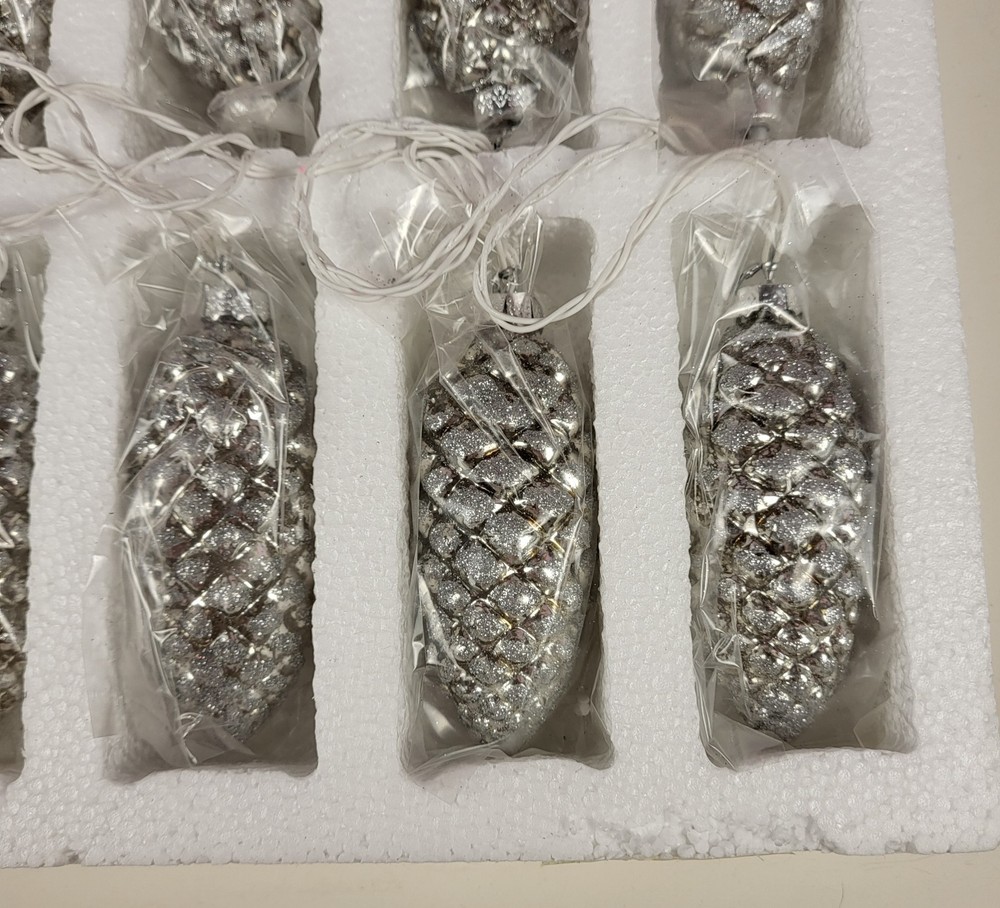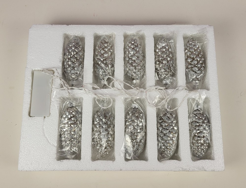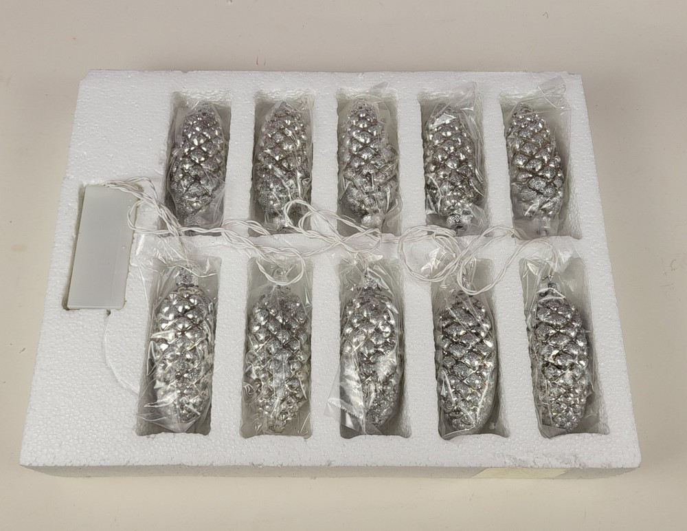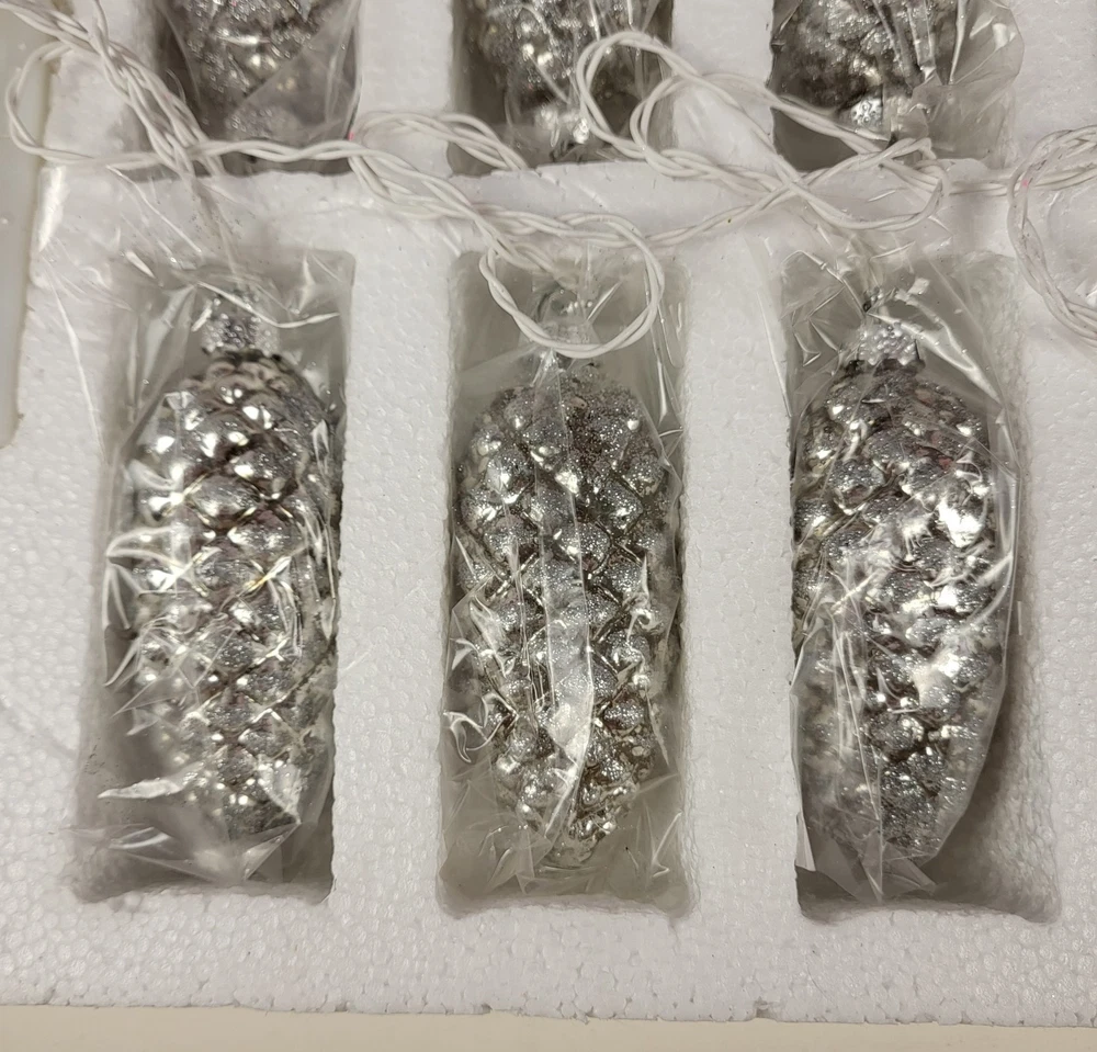 Valerie Parr Hill Illuminated Mercury Glass 6' Pine Cone Light Strand Garland QVC Requires 6 AA batteries (batteries not included) The light strand garland is new and never used. The assembly instruction paper does have a small tear on the bottom as seen in photo 10. Please note: Due to the nature of the design and LED placement, slight variations in brightness may occur between bulbs — adding a cozy, organic feel to your lighting display