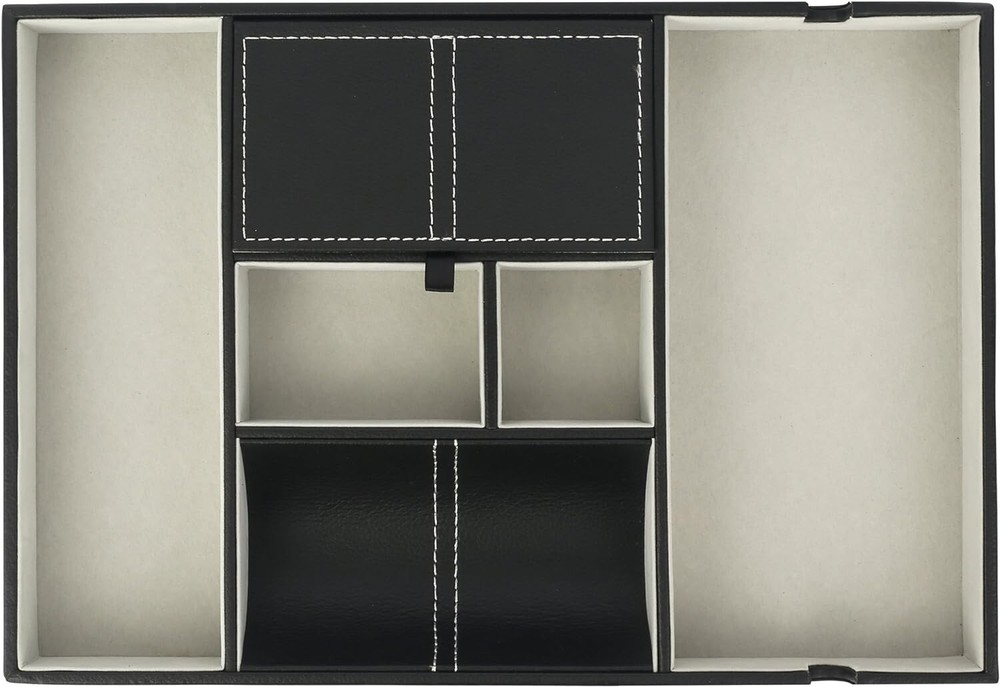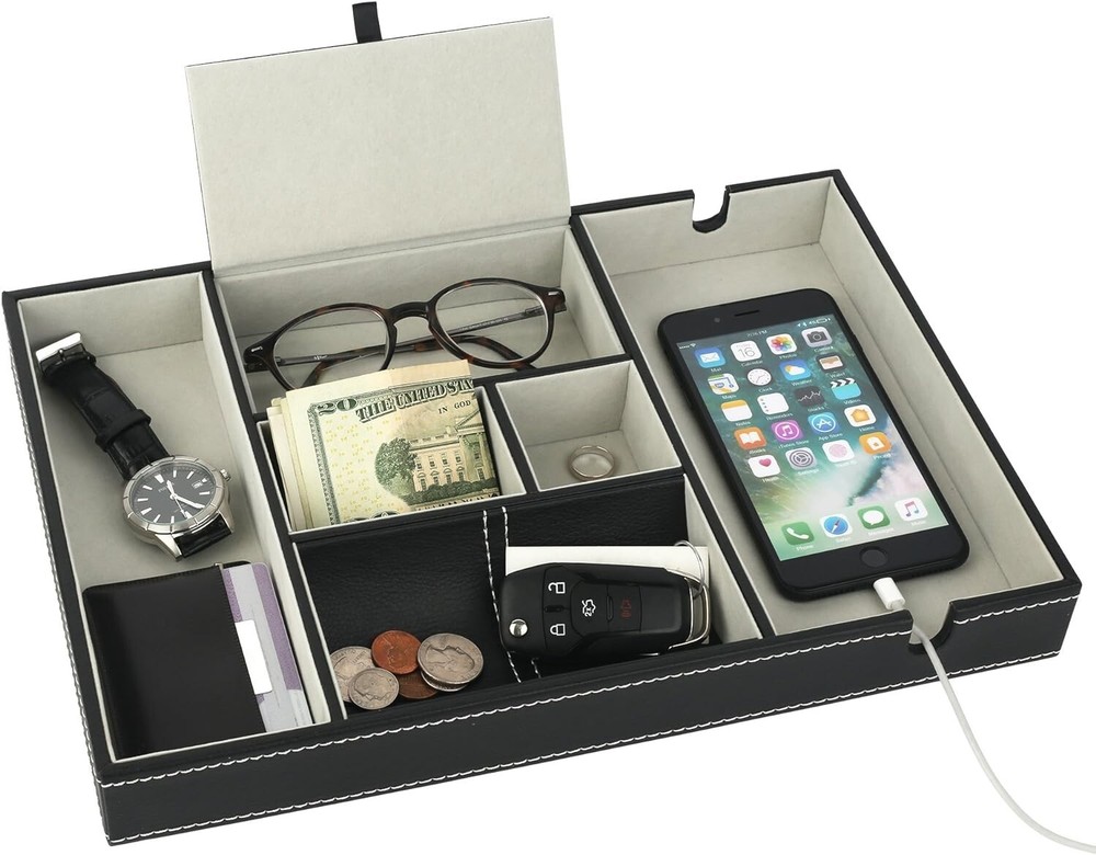 Valet Tray Nightstand Organizer - Gifts for Young Men, Nightstand Organizer for Men, Black Valet Tray for Men, Leather Faux Leather and Suede Keep your space neat - This edc dump tray helps you keep your most-used items in one place. Place your , glasses, money, jewelry, and wallets in our space-saving faux leather and suede box. Classy storage space- Our edc tray's dark and sleek exterior looks suave on any bedside table, nightstand, or drawer. It's a modern and sophisticated catchall for your office or bedroom. Always in reach- Save time and energy as you prepare for the day. This x x inches caddy lets you store your daily necessities and essentials where you can easily see them. High end- The nightstand tray's interior is lined with grey suede. The bottom is felt-lined and strong against scratches. Every stitch is impeccably made against the black PU leather. A stylish and functional- This dresser top organizer won't ever fall out of style. It's a useful gift for all the men in your life. The tray comes in a presentable and ready-to-wrap packaging. Creating superior products- and customers for life!