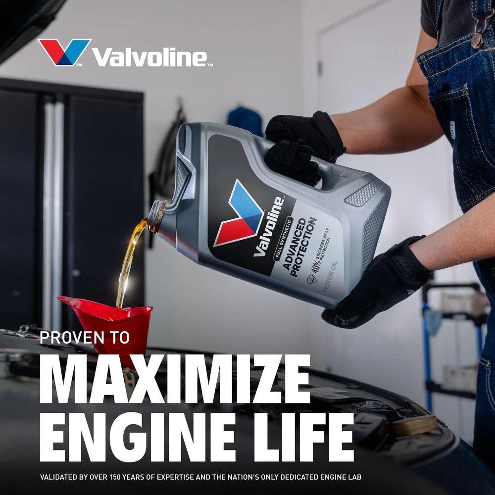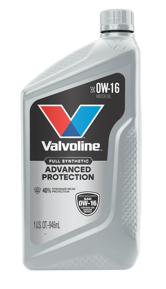 Valvoline Advanced Full Synthetic SAE 0W-16 Motor Oil 1 1 QT, Case of 6, Gold Product Details Advanced protection against the four main causes of engine breakdown: wear friction heat and deposits Exceeds industry standards for wear protection and fuel economy Superior antioxidants resist motor oil breakdown in extreme conditions Full synthetic formula offers 24X stronger protection against engine-killing contaminants than the leading full synthetic motor oil Meets or exceeds all requirements of ILSAC GF-6B, API SP, API SN with SN Plus American made and formulated, from the Original Motor Oil brand trusted for more than 150 years Anything a conventional motor oil can do Valvoline Advanced Full Synthetic improves upon. In fact, Valvoline Advanced Full Synthetic 0W-16 Motor Oil provides 24X stronger protection against engine-killing contaminants than the industry-leading full synthetic brand. Engineered with the highest quality base oils and additives, it delivers 25% better deposit protection and 40% better protection against wear than industry standards. Less wear means improved fuel efficiency, stronger performance, and a longer-lasting engine. Short trips or stop-and-go traffic are hard on a car, causing extreme heat and temperature fluctuations inside your engine that can lead to harmful sludge and extra friction. Valvoline Advanced Full Synthetic Motor Oil uses additional boosters to minimize the effects of heat. And in the winter, it flows easily at low temperatures for enhanced cold start protection. Trade up to one of our best motor oil for superior performance in all types of environments and conditions, and ensure your Honda Civic, Nissan Rouge, Ford F150, Dodge Ram, GMC Sierra (or most any other make or model) is a smooth-running machine. Valvoline Advanced Full Synthetic Motor Oil, made and formulated in America, from the Original Motor Oil brand.