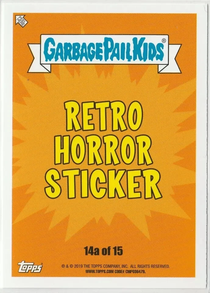 Material: Card Stock Year Manufactured: 2019 Card Type: trading card sticker Features: Base Set, Sticker Series: 2019 Revenge of Oh, the Horror-ible! ROTH Franchise: Garbage Pail Kids Card Size: Standard Language: English Autographed: No Original/Licensed Reprint: Original Genre: Comedy, Horror, Parody, Satire, Sci-Fi Subset: Retro Horror Sticker Vintage: No Mononym: overourheads Related ID: overourheadz Type: Non-Sport Trading Card Store ID: American Pop Cult Manufacturer: Topps Country/Region of Manufacture: United States Set: Oh, The Horror-ible
