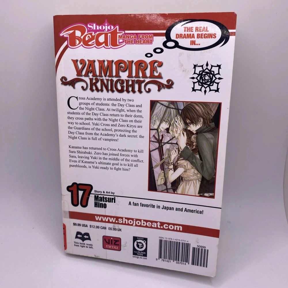 Tradition: US Comics Genre: Vampire, Shojo Inscribed: No Vintage: No Format: Softcover Signed: No Issue Number: 17 Language: English Personalized: No Features: First Printing Publication Year: 2013 Series Title: Vampire Knight Type: Graphic Novel Era: Modern Age (1992-Now) UPC: 9781421557014 Ex Libris: No gtin13: 9781421557014 Unit of Sale: Single Unit Cover Artist: Martsuri Hino Character: Manga Publisher: Viz Artist/Writer: Matsuri Hino