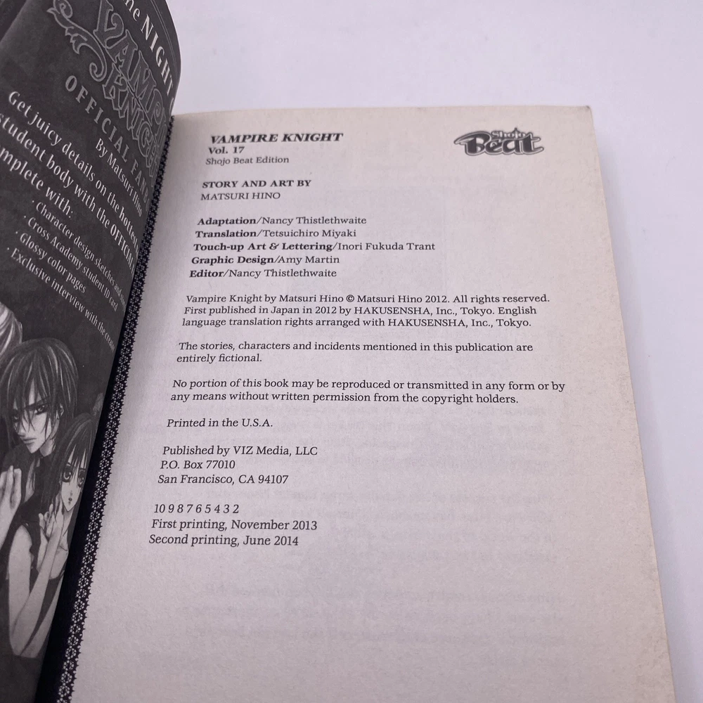 This is a rare find for Vampire Knight fans! Volume 17 of the popular manga series, written and illustrated by Matsuri Hino, is up for sale. A softcover with a first printing, this English version of the shojo comics has a beautiful cover art by the same artist. The graphic novel is in very good condition and comes from a single unit sale. This collectible item features the continuing story of the Cross Academy, where vampires and humans coexist. It is a must-have for fans of the genre, and it's a great opportunity to complete your collection. Don't miss the chance to own this piece of modern age comics that also has features like issue number 17 and publication year 2013. Real Photos
