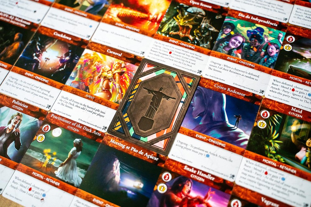 VAMPOIRES: THE MASQUERADE RIVALS EXPANDABLE CARD GAME: THE HUNTERS & THE HUNTED - A World of Darkness Awaits... When the celebrations and dancing have ended for the night, the citizens of Rio de Janeiro wander home. But in the darkness and afterglow, danger lurks: Coteries of vampires seek their prey, while Hunter cells research and investigate the unknown. Rivals is an expandable card game for 2-4 players based on the popular roleplaying game set in the World of Darkness. Each player controls a group of vampires or Hunters who seek to dominate their Rivals by attacking their foes, starting Conspiracies, advancing Agendas, and hunting mortals and monsters. Both Hunters and vampires can appear in the same game, so be ready for anything! AT A GLANCE: Number of Players: 2-4. For Ages: 14+. Playing Time: 30-70 min. Game Type: Expandable card game set in the World of Darkness. CORE SET! Contains everything you need to play right out of the box! CONTROL A GROUP OF VANPIRES OR HUNTERS: 4 pre-constructed Player Decks–2 Hunter Cells (Faithful & Inquisitive) & 2 Vampire Clans (Ministry & Caitiff)! MAKE IT PERSONALIZED: Includes Crypt Pack to customize your decks! A WORLD OF DARKNESS AWAITS: Core Set Expandable card game set in the World of Darkness.