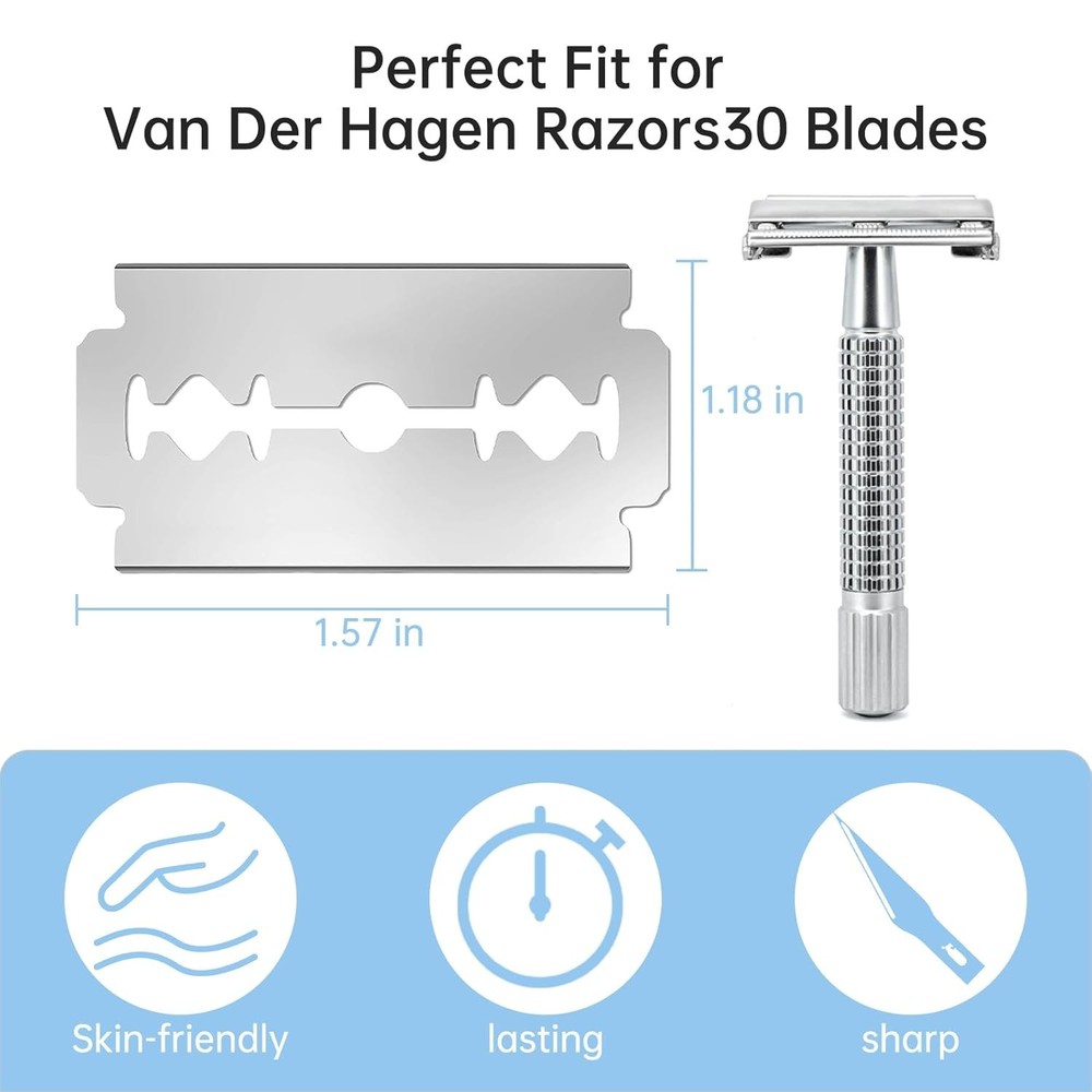 Double Edge Safety Razor Blades for Van Der Hagen, 30× Replacement Razor Blades Refills, Stainless Steel Razors Blade Refills, for Men's Safety and Straight Razors, Precise and Clean Shave, Only Blade Product Details Package Dimensions : 3.31 x 2.05 x 0.47 inches; 0.63 ounces Manufacturer : Ajrwiiy Country of Origin : China Brand: Ajrwiiy Number of Blades: 30 Age Range (Description): Adult Skin Type: Normal Number of Items: 30 Sharp and Precise Shaving: Made from high-quality stainless steel, these blades glide smoothly for a clean and precise shave. Sharp and durable, they deliver long-lasting, exceptional shaving performance Perfectly Compatible with Van Der Hagen Razors: Designed specifically for Van Der Hagen razors, this blade refill pack improves shaving efficiency, ensuring a seamless fit for the best shaving results Double-Edge Design: Ideal for safety and straight razors, the double-edge design offers a closer, more flexible shave, ensuring precision every time Comfortable Shaving Experience: Designed for coarse or thick hair, these blades provide a comfortable shave without pulling or nicks, making shaving easier Individually Wrapped: Each pack contains 30 blades, divided into 3 boxes with 10 blades each. Each blade is individually wrapped for hygiene These high-quality stainless steel blades are designed for Van Der Hagen razors, offering a precise shave with long-lasting performance. The double-edge design ensures a closer, more flexible shave, ideal for coarse or thick hair, while each blade is individually wrapped for hygiene. The pack includes 30 blades in 3 boxes.