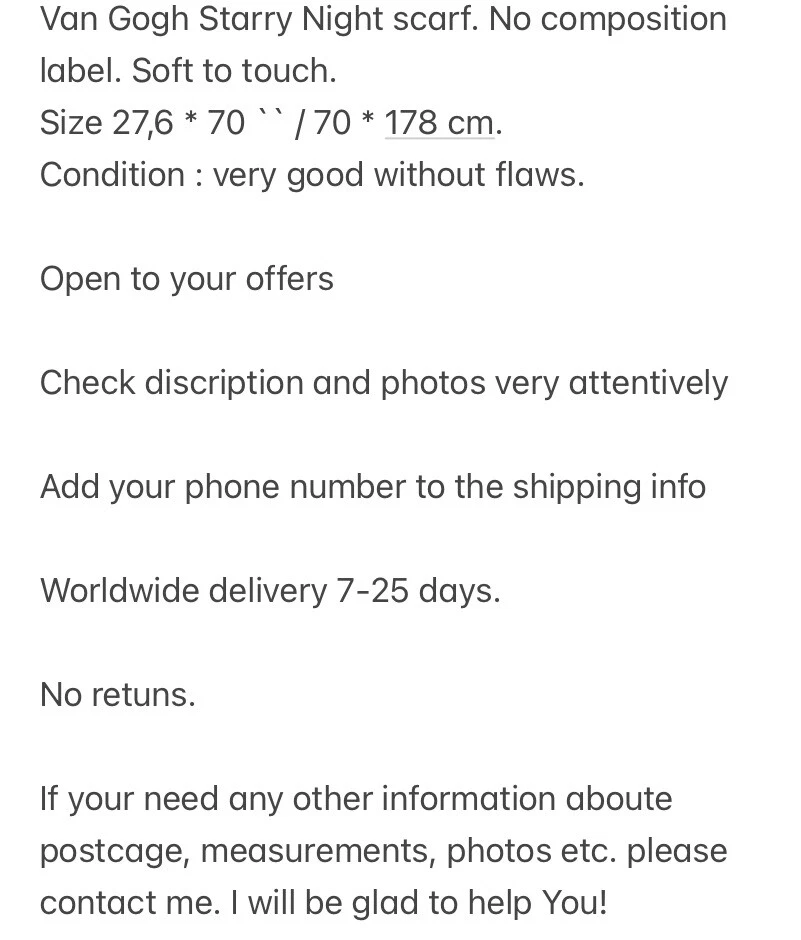 Van Gogh Starry Night scarf. No composition label. Soft to touch. Size 27,6 * 70 in / 70 * 178 cm. Condition : very good without flaws. Open to your offers Check discription and photos very attentively Add your phone number to the shipping info Worldwide delivery 7-25 days. No retuns. If your need any other information aboute postcage, measurements, photos etc. please contact me. I will be glad to help You!