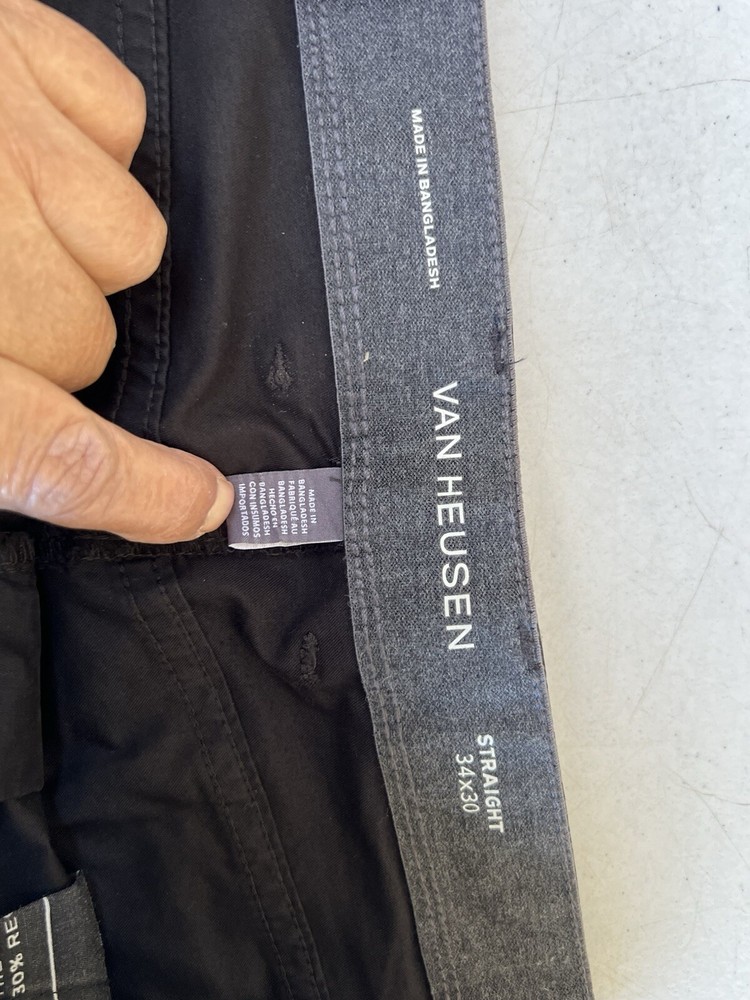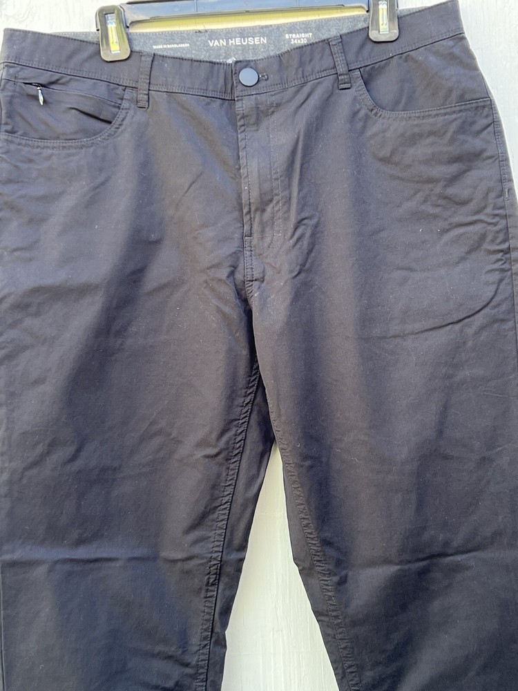 These Van Heiden Men's Dress Pants in black are designed in a classic fit with a straight leg style. Made from a blended fabric of cotton, these pants feature a flat front with both zip and button closures. The size is 34 with a 30-inch inseam, suitable for casual or business occasions in the summer, fall, or spring seasons. Pockets are included for added functionality, making these pants a versatile and stylish choice for any man's wardrobe.