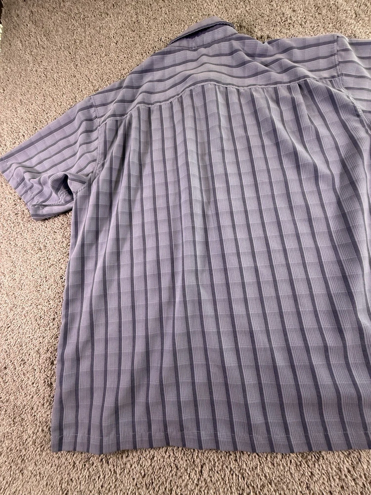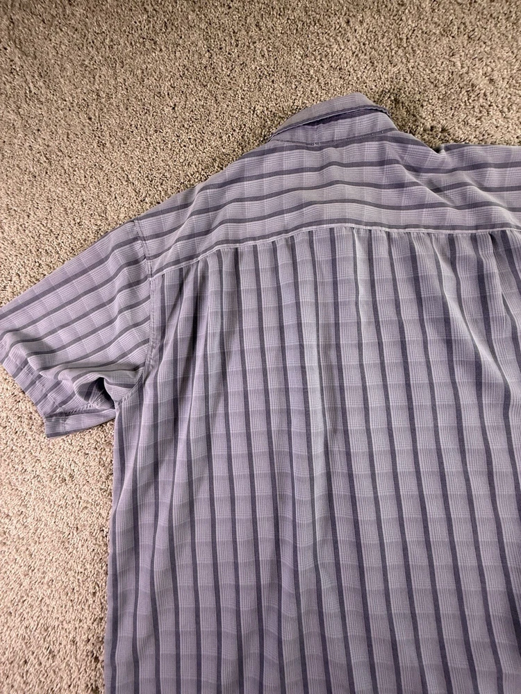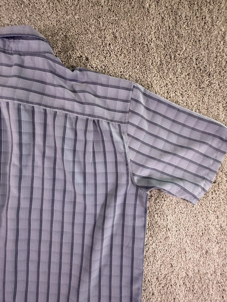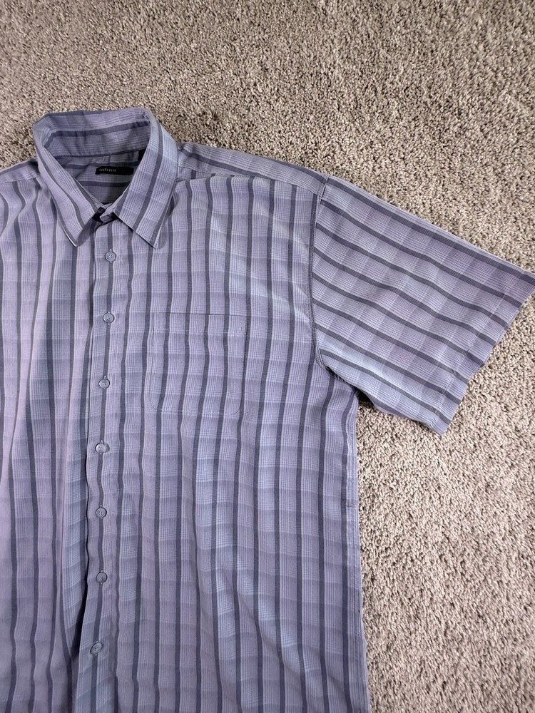 The Van Heusen Studio Men’s Short Sleeve Button Down in Blue Gray Check is a stylish and versatile dress shirt perfect for big and tall men. Made from durable polyester material, this shirt features a classic collared neckline with a button-down closure for a polished look. The gray check pattern adds a touch of sophistication, while the machine washable design makes it easy to care for. Perfect for various occasions, this regular fit shirt from the reputable brand Van Heusen is a must-have addition to any man's wardrobe. 5138