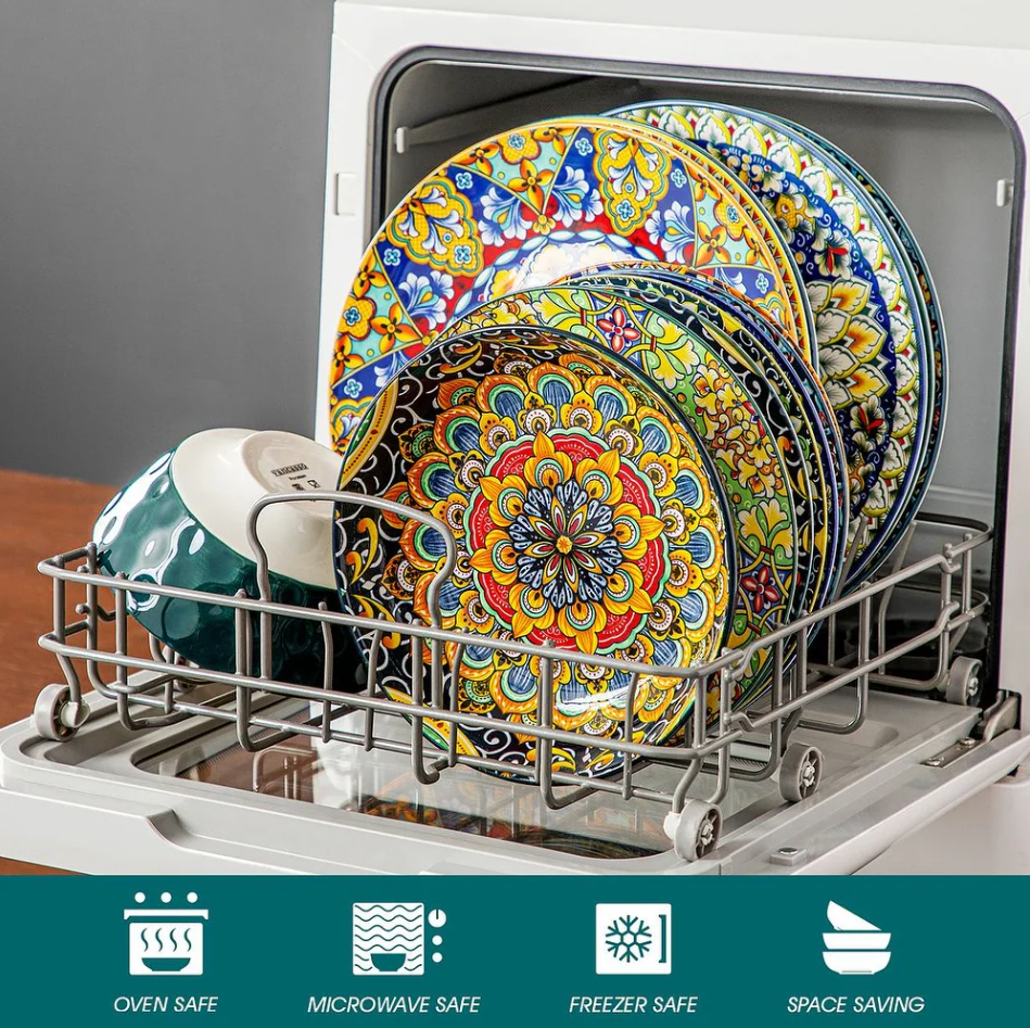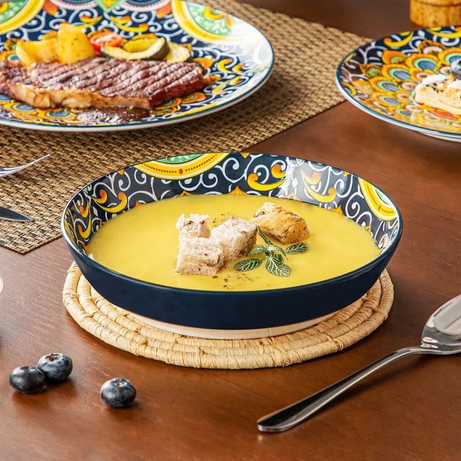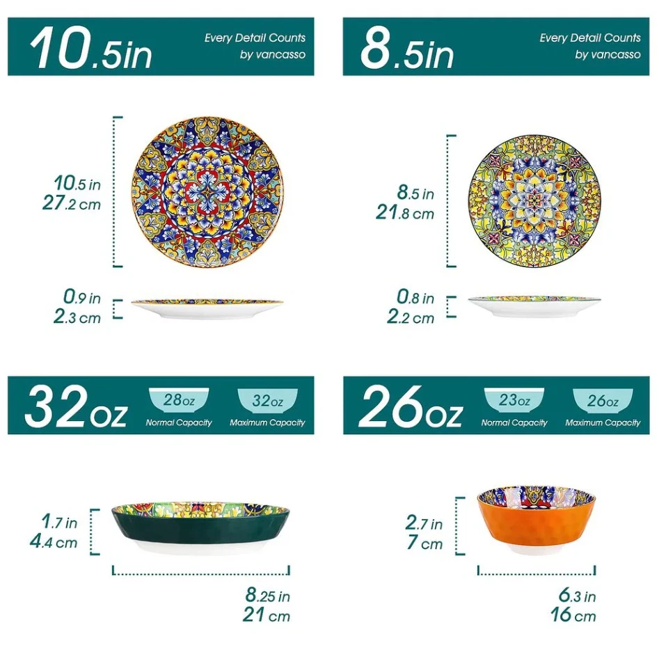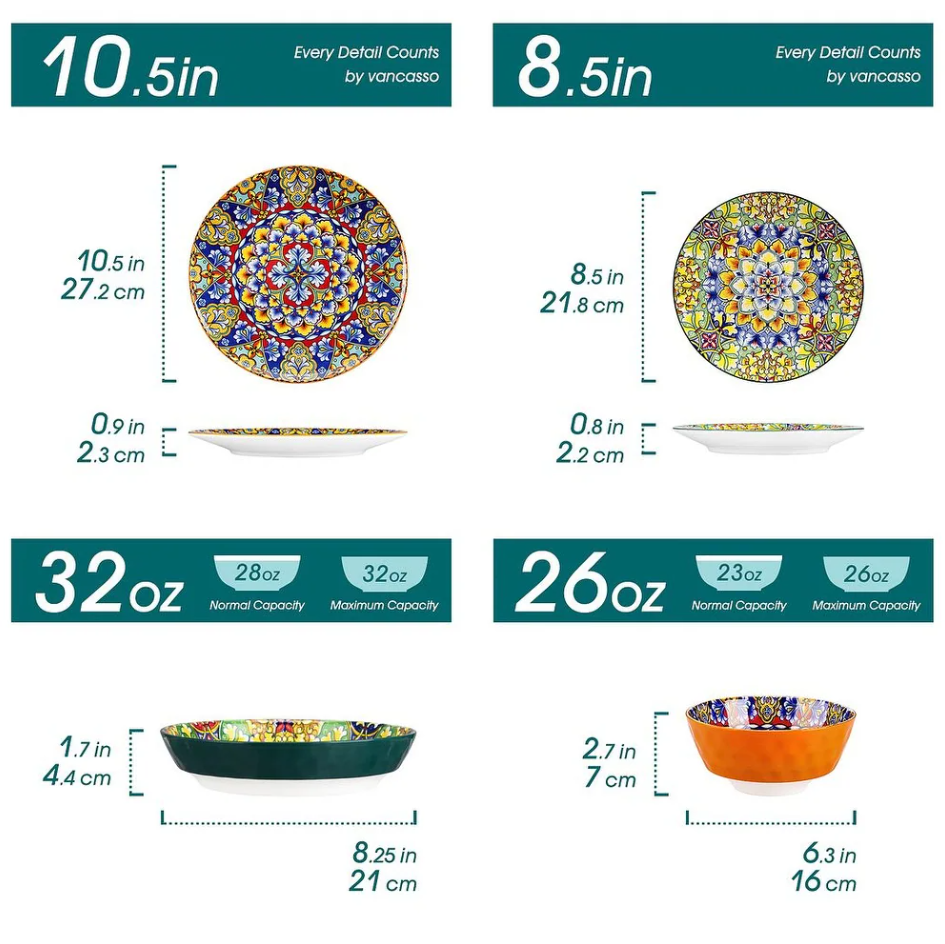 Details: The vancasso SIMI Porcelain Dinnerware Set is a beautiful and functional addition to your dining experience. Eclectic designs inspired by traditional Bohemian art,this set features four different colors added to the classic charm of the popular. Features: The dinnerware is made from high-quality porcelain Available in 24 or 48-piece set. Lovely embellishments for pop of classic charm Microwave, freezer, dishwasher and oven safe The set is designed to provide everything needed for a complete dining experience. Set Includes: Dinner Plates: 0.9"H x 10.5"L Dessert Plates: 0.8"H x 8.5"L Bowls: 2.7"H x 6.3"L ,26 Oz. Pasta Bowls:1.7"H x 8.25"L ,32 Oz.