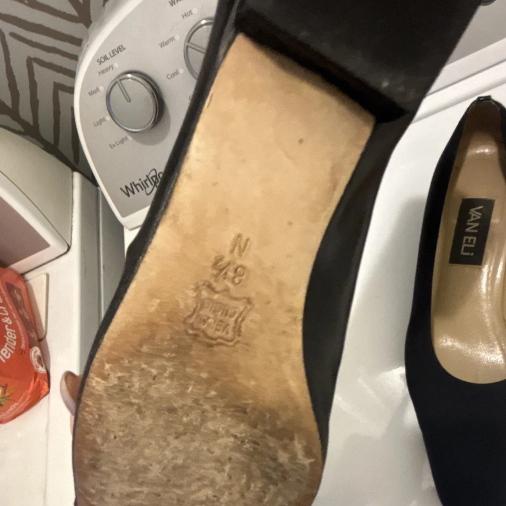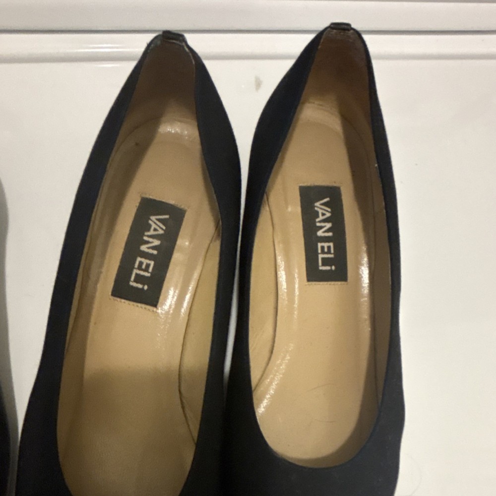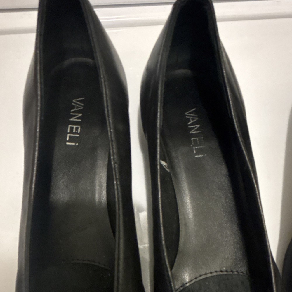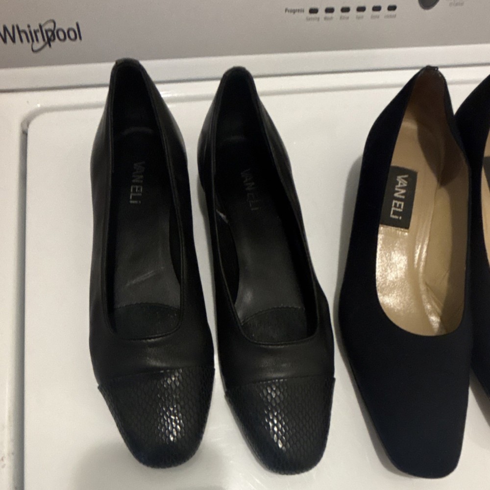 The Vaneli Black Leather Square Toe Cap Toe Slip On Flats in women's size 8.5N are stylish and versatile shoes perfect for casual occasions during the fall and spring seasons. These flats feature a solid black color with a unique square toe cap accent, adding a touch of elegance to the classic slip-on design. Made with high-quality leather, these flats offer both comfort and durability, making them a great addition to any woman's wardrobe. ( the listing is for both pair of VanEli shoes)