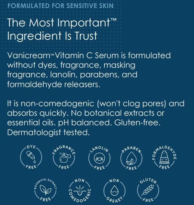 Vanicream Vitamin C Serum - for Sensitive Skin - 1.2 Fl Oz Vanicream is the #1 Dermatologist recommended Brand for Sensitive Skin: Source IQVIA ProVoice Survey, 12 months ending July 2024 Vanicream Vitamin C Serum is specifically designed for sensitive skin and contains a potent yet gentle vitamin c derivative and ceramides. Packaged in an airless pump, this formula is much less likely to oxidize or change color, so it lasts longer than many other Vitamin C serums. Vanicream Vitamin C Serum is formulated without dyes, fragrance, masking fragrance, lanolin, parabens, and formaldehyde releasers. Ideal for sensitive, dull or uneven skin. 1.75 inches x 1.75 inches x 6.5 inches. Weight: 2.08 oz Product Dimensions 1.75 x 1.75 x 6.5 inches; 2.08 ounces Country of Origin USA Product Benefits Non-comedogenic, pH Balanced Special Ingredients vitamin_c, ceramides Use for Face Skin Type Sensitive Scent unscented Size 1.2 Fl Oz (Pack of 1)