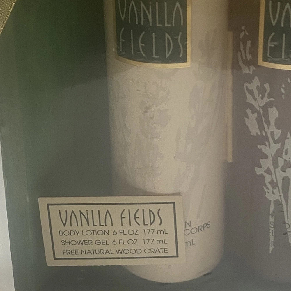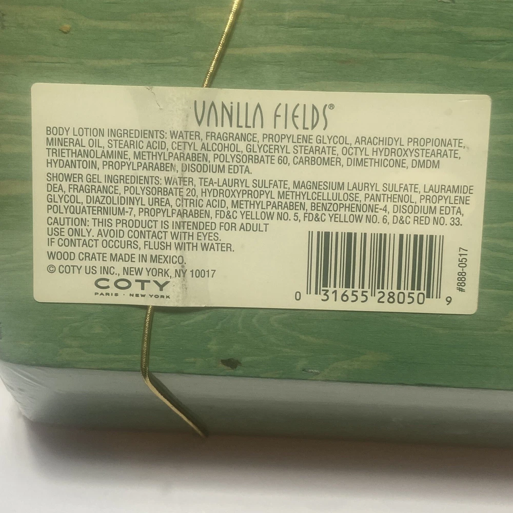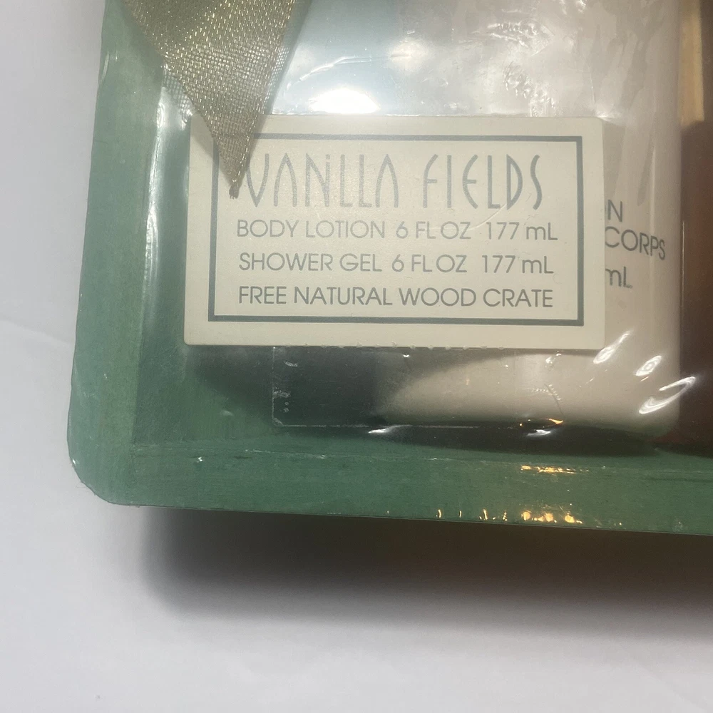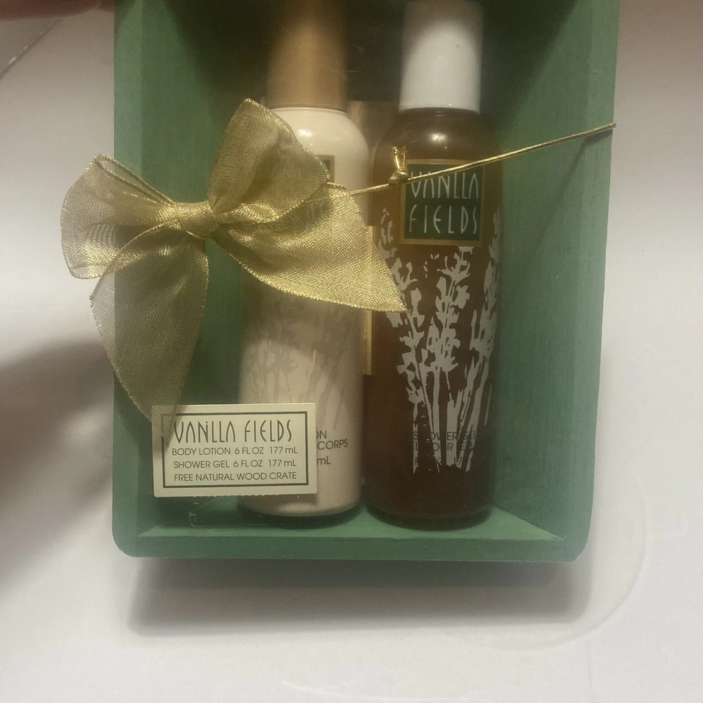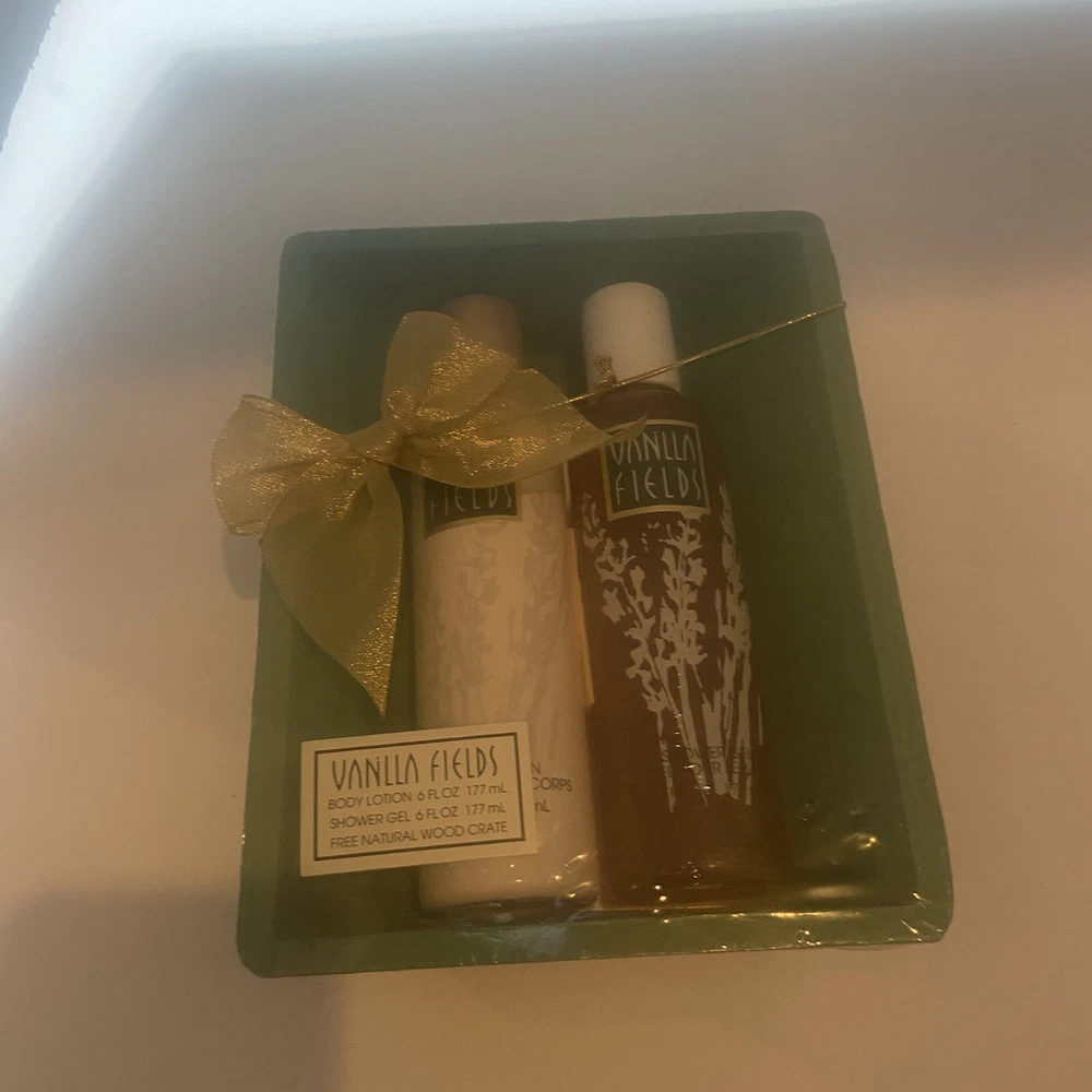 Vanilla Fields By COTY VTG lotion And Shower Gel 6oz Wood Crate Gift Set. For decor or prop only. Product is vintage and not for personal use. Sold AS IS. Sealed package, gift set.