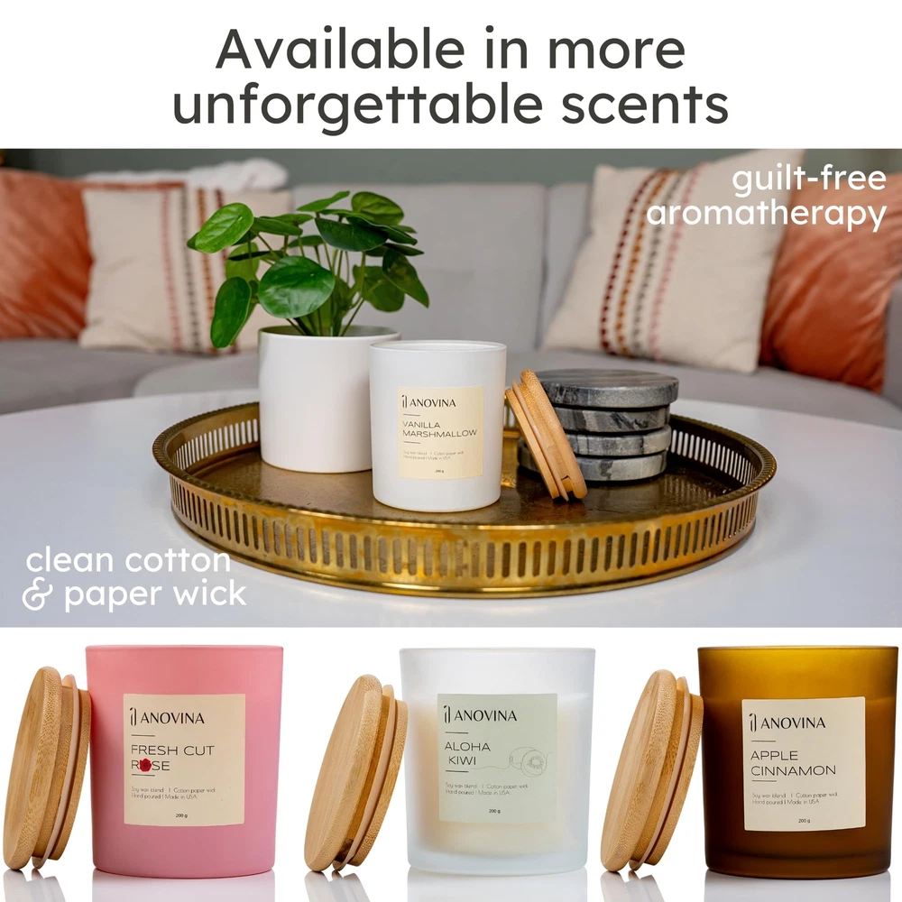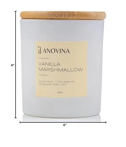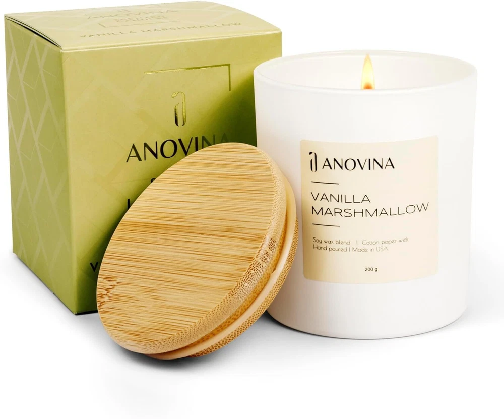 Anovina Vanilla Scented Candle with Gift Box. Non-Toxic Candles for Home, Secented Candle Gifts for mom, Glass Jar with Bamboo Lid Hand Poured in USA MADE FROM A NATURAL SOY WAX BLEND & QUALITY SCENTED OILS - Hand Poured in the USA, these candles by Anovina are made with human-safe and pet-safe scented oils and ingredients that are paraben-free, phthalate-free, formaldehyde-free and contain no VOCs. Swap those low-quality candles with a more natural candle that smells so good, you’ll want to eat it. These soy candles burn slowly so you can get more burn time from every candle. Just trim your wick so it burns evenly! STRONGER-SMELLING, LONG-LASTING, EVEN-BURNING CANDLES - Isn’t it the worst when you get a scented candle that doesn’t smell? These Anovina candles are sure to pass that test and all of the other must-haves when looking for the best candles. That’s because we discovered the most flawless oil-to-wax ratio – to give you powerfully scented candles that last, burn evenly, and smell so good you’ll want to taste them. Choose from Vanilla Marshmallow, Apple Cinnamon, Aloha Kiwi, Fresh Cut Rose & more. RICH & CREAMY VANILLA CAMPFIRE NOTES FOR SOOTHING COMFORT - These uniquely scented candles combine the most incredible aromas inspired by our favorite sweet treats, fun-filled holidays, tropical destinations & more. Unlike other candlemakers, we use ingredients that are safe and free of metal core wicks that can leach heavy metals and lead into the air you breathe. That’s why we chose to use pure cotton & paper wicks – so you can burn your favorite candles safely and guilt-free. THE PERFECT MATCH FOR RELAXING & ROMANTIC VIBES - Looking for the perfect candles to set the mood after a long day? These powerful but not overpowering aromatherapy candles may take the edge off and relieve stress, inspiring relaxation and helping you reset mentally, emotionally, and even physically. Scented candles can play an essential role in the physiological effects of mood, stress, working capacity, and overall well-being (Chryssa Chalkia, Accredited Clinical Counselor, 2020). A BEAUTIFULLY-PACKAGED GIFT FOR THEM OR FOR YOU! - Anovina candle scents are hard to forget and each one comes in a modern, reusable glass candle jar and attractive giftable box. These soy candles make great candle gifts for women and men who love the feeling of a warm, clean, candlelit room. For best results, trim your wick so your candle burns slower (approximately 50 hours burn time). One Anovina candle per medium-sized room is just what you need to make your home or office smell incredible. SHIPPING - We offer FREE shipping on all orders! - We ship within 3 business days of payment, usually sooner - We only ship to the lower 48 states, no APO/FPO addresses or PO Boxes allowed International buyers – please note: Import duties, taxes, and charges aren't included in the item price or postage cost. These charges are the buyer's responsibility. - Please check with your country's customs office to determine what these additional costs will be prior to bidding or buying. - We have confidence in our products, but if you are not fully satisfied please contact us within 30 days of purchase and you will get full refund. * Order Cancellation Policy ** You can return a product for up to 30 days from the date you purchased it. 1. The seller reserves the right to cancel the special case only due to eBay cancellation fee. 2. The decision of seller is the final. 3. The seller will respond to the cancellation request within 2 business days. Please wait for the result of cancellation. 4. In case the cancellation is not completed by some reasons, the buyer can follow the options below to get the refund. 4.1 The buyer can reject the item when it arrives. 4.2 The buyer can send the item back to the seller within 30 days If the buyer receives item (USA Shipment ONLY). The seller will provide the FREE return label to the buyer when the buyer opens " Return Item" case on eBay by using the reason as "Change my mind" ONLY. 5. When buyer has placed the order. The order will be processed and completed by automatic warehouse system within 5 minutes. In case that buyer sends the cancellation request after 5 minutes of placing the order, the request will be rejected. **Sending direct message to cancel the order is not allowed for every case.* Return Policy For the return case - If buyer would like to return the items for refund or replacement, please CONTACT SELLER to receive the free return label from seller. The refund or replacement will be processed with the tracking number of return label which is provided by seller only. The other ways of return which are not approved by seller will not be processed for the refund or replacement.