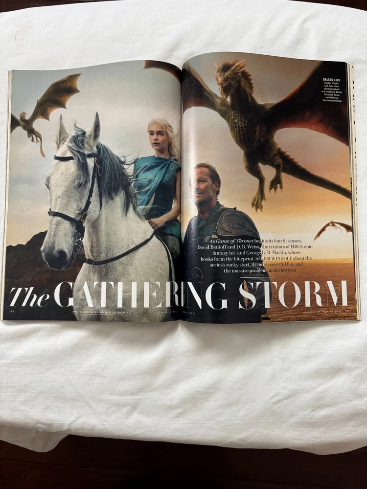 VANITY FAIR - April 2014 IssueFeaturing: Exclusive Game of Thrones Cast CoverCondition: GoodThis collectible issue features the cast of HBO's Game of Thrones at the height of the show's popularity. The cover showcases a stunning portrait of key cast members including Emilia Clarke, Peter Dinklage, and Kit Harington.Special Features:- In-depth Game of Thrones cover story and photo spread- Behind-the-scenes insights from cast and creators- Complete magazine in original condition- Historic issue from Season 4 era of the seriesA must-have piece for Game of Thrones fans and magazine collectors alike.Ships securely packaged in protective mailer.