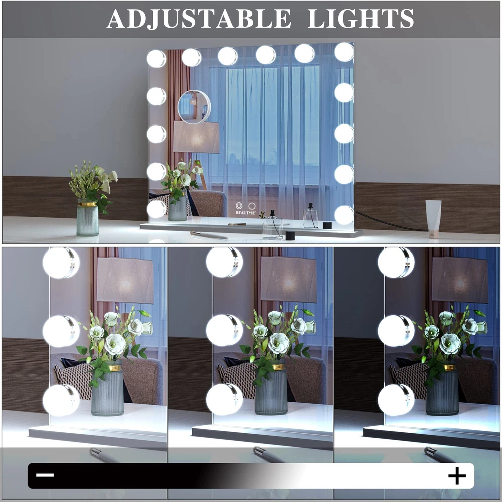 Large Size & Frame Design: Optic mirror 23.62''(L) x 19.69''(W) and overall frame,Strong, solid feel with metal frame, Gorgeous and superior reflective mirror built to last with top quality material. Vanity mirror for easy to use - Plug and play with the included 12V 1A adaptor. LED mirror with smart touch control and memory function. 2 Kinds of Setting Up, Wall Mounted / Tabletop Vanity Mirror. The Makeup Mirror Is Versatile Since It Can Be Placed on a Makeup Desk or Hung on The Wall,The Wooden Base is Easy to Install. Large Long Lasting Countertop / Wall Mirror. Optic Mirror 600mm(Width) X 500mm(Height) And Overall Frame, Strong, Solid Feel with Metal Frame And Wooden Base, Gorgeous And Superior Reflective Mirror Built to Last with Top Quality Material,No Need to Exchange The Bulbs. 14pcs Hollywood Vanity Mirror Led Lights and 1pcs 10X Round Mirror.Surrounded by 14X1.2W Led Lights, with Warm Light ( 4000K Color Temperature) / Daylight (6000K Color Temperature) Settings.Bulbs Provide Enough Brightness to Makeup in Dark. It Is Soft and Not Dazzling. A Good Gift for Family And Friends: for Women And Girls, Having Such A Make-Up Mirror Is Their Own Dream.With The Lighted Vanity Mirror, We Can Get A Better View of What We’Re Doing And This Is The Main Purpose of Such A Lighted Mirror-To Recreate The Natural-Lighting Environment We Need for Applying A Flawless Makeup.