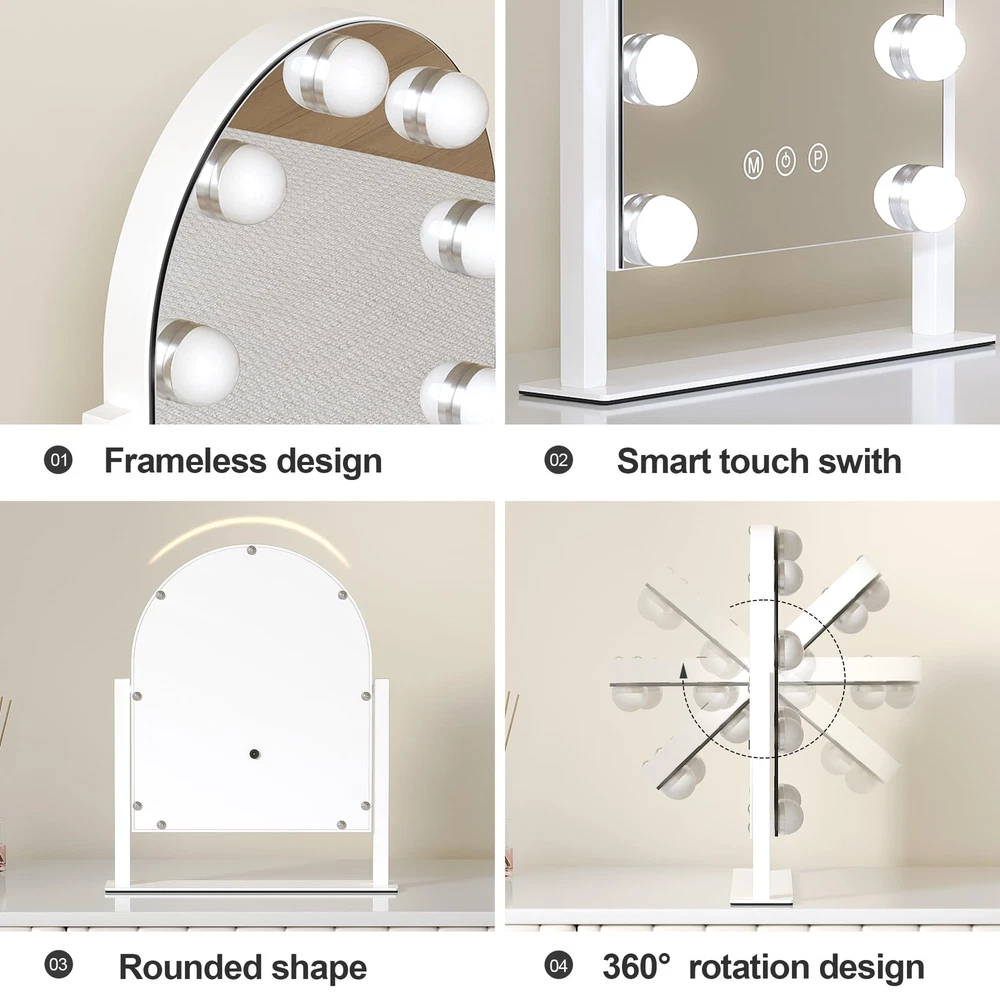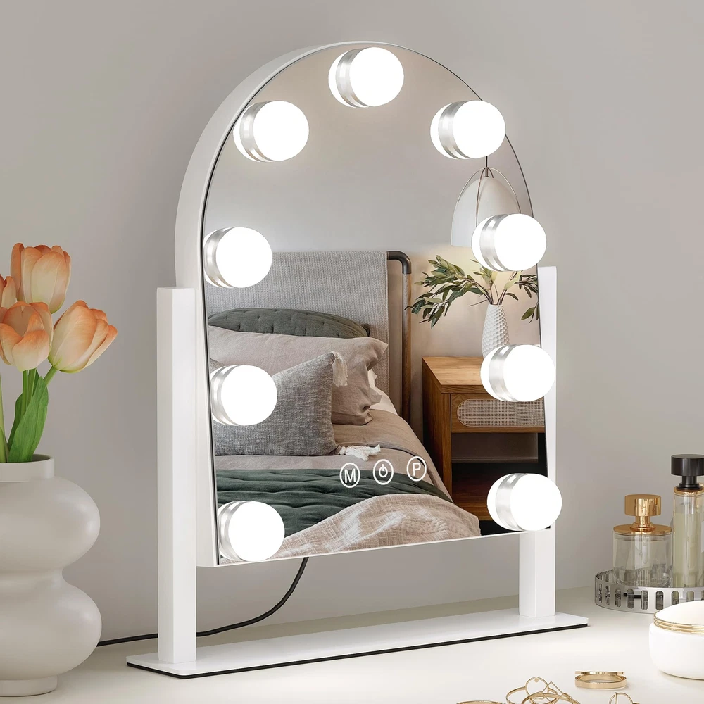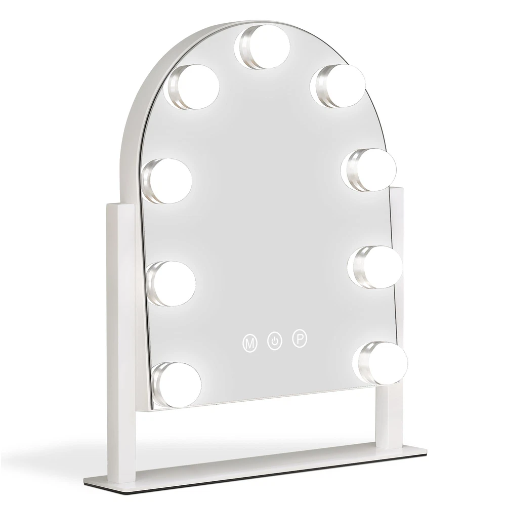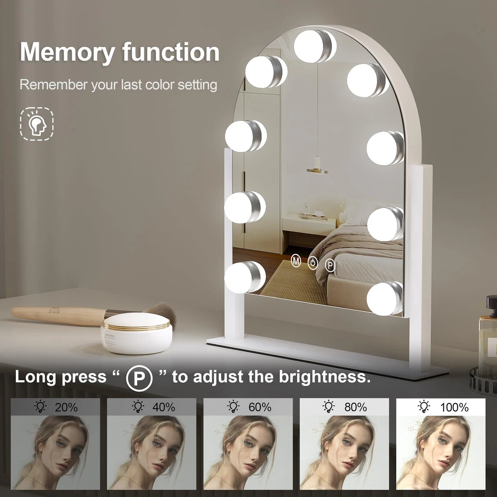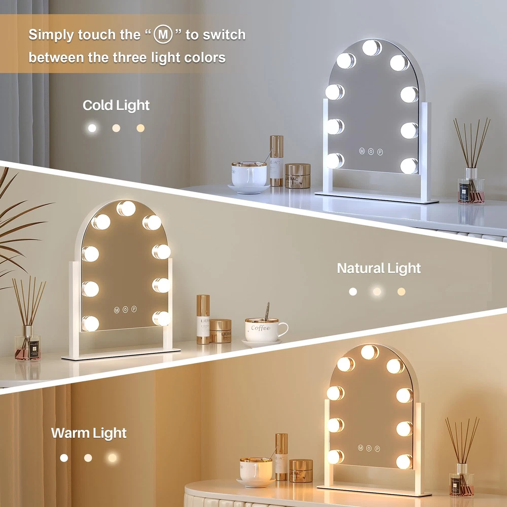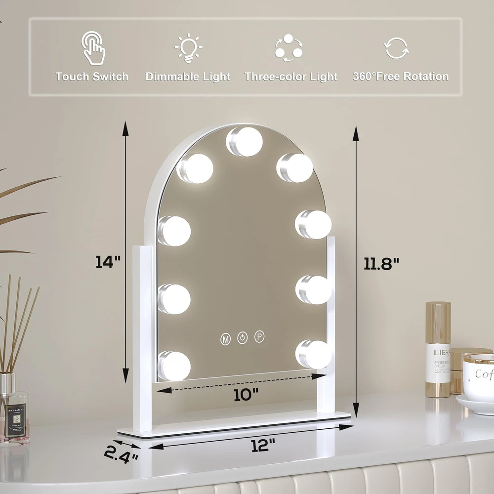 【Prefect Size】: The Hollywood makeup mirror dimensions (14 inches long x 12 inches width) are the perfect fit for your vanity mirror. 【3 Color Modes and Adjustable Brightness】: The vanity mirror with light features 9 high-quality LED bulbs with 3 adjustable brightness settings: warm, cool, and mixed. Whether it's morning or late at night, adjust the brightness and mode to meet your makeup needs. 【Touch Sensor Control and Smart Memory Function】: Simply touch the sensor switch on the screen to turn the lighted makeup mirror on/off and adjust the brightness. Button "M" adjusts the light mode, while button "P" adjusts the brightness. The smart memory function allows you to easily use the appropriate light from your last adjustmentto help you achieve the perfect look with the vanity mirror with light. 【360° Rotation and Sturdy Metal Base】: The lighted makeup mirror can be rotated to any desired angle, sitting securely on its sturdy metal base with anti-slip pads, ensuring it won't tip over. 【Perfect Gift, 100% Satisfaction Guarantee】: The vanity mirror no assembly required, easy to use, making it the perfect gift for beauty lovers, especially suitable for birthdays, Valentine's Day, Mother's Day, Christmas, and other occasions. We offer a 30-day unconditional exchange policy, your satisfaction is our commitment. Please feel free to contact us with any questions.
