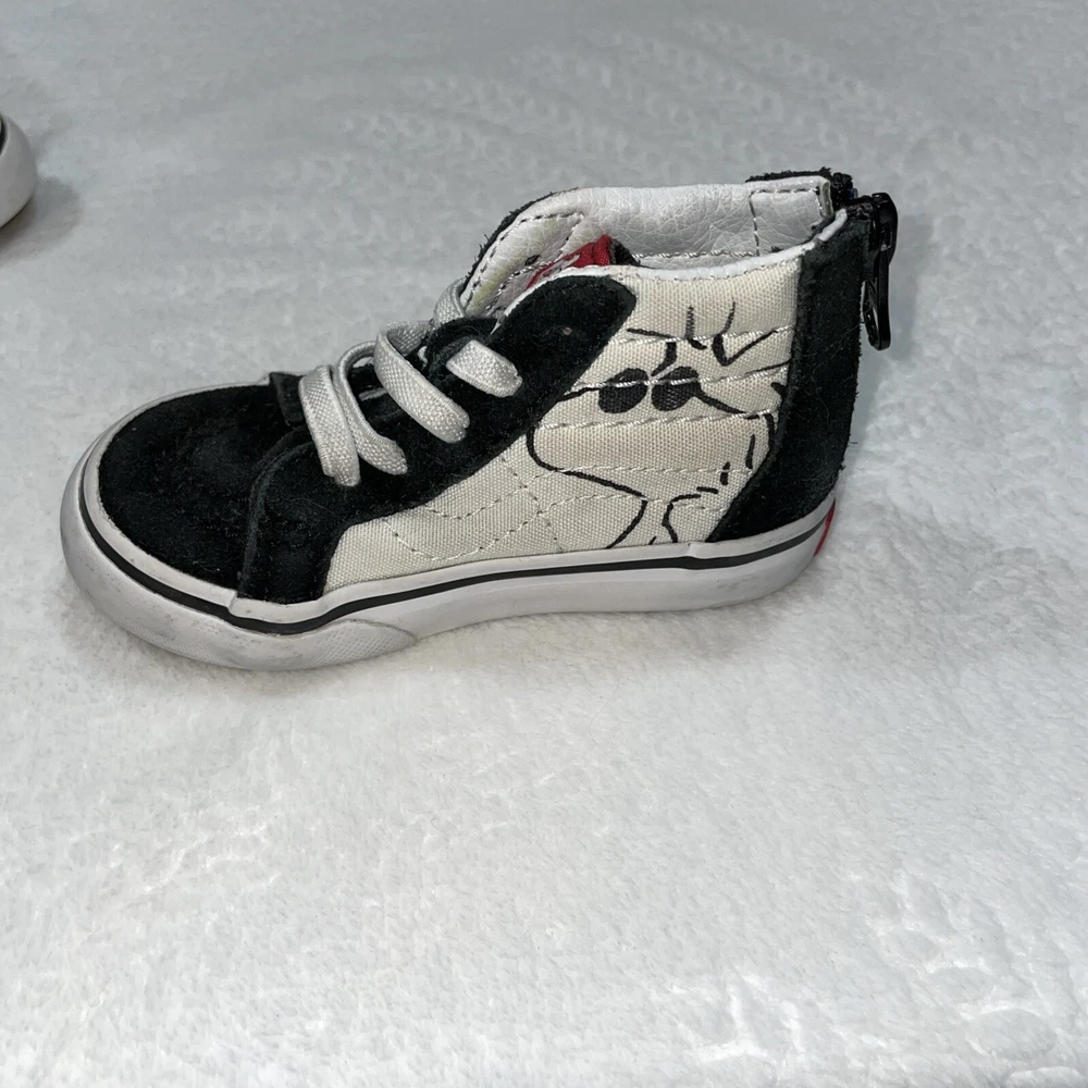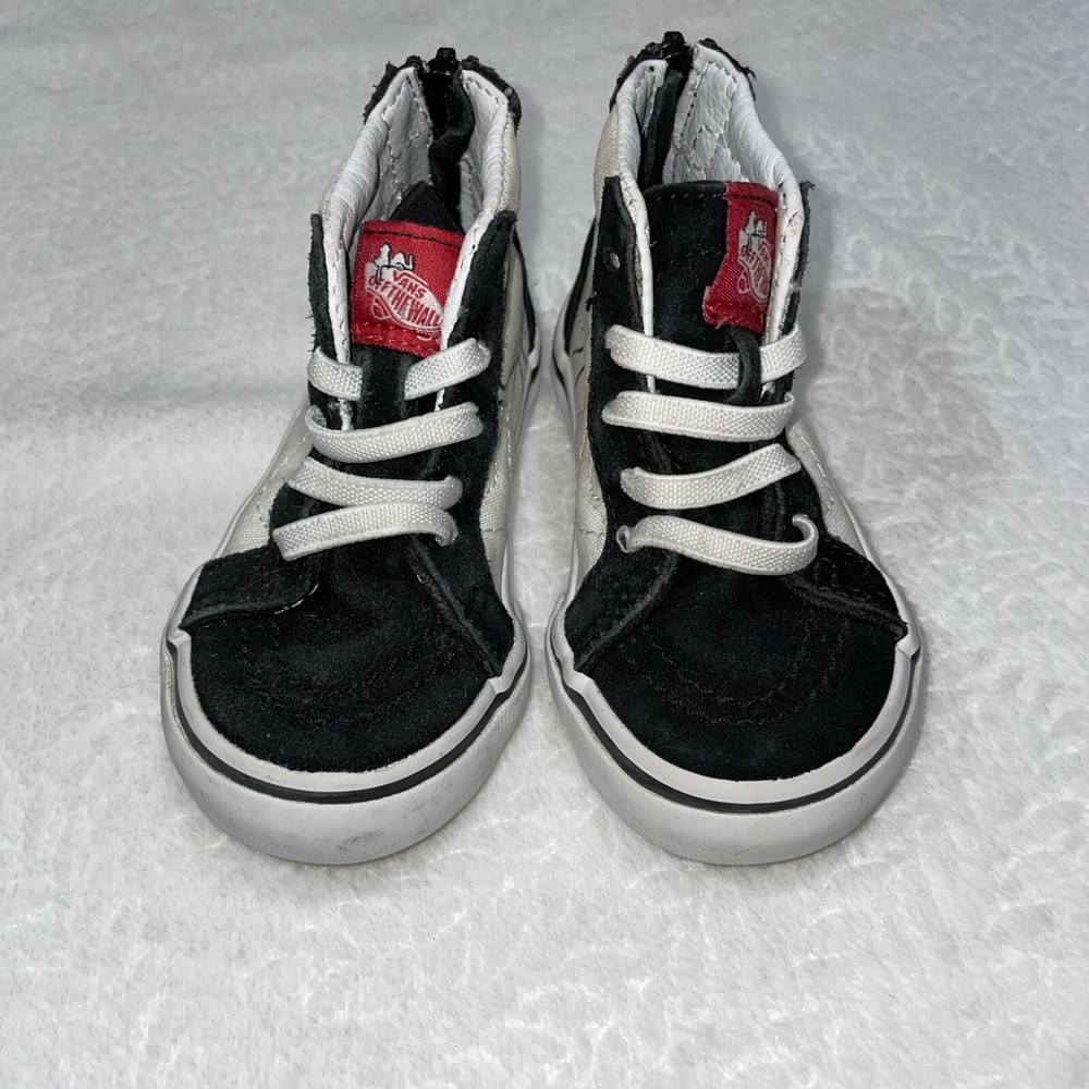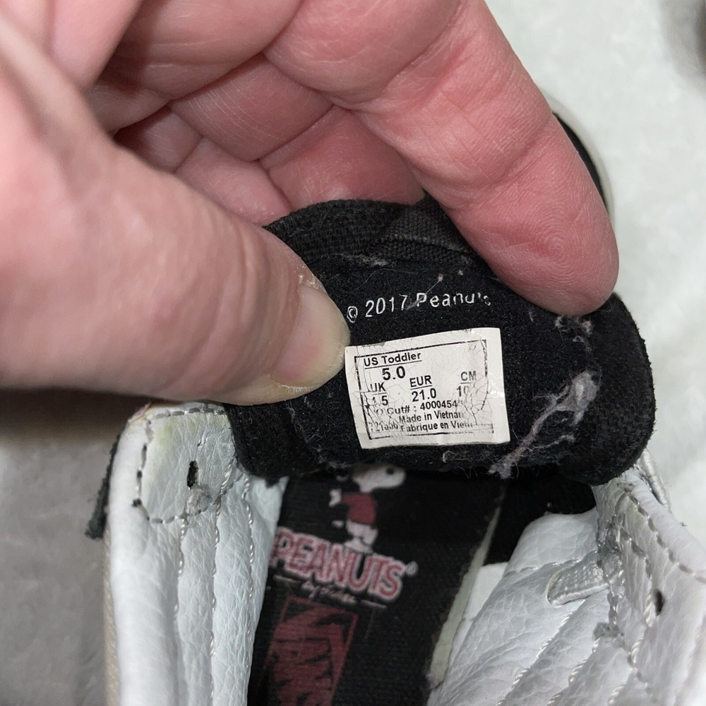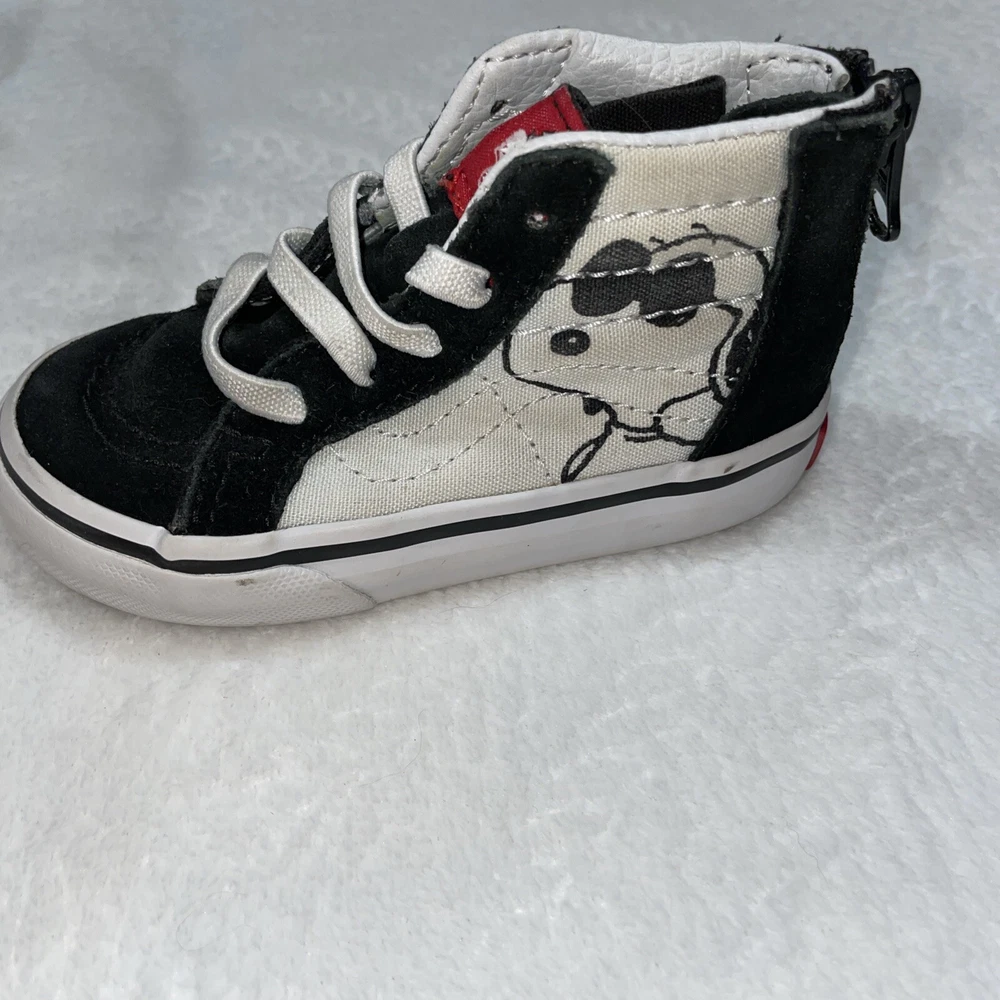 The Vans 2017 PEANUTS Snoopy Woodstock SK8 Zip Up Toddler 5 sneakers feature a Round Toe design with Elastic Shoelaces and a Zip closure for easy wear. These Unisex Kids shoes in Black/White showcase a Snoopy theme from the Peanuts character family. Made with Canvas and Suede materials, they are part of the VANS Sk8 product line, manufactured in Vietnam in 2017. Perfect for little ones, these athletic sneakers embody a playful and comfortable style for young fans of the iconic Snoopy and Woodstock characters.
