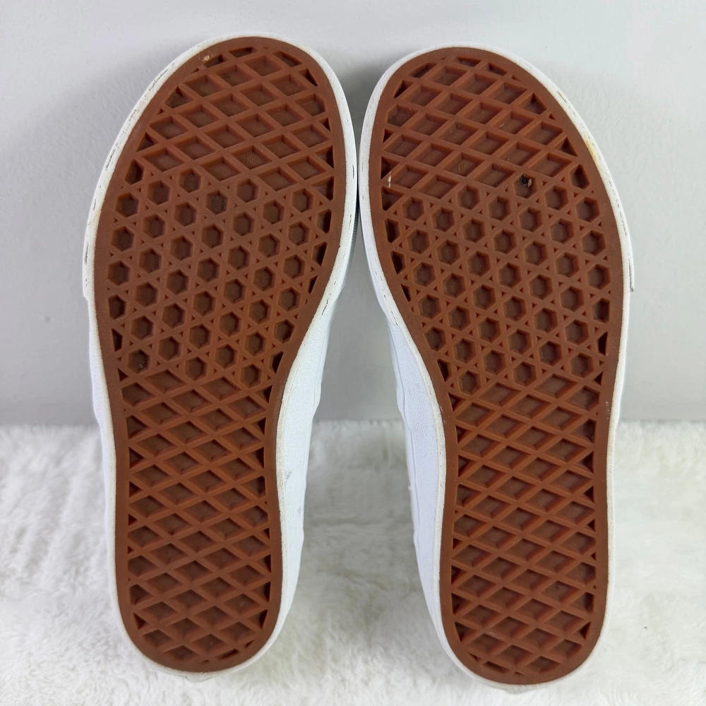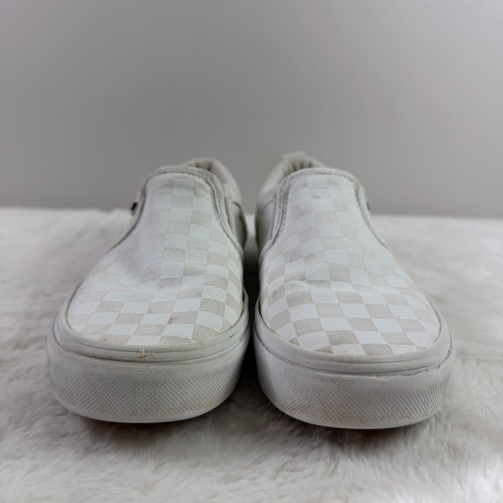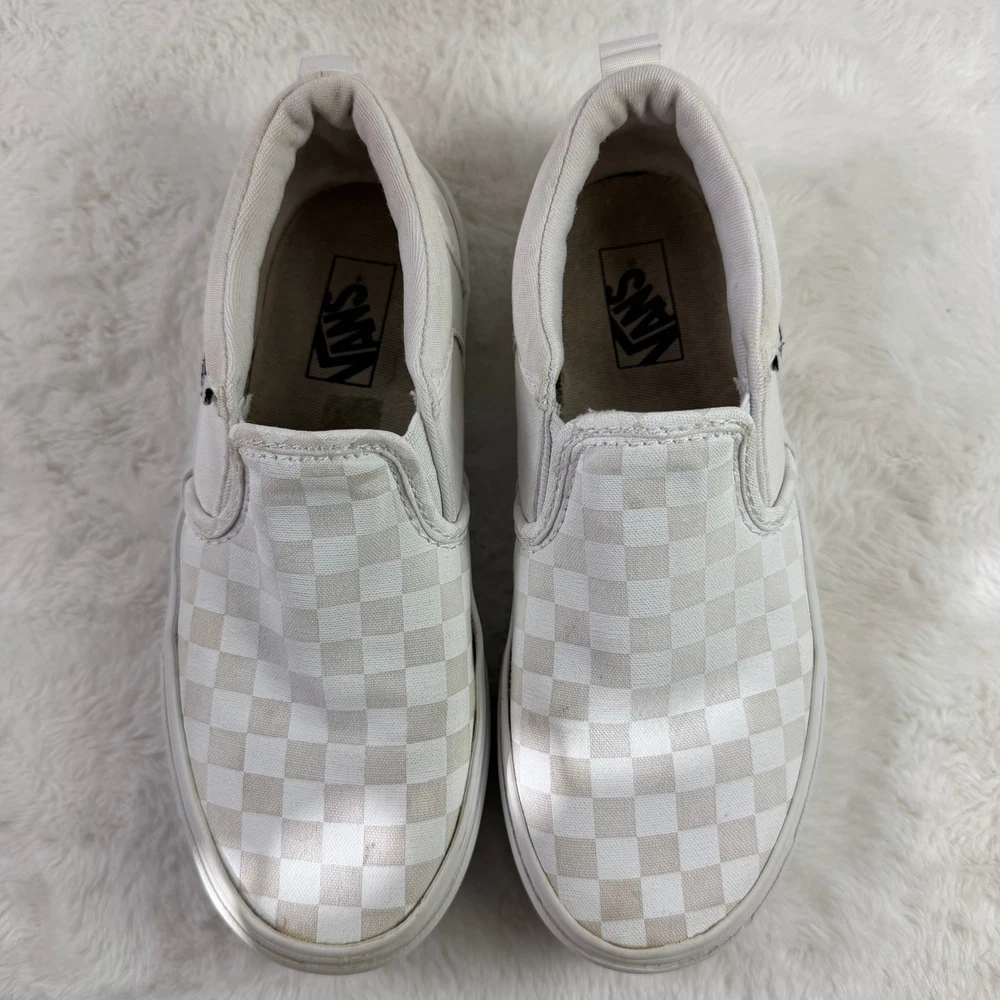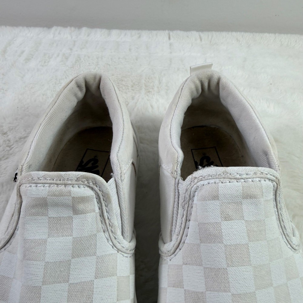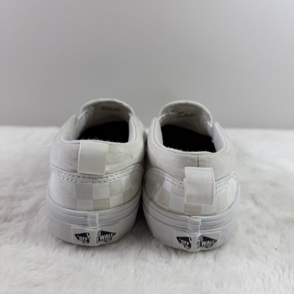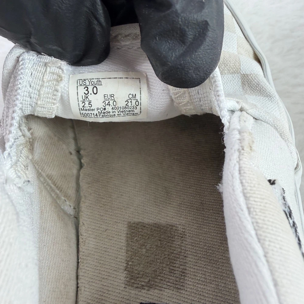 Vans Classic Slip-On youth sneakers in white checkerboard canvas, size US Youth 3. Pre-owned in good condition with normal signs of wear such as light creases or minor scuffing. Elastic side accents and the slip-on design remain intact. Please review all detailed pictures carefully for the best representation of condition and any imperfections.