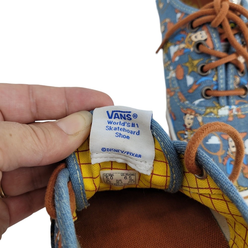 721278 rare Vans Disney Pixar Toy Story Sheriff Woody low top lace up skater fashion sneaker with brown rope laces. Gently pre loved no noted flaws Size Womens 6.5 Mens 5 Seller on multiple platforms and next day shipper. Bundle and save. 721278 Streetwear Skater Toy Story Woody