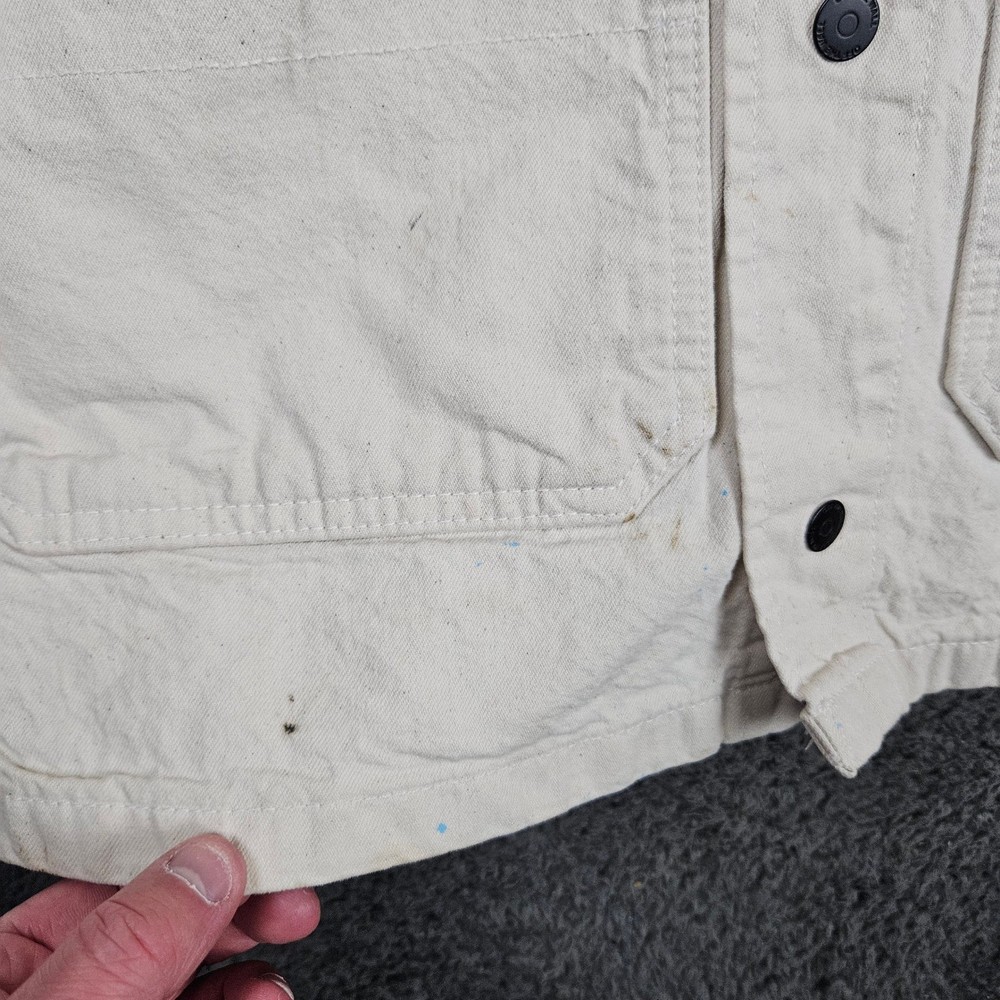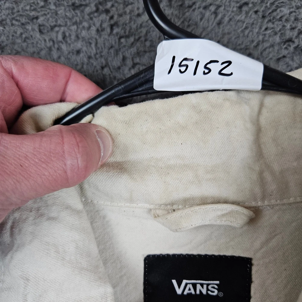 Type: Jacket Style: Military Jacket Outer Shell Material: Cotton Department: Men Closure: Button, Snap Fabric Type: Canvas Occasion: Casual, Workwear Performance/Activity: Skateboarding Accents: Embroidered, Button, Logo Collar Style: Point Country of Origin: Bangladesh Features: Pockets, Collared Fit: Regular Keywords: Vans jacket, Chore coat, Workwear, Men's outerwear, Beige jacket, Button up, Casual, Streetwear, Utility jacket, Durable, Fashion, X Large