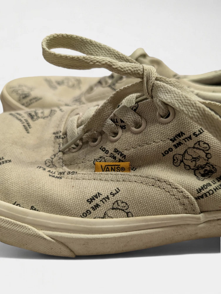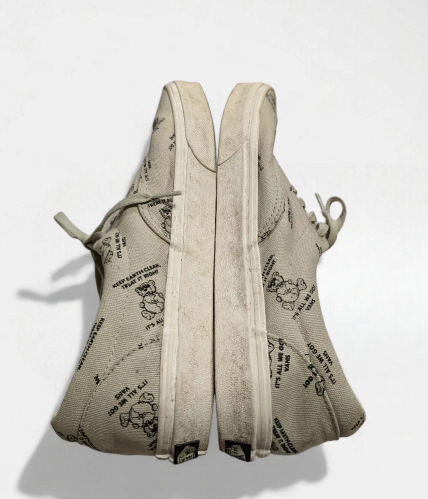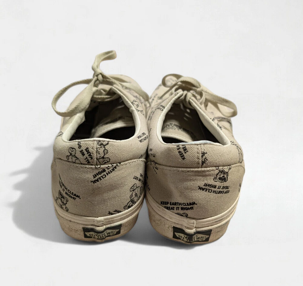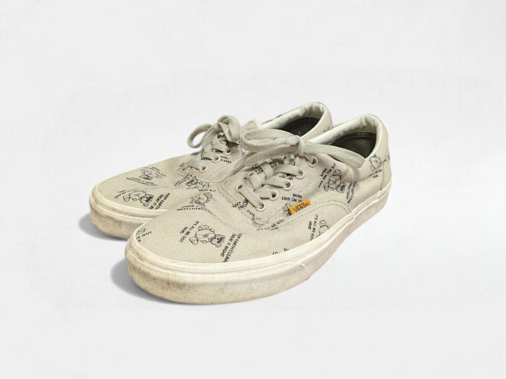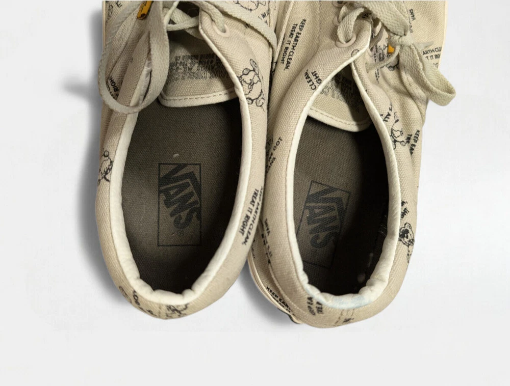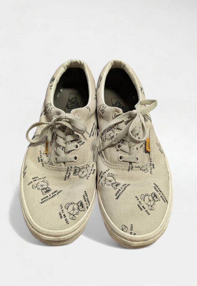 Elevate your style with these Vans Era shoes in a natural beige colorway. Featuring a lace-up closure and low-top shaft, these sneakers are perfect for any occasion from casual wear to workwear. The canvas upper material is adorned with Vans World Code graphics and the iconic oatmeal marsh design, paying homage to the brand's hippie and preppy roots. These shoes are not just stylish, but also functional with a medium (D, M) shoe width and cushioned insole for comfort. The rubber outsole ensures durability for gym and training activities, walking, yoga, and even driving and skateboarding. With a product line of Vans Era, these shoes are a must-have for any sneaker enthusiast who values nature and environmental awareness.