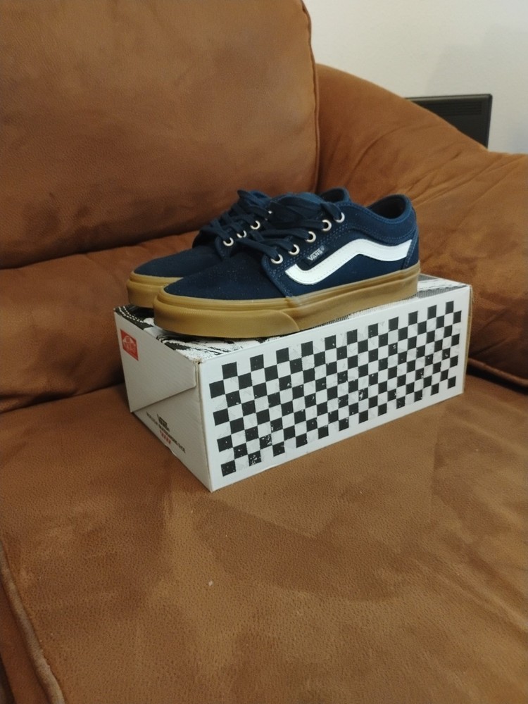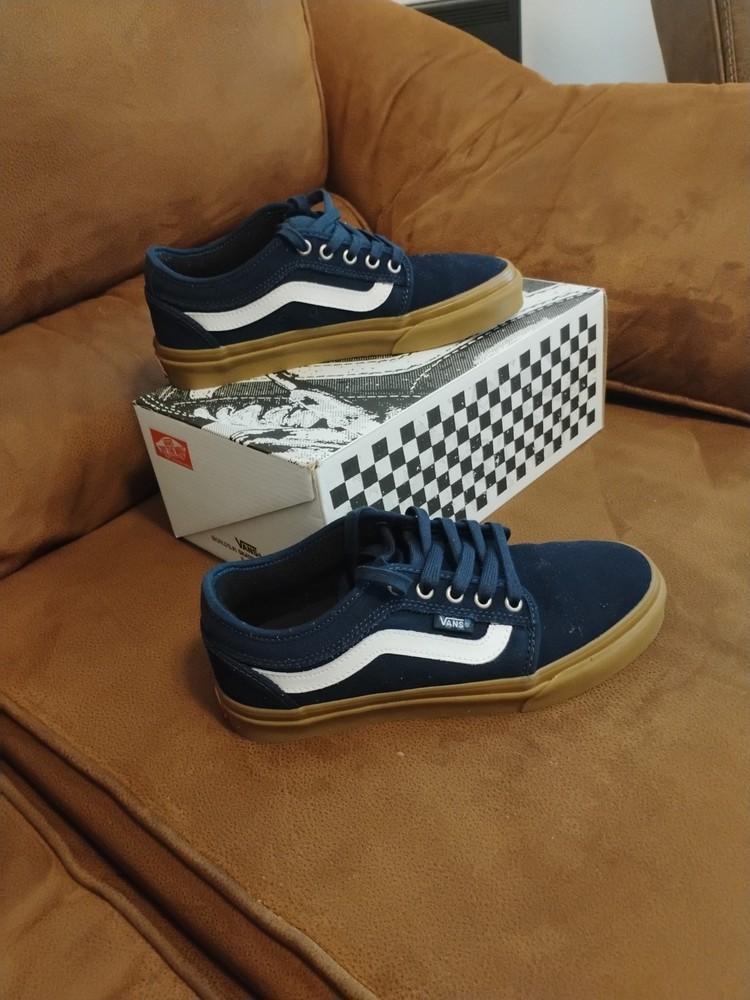 The Vans Low Chuka Navy Blue sneakers are brand new with box only worn for about 5 minutes and these are a stylish and comfortable choice for men looking for athletic shoes. With a low top design and a classic sneaker style, these shoes are perfect for everyday wear or athletic activities. The navy blue color adds a touch of personality to any outfit, while the Vans brand ensures quality and durability. These sneakers in size 6.5 provide a great blend of style and functionality for the modern man.