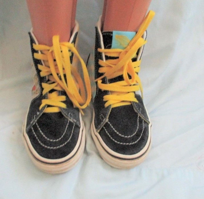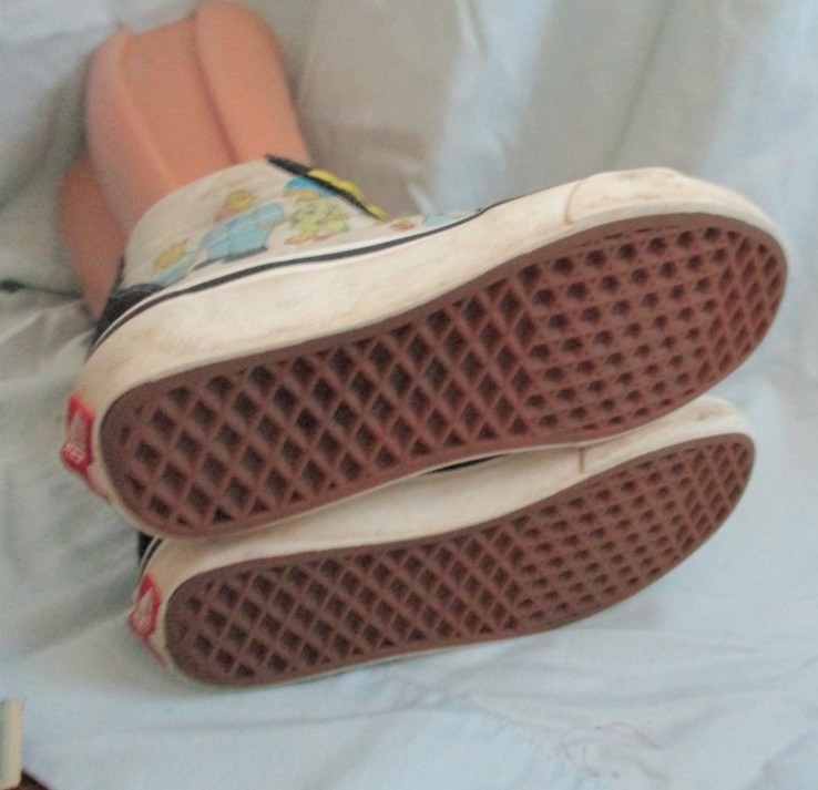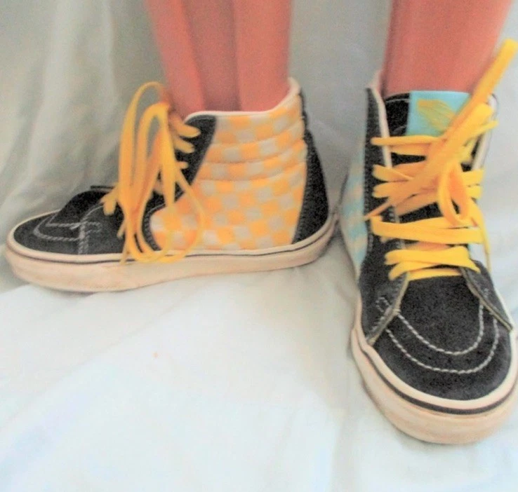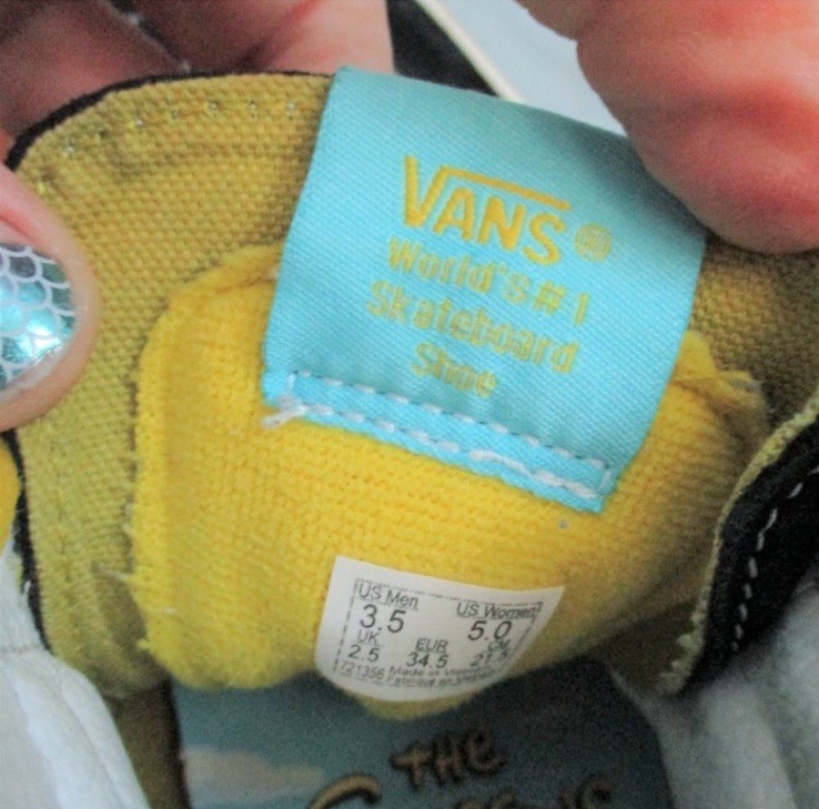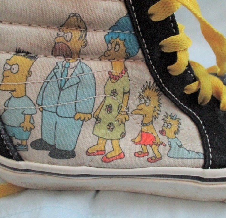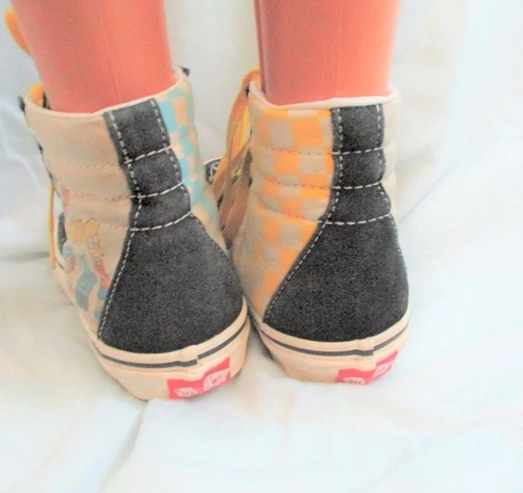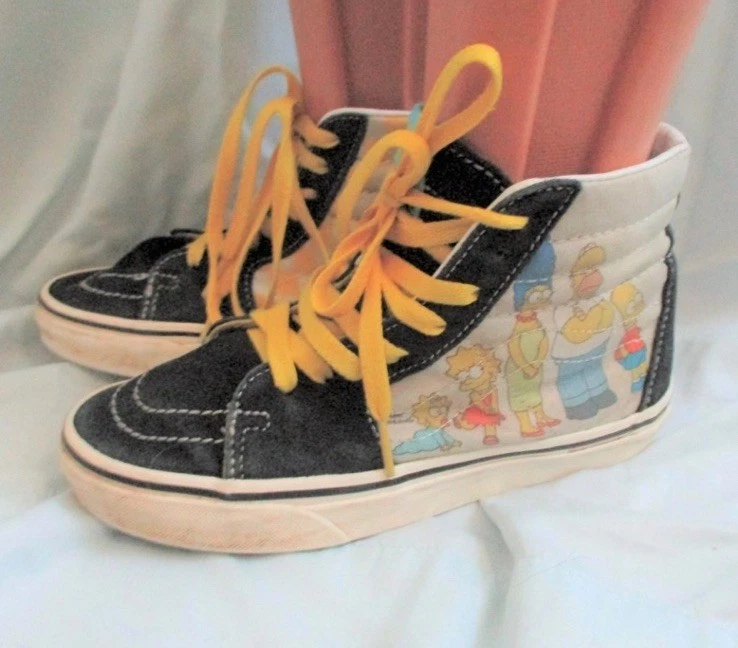 The Vans Exclusive Simpsons Edition Boys High Top Sneaker Shoes in size 3.5Y are a limited edition pair of athletic shoes designed for boys who love cartoons and TV characters. Featuring a high top style with a geometric pattern in yellow suede fabric, these sneakers are perfect for casual or activewear occasions. The lace accents and logo detailing add to the fun, while the moderate cushioning level offers comfort for various activities like skateboarding. These Vans shoes are a stylish and unique addition to any young boy's wardrobe, showcasing the iconic Off The Wall model with a playful cartoon theme.