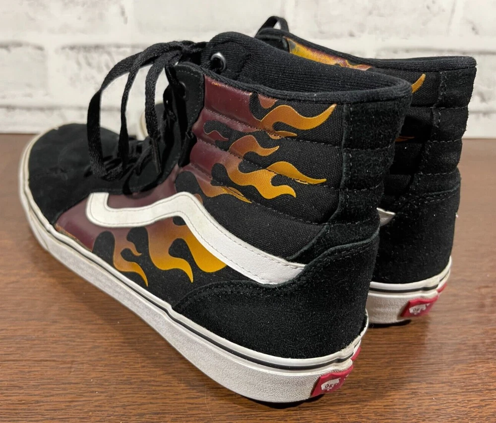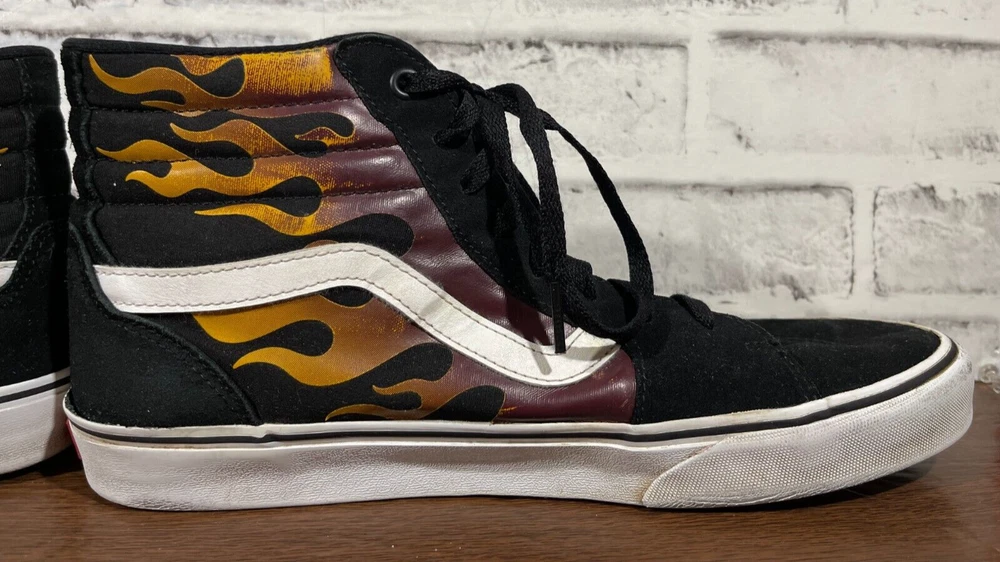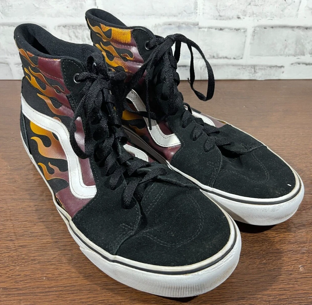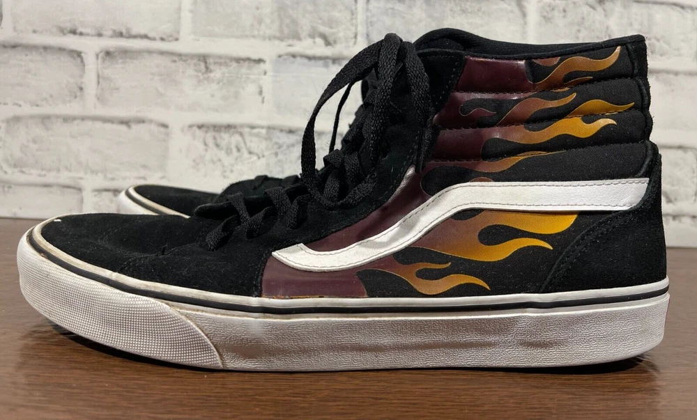 Vans Old School Sneakers in Men's size 11 feature a black suede upper with flame design, lace-up closure, high-top shaft style, rubber outsole, and cushioned, breathable comfort. The classic retro style is perfect for activewear, casual, or workwear use. Ideal for winter, summer, fall, or spring seasons, these VANS sneakers are a colorful addition to any wardrobe. Very good preowned condition with normal preowned wear and no issue. Please see all photos. For clothing specifically, see photos for all measurements and/or any issues if applicable. Pay close attention to the measurements as the size of the garment may quite possibly be different than the actual measurement(s) due to washing, shrinkage, or stretching as these are used clothes. The size in the title is the size on the tag of the garment. See photos for measurements of actual measurements as they may differ. ALWAYS CHECK THE MEASUREMENTS IN THE PHOTOS. This will remove any questions on measurements as well as always cover the possibility of human error in the listing(s) in the case of a typo or oversight. All clothing and shoes have been washed/cleaned, and comes from a smoke free environment. If shoe trees appear in the photos, they are for photography purposes only to illustrate how the shoes look filled out, and are not included. I am available for questions. I accept or negotiate reasonable offers. Have an amazing day. Thank you.