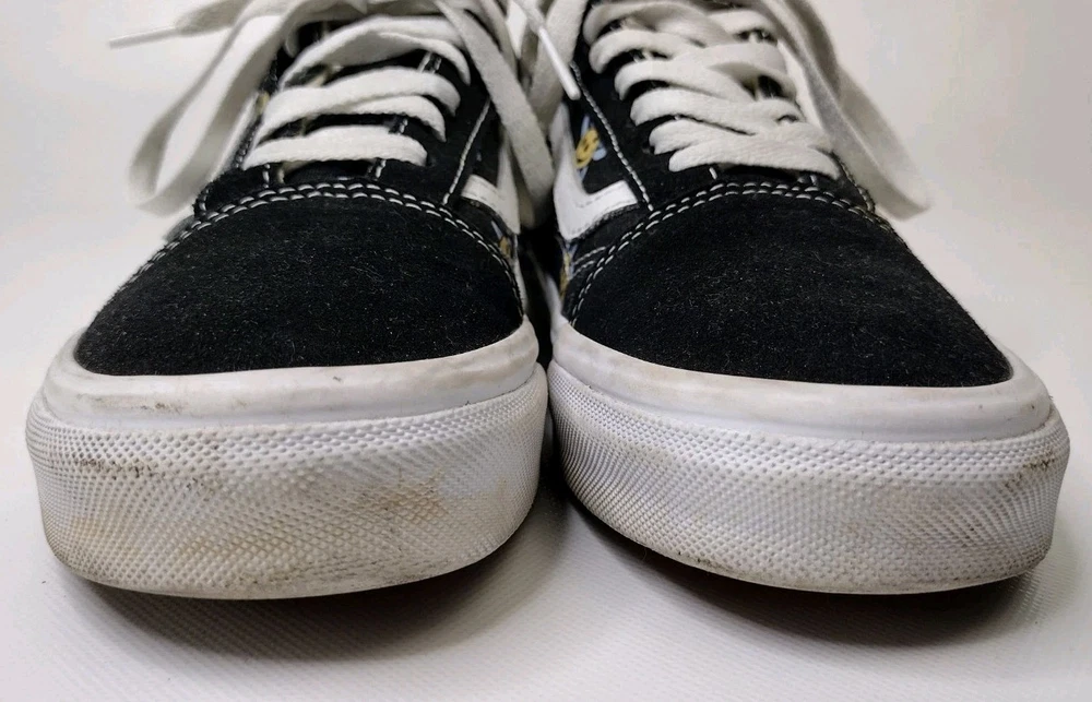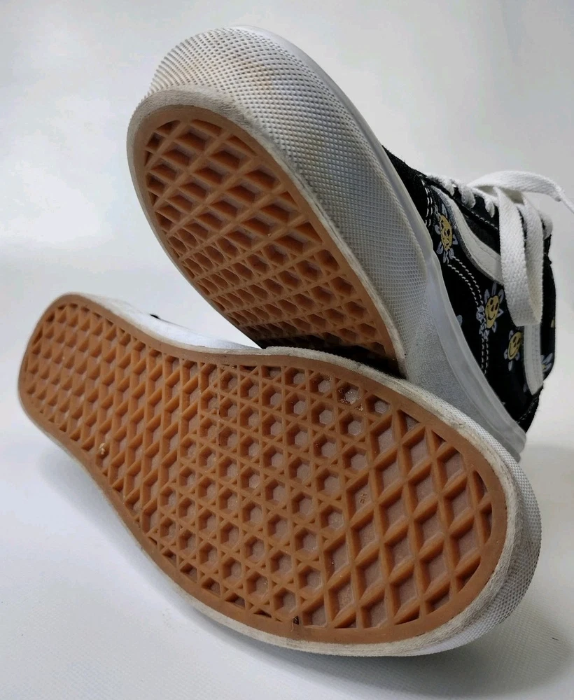 The Vans Old Skool Trippy Grin Floral Black Skate Sneakers in unisex size 7 (Mens 5.5) are a stylish and colorful option for athletic activities. Featuring a lace-up closure, low-top shoe shaft style, and standard shoe width, these sneakers are designed for walking, school, and skateboarding. The black color with toning and a colorblock pattern adds a unique touch, while the suede upper material and canvas lining ensure durability and comfort. Made by VANS in Vietnam, these sneakers are part of the Vans Old Skool product line, perfect for those looking for a blend of performance and style in their footwear.