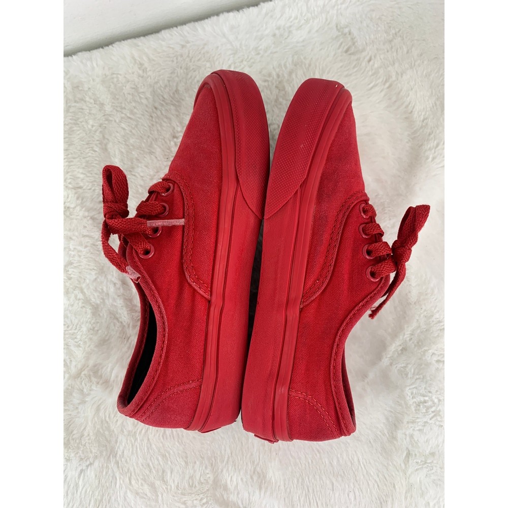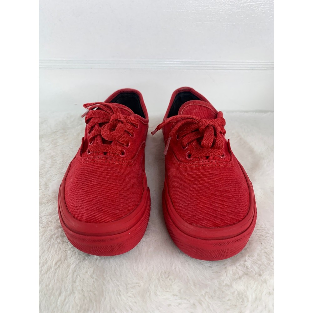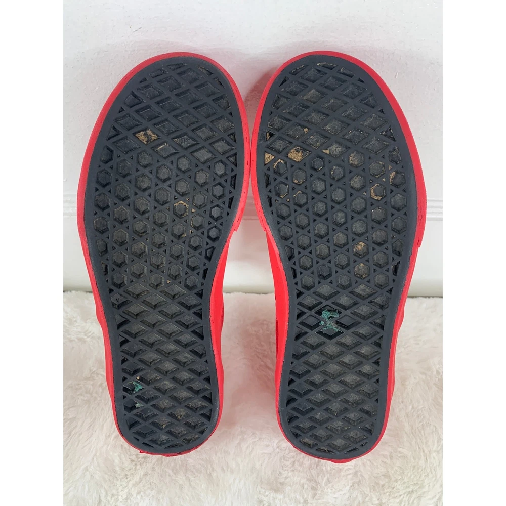Vans classic low-top skate shoes for kids in vibrant red canvas, size 2. Durable with a rubber waffle sole for grip and comfort, perfect for everyday wear and skating. These are USED with some light wear visible; please see photos for condition details. Refer to all photos for the most accurate representation of the item’s condition.