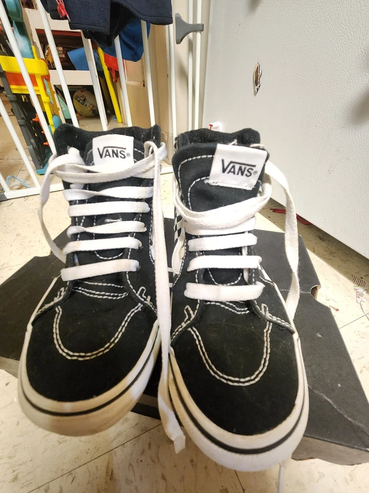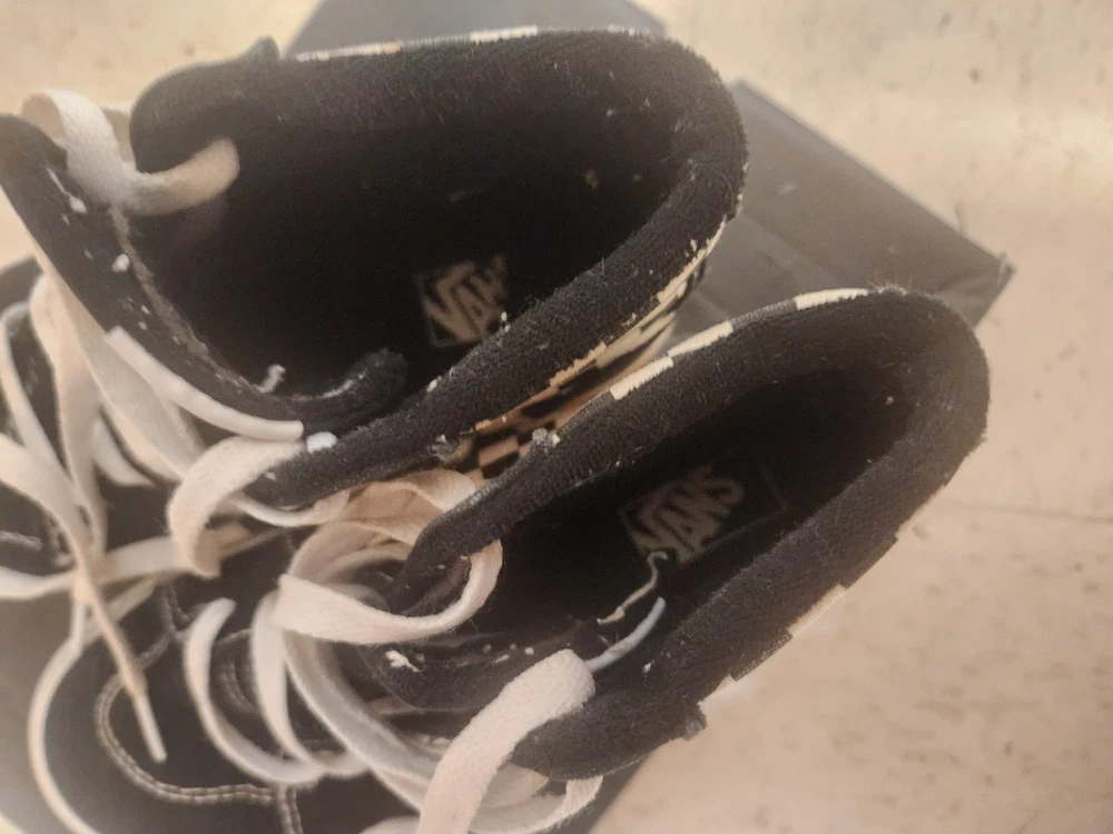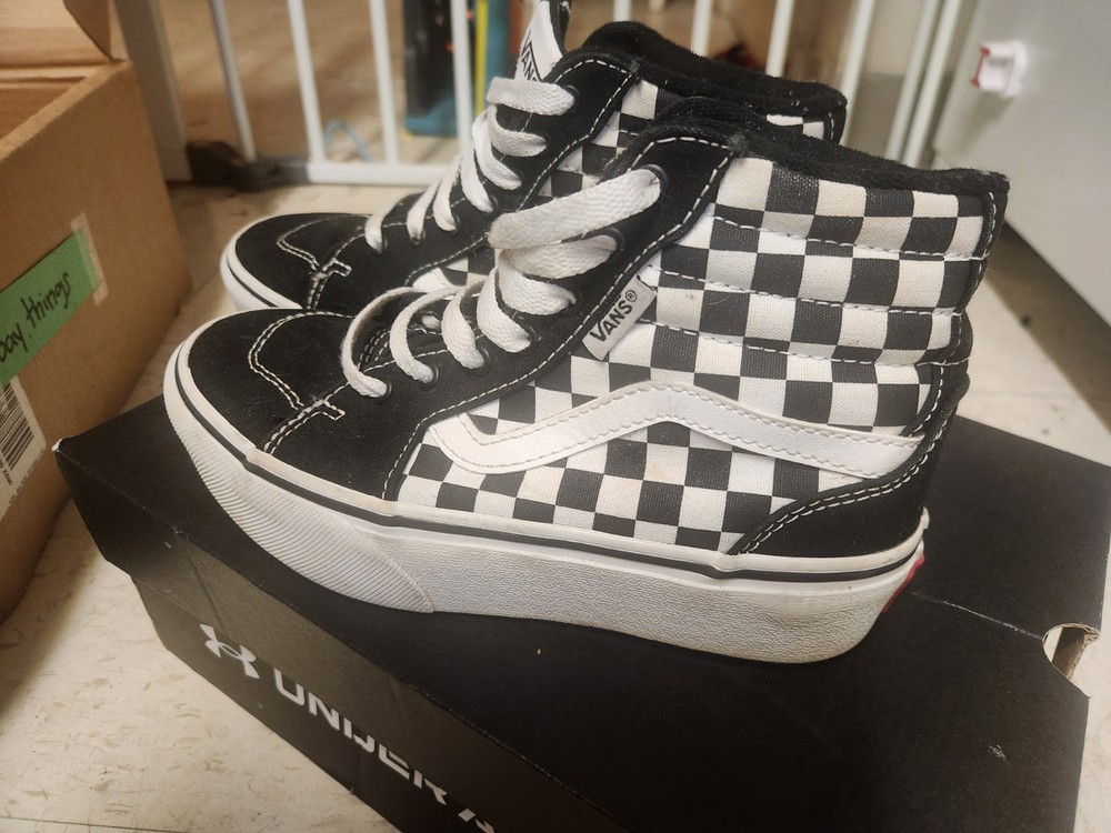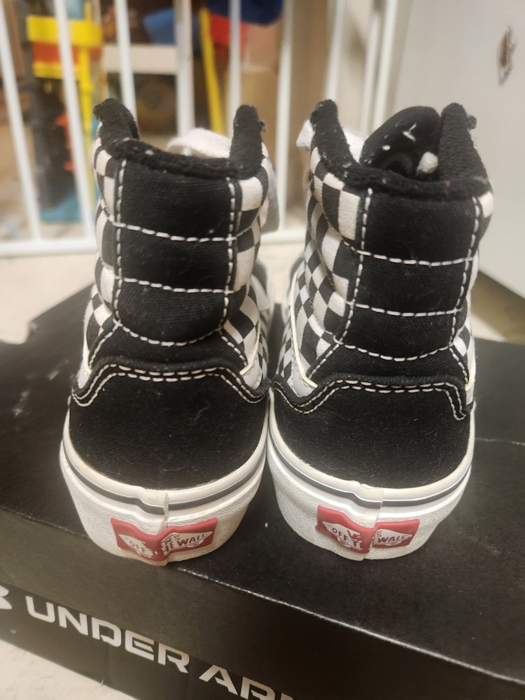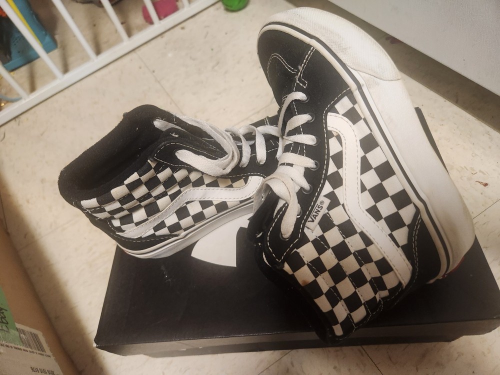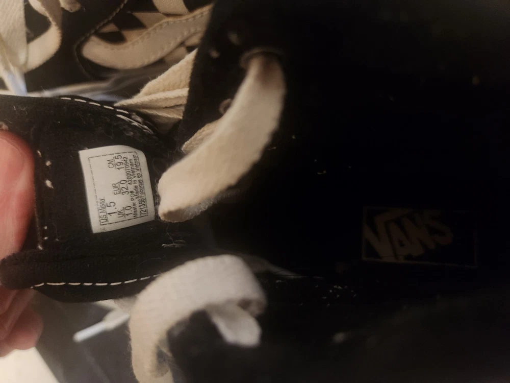 The product is a pair of Vans SK8-Hi Checkerboard Black White Classic High Top Sneakers in size 1.5. These iconic sneakers feature a classic high top style with a check pattern in black and white, making them a versatile and stylish choice for both boys and girls. The Vans Checkerboard product line adds a timeless touch to the unisex kids' shoes, providing a comfortable and trendy option for everyday wear.