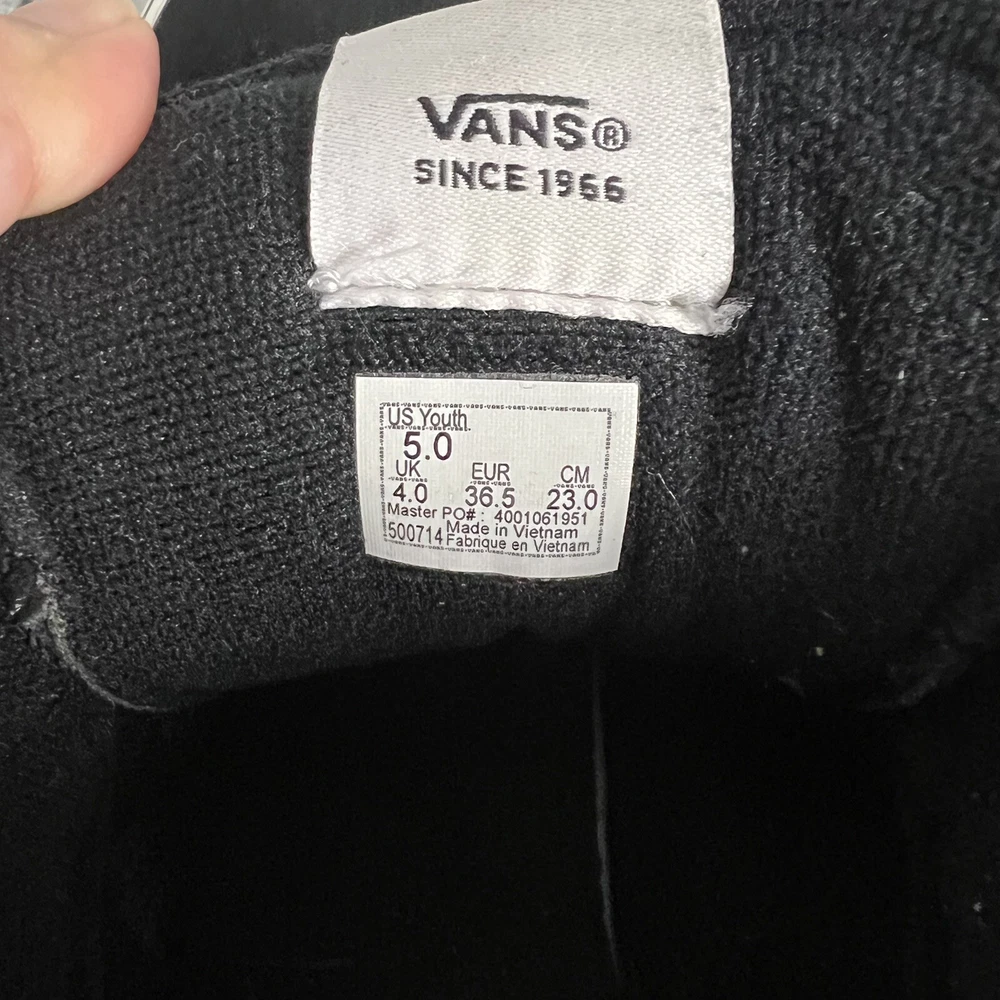 Department: Men Toe Shape: Round Toe Fabric Type: Canvas Brand: Vans Off The Wall Season: Spring, Summer, Winter, Fall Type: Casual Theme: School Country/Region of Manufacture: Vietnam Product Line: VANS Sk8-Hi Model: VANS Off The Wall Color: Black Style: Sneaker Closure: Lace Up Pattern: Solid Shoe Width: Standard US Shoe Size: 5 Upper Material: Canvas