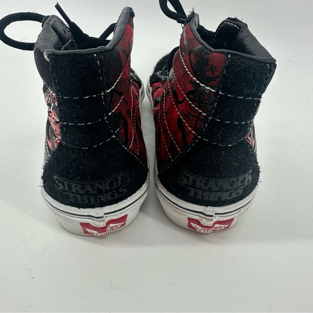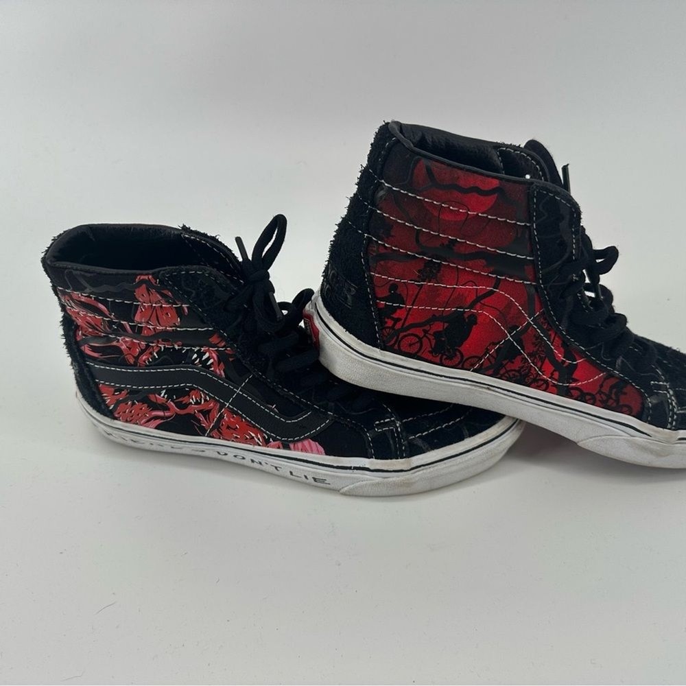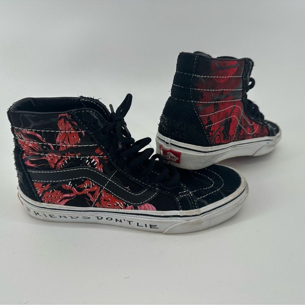 Vans Stranger Things × Sk8-Hi Reissue 'Upside Down' Unisex Shoes Perfect shoe for all stranger things fans. Womens size 6.5. Men’s size 5 Novelty print “friends don’t lie” Worn a few times, still in good Condition with a lot of life left in them Step into the Upside Down with these limited-edition Vans Sk8-Hi Reissue sneakers from the official Stranger Things Season 4 collection. Featuring a distressed black and red aesthetic with the iconic "Friends Don't Lie" quote on the sidewall and Demogorgon graphics, these high-tops are the ultimate footwear for any Hellfire Club member. Designed with a supportive padded collar and signature waffle outsole, they offer both Hawkins-approved style and everyday comfort. Pair these with ripped black denim and a vintage band tee for a rebellious 80s look, or style them with cargo joggers and a hoodie to channel your inner Max Mayfield Netflix Shop, 80s, Retro, fandom, casual