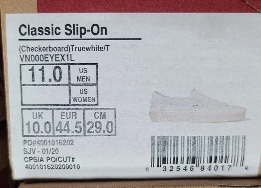 Item available today is the, Vans VN000EYE Classic Slip On White Checkered Shoes Men's SZ 11 . This is a new pair of shoes, ready to wear . Please see photos for more details. Items in photos are what come with the listing. Thank you for shopping small business. There are other sizes available in our store. Terms of Sale Listing is for item and/or accessories shown in photos only. Some states may require a tax be charged at the time of checkout, this is eBay automated. We ship and answer questions Mon-Fri 8am-4pm EST We stand behind our products and would be happy to assist you if you experience an issue. Please contact us first. We ship to your confirmed PayPal address only using UPS or USPS. Items over $200 may require signature upon delivery. There are no returns on items sold for parts. A RESTOCK FEE UP TO 20% MAY BE CHARGED FOR RETURNS THAT ARE NOT OF FAULT OF THE SELLER OR ITEMS NOT RETURNED IN THE SAME CONDITION. Thank you for shopping small business! Shipping Information Only ships within the Continental United States with one business day processing time. 11/19/2024 (, ADN) I-108 (B)