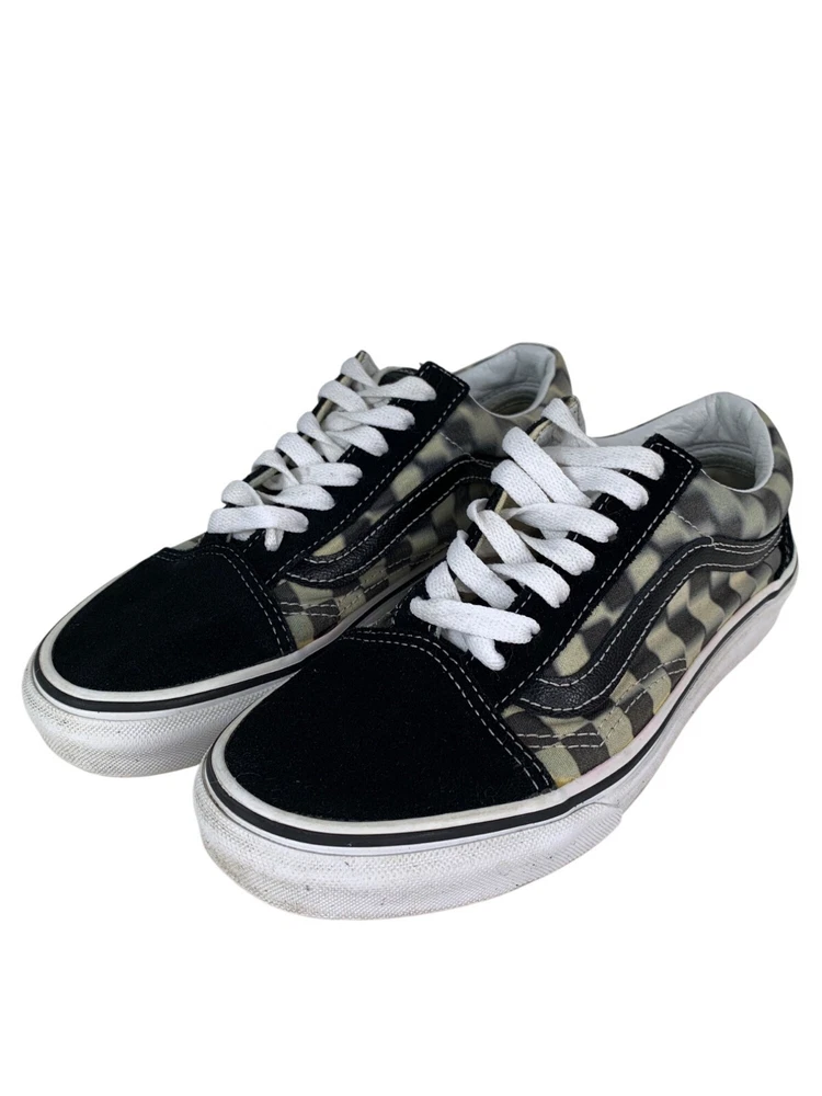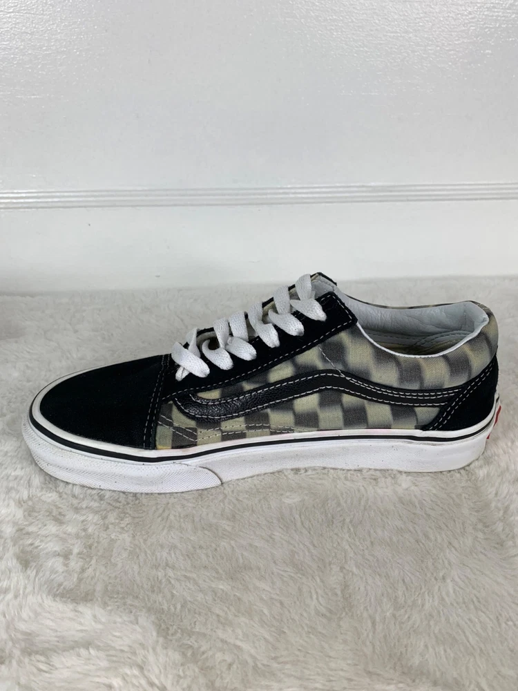 The Vans Women's Old Skool sneakers feature a striking checkerboard design paired with classic black accents. These sneakers are built for style and comfort, making them ideal for both casual outings and active days. The durable construction and timeless design ensure they remain a staple in any wardrobe. • Lace-up closure • Checkerboard pattern • Rubber sole • Padded collar • Canvas and suede materials Slight wear on soles, otherwise in good condition.