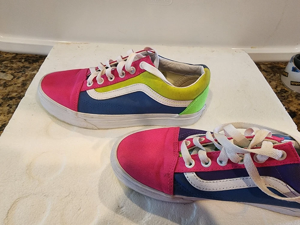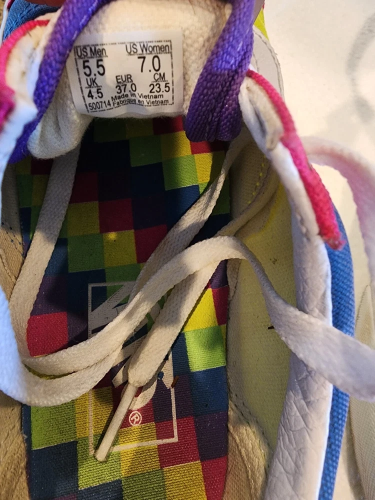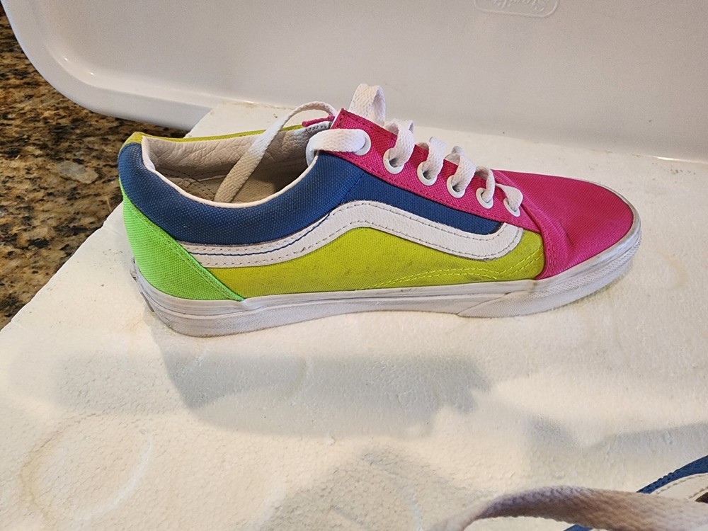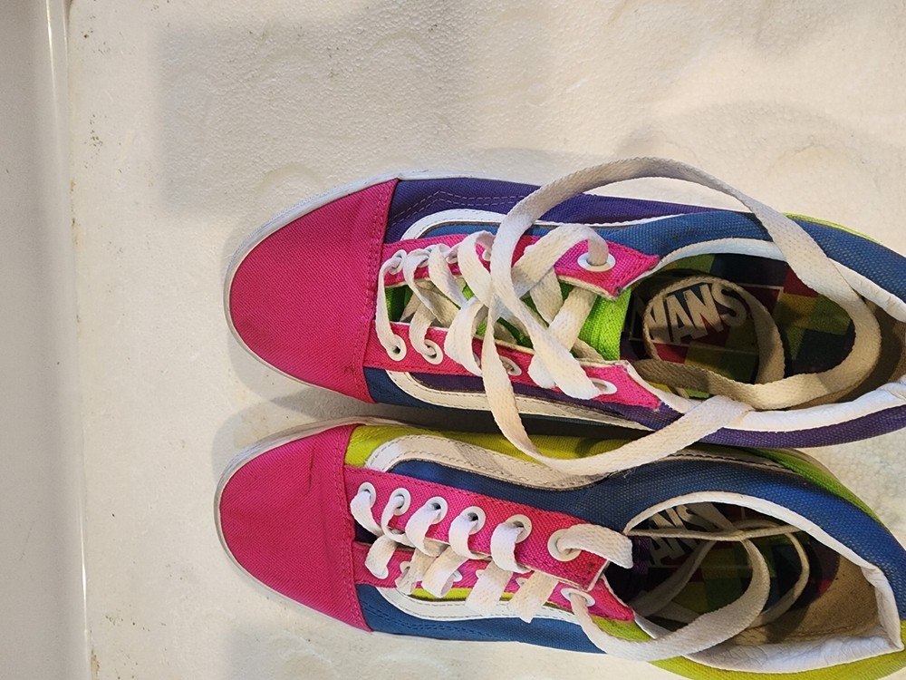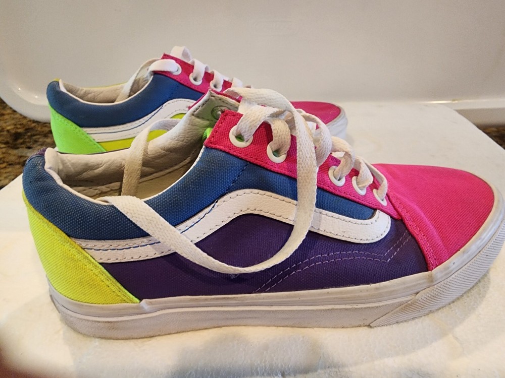The product is a pair of Vans unisex athletic shoes in a size 5.5. These multicolor sneakers feature a classic Vans style, perfect for both men and women. The shoes are not customized and are ideal for a casual, comfortable athletic look. Perfect for everyday wear or for hitting the gym, these Vans shoes offer a trendy and versatile option for footwear.
