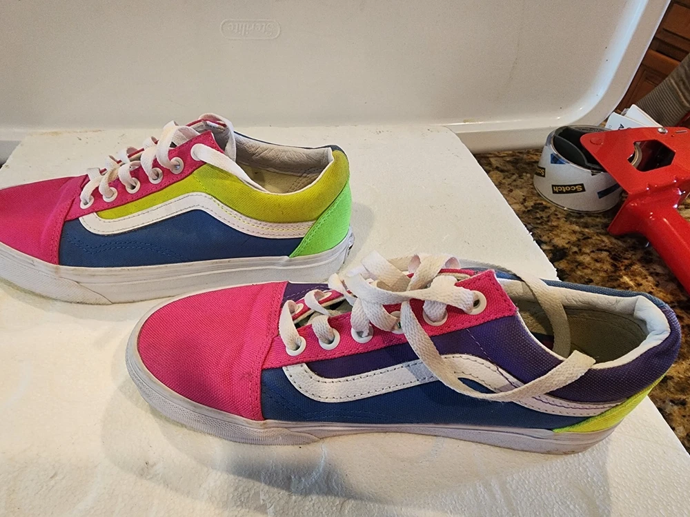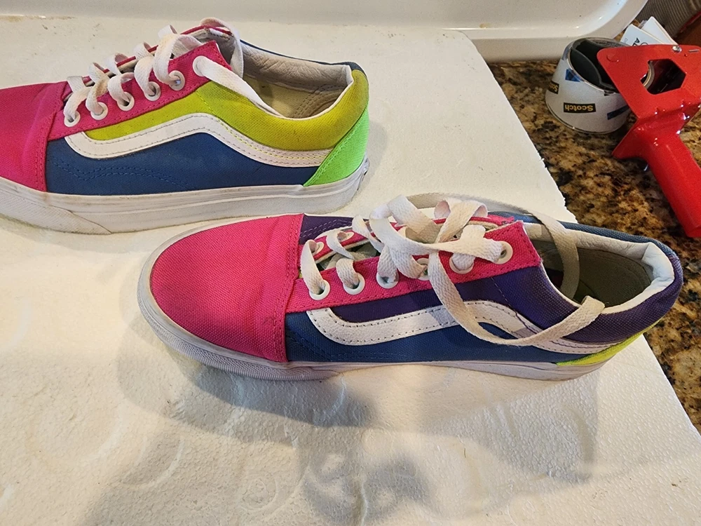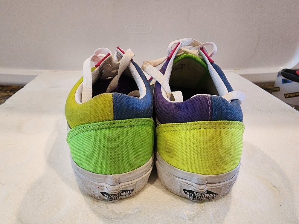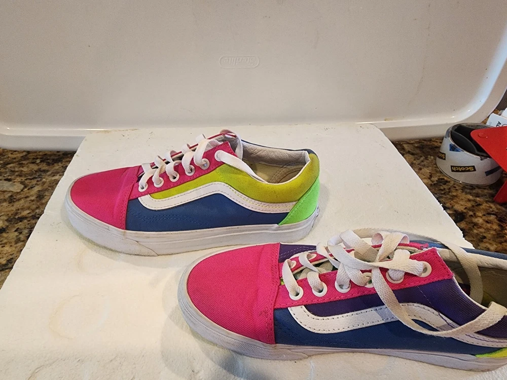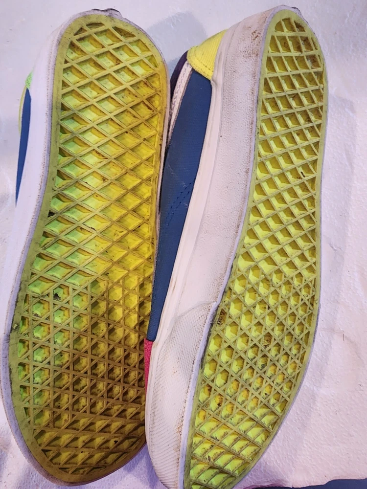 The product is a pair of Vans unisex athletic shoes in a size 5.5. These multicolor sneakers feature a classic Vans style, perfect for both men and women. The shoes are not customized and are ideal for a casual, comfortable athletic look. Perfect for everyday wear or for hitting the gym, these Vans shoes offer a trendy and versatile option for footwear.