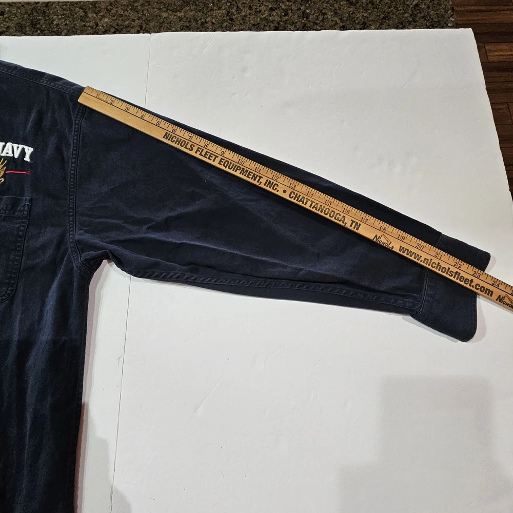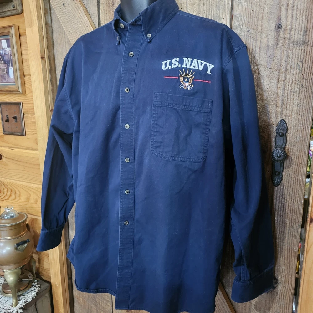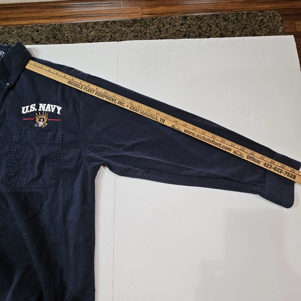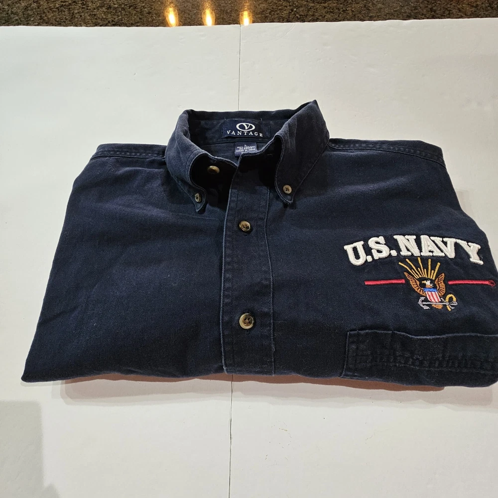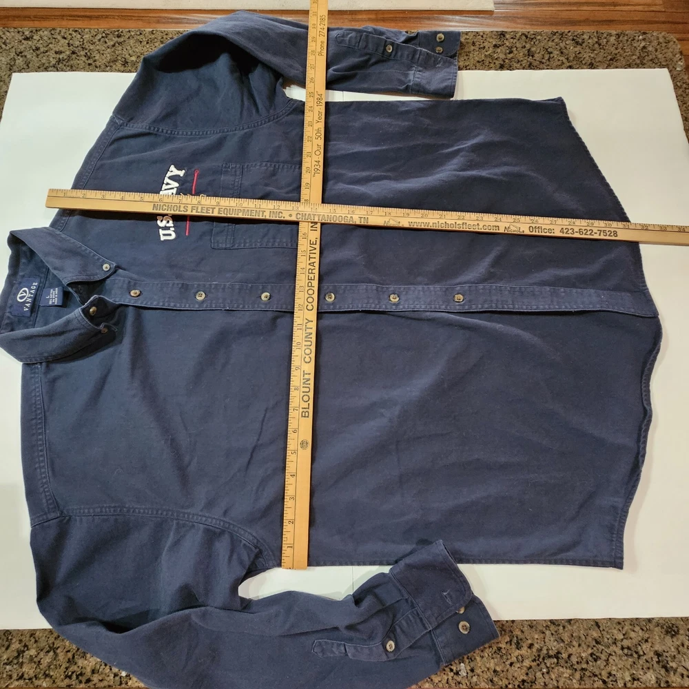 Vantage US Navy Mens Large Blue Long Sleeve Button-Down Woven Shirt EUC Chest-24.75" across pit to pit Length-26"-31.5" (side seams to middle of shirt) Sleeve length from neck-30.5" Sleeve length from shoulder seam-23.25"