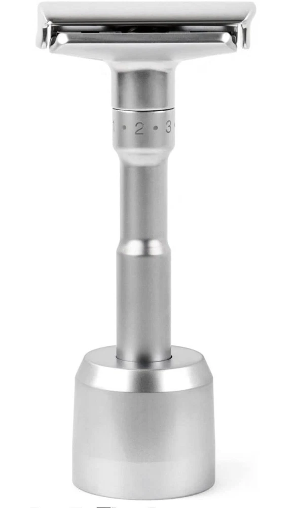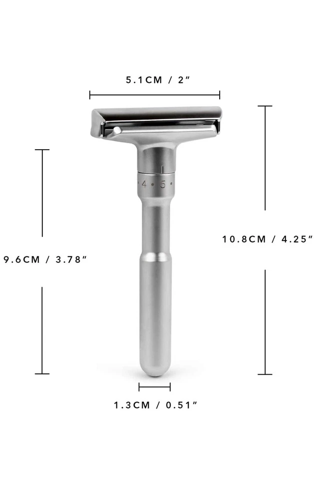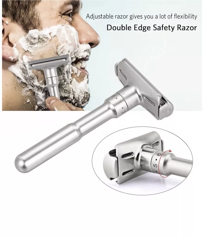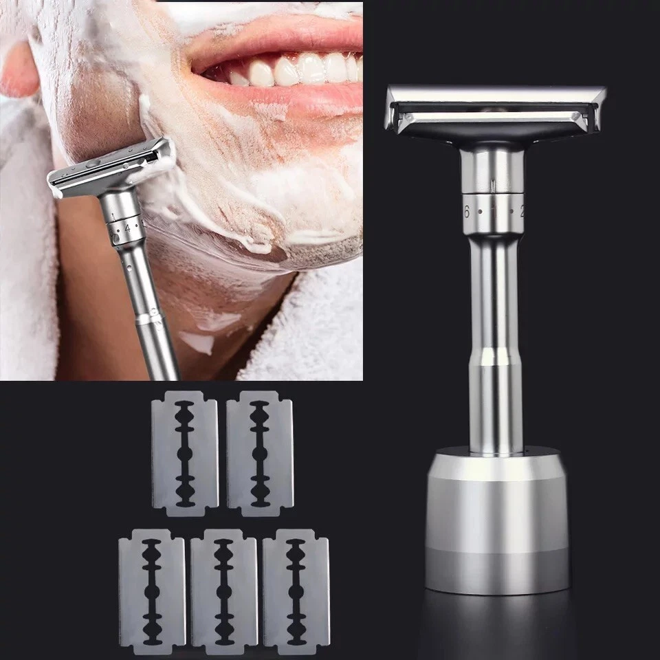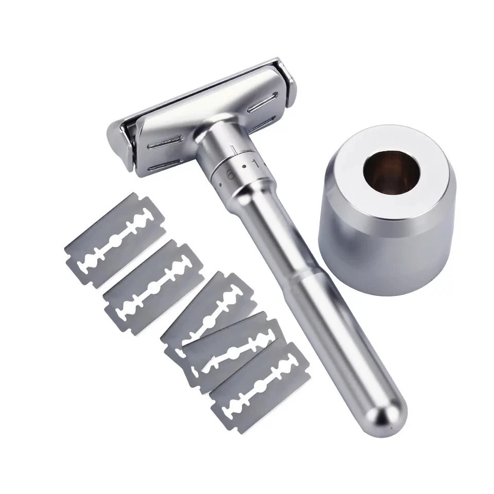 Shave Classic Adjustable Double Edge Safety Razor. Condition is "New". Shipped with USPS First Class. This adjustable razor gives you a lot of flexibility in terms of how you want it aggressive. If you want a relax shave, use it at a low setting. If you want take off three-day-stubble with ease, use it at medium or high setting. Caution: When you are adjusting the aggressiveness, please do so with dry hands. Always hold it on the sides of the head away from the sharp edges. Design and Quality Modern aesthetics and design with excellent craftsmanship Comes in brushed chrome satin. A truely beauty to behold The weight of the safety razor is very well distributed, allows you to pretty much let it do most of the work Long handle (4 inches) is great for men with large hands Easy Blade Change Unlike other razors that use a screw to hold the blade in place, this razor uses a clip. This design makes it easy to change the blade. Pop off the top plate with your thumb. Load the blade on the razor Pop the top plate back in place. Caution: When you are changing the blade, please do so with dry hands. Always hold it on the sides of the head away from the sharp edges. Leather Features & details Designed Adjustable Handle to set blade exposure levels from 1 to 6 High quality stand made by aluminum alloy, polished finish Package includes: 1 pc Razor, 1pc Stand, 1pc Genuine leather & 5 pcs Titanium coated Stainless Steel blades Handle measures 3.5 in. length. Razor total dimensions are 2 L x 1 W x4.25 H. Razor weights 90g Product information Regular Handle with Stand