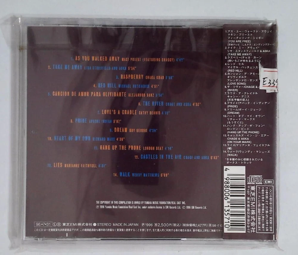 1 Maxi Priest Feat Shaggy– As You Walked Away 4:42 2 Lisa Stansfield And Ryo Aska– Take Me Away 5:34 3 Chaka Khan– Raspberry 5:00 4 Michael Hutchence– Red Hill 4:51 5 Alejandro Sanz– Cancion De Amor Para Olvidarte 5:14 6 Chage & Aska– The River 4:33 7 Cathy Dennis– Love's A Cradle 4:31 8 Apache Indian– Pride 5:07 9 Boy George– Dream 4:39 10 Richard Marx– Heart Of My Own 4:36 11 Londonbeat– Hang Up The Phone 4:14 12 Chage & Aska– Castles In The Air 6:43 13 Marianne Faithfull– Lies 4:31 14 Wendy Matthews– Walk 6:09