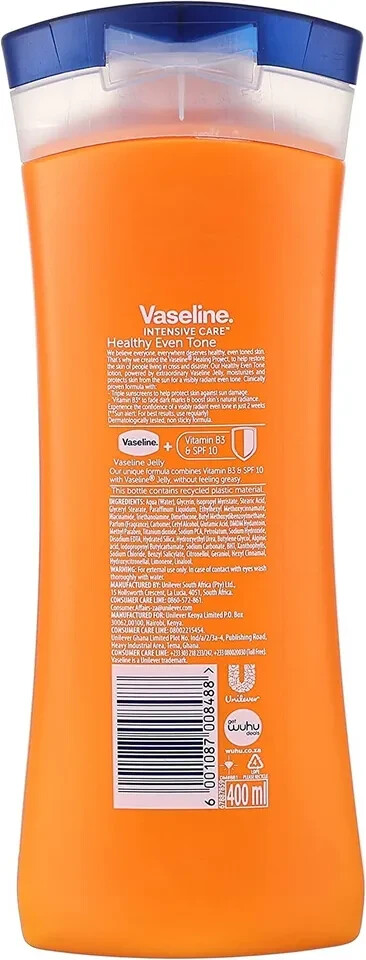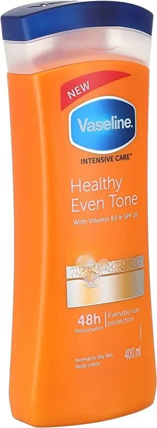 DESCRIPTION: you are buying 3packs of VASELINE INTENSIVE CARE HEALTHY TONE BODY LOTION WITH VITAMIN B3 & SPF 10 400 ML Vaseline Intensive CareEven Tone Body Lotion leaves skin feeling and looking moisturised Relieves dry skin and protects against sun damage Light, fast absorbing moisturising lotion with a non-greasy feel Vaseline's hydrating body lotion calms and soothes dry skin leaving your skin feeling moisturised Shipping fast shipping DHL 5- 10 days